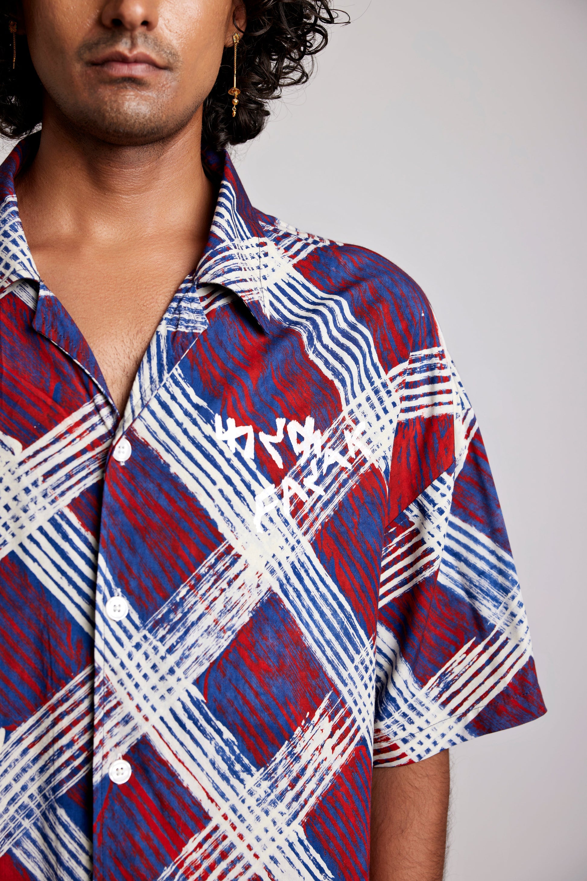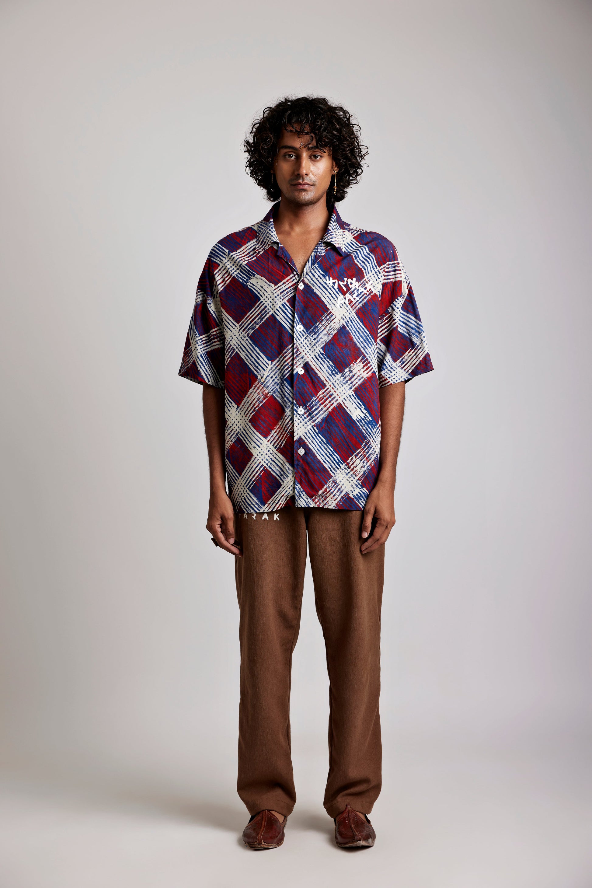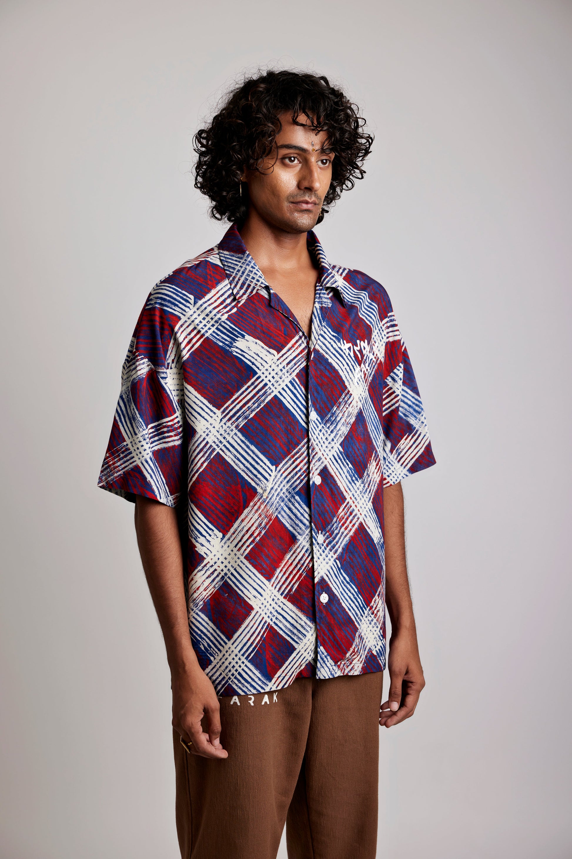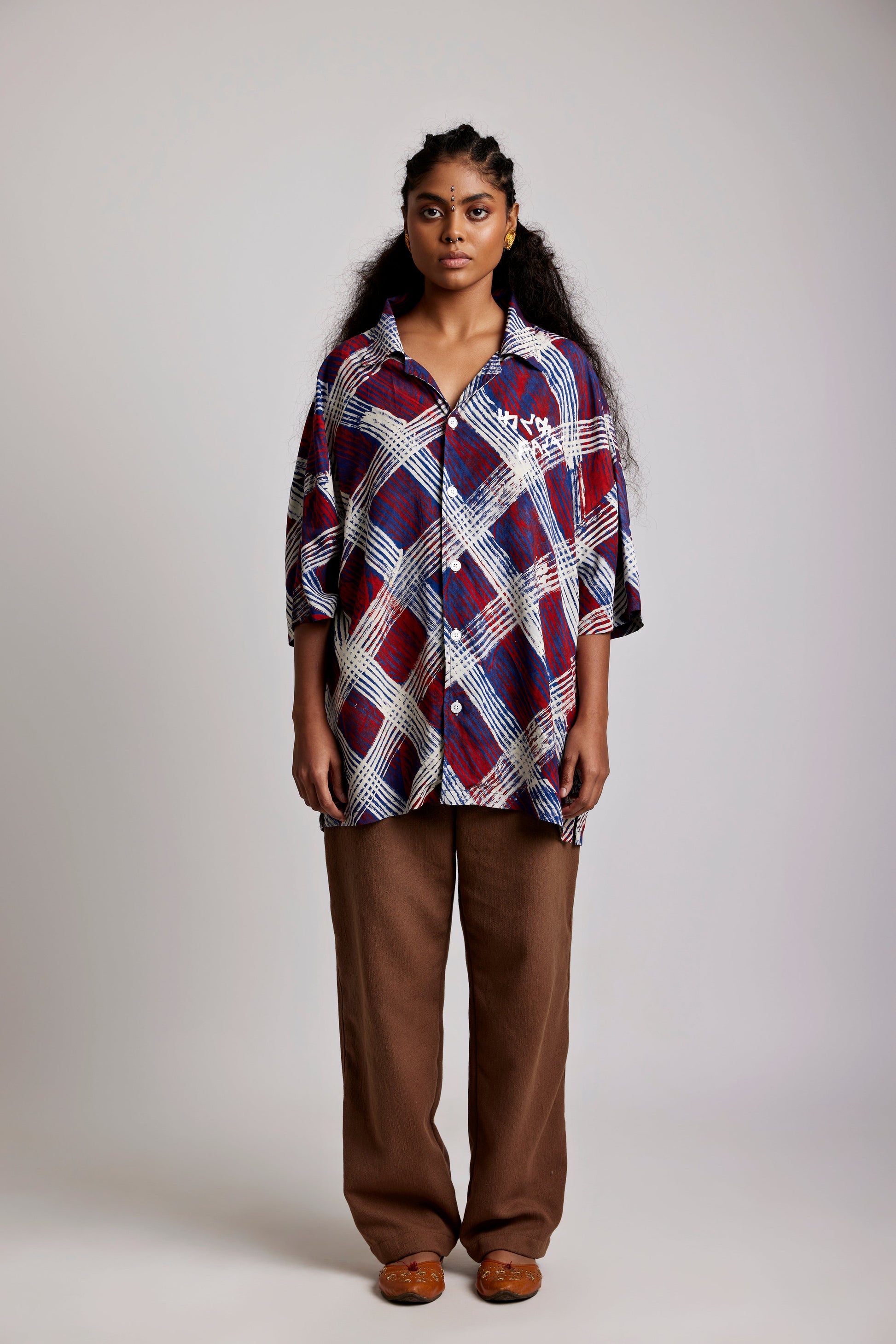 The shirt exhibits a captivating crisscross pattern adorned with a delightful fusion of red and blue hues. Crafted with meticulous attention to detail, it is made from 100% cotton, proudly originating from India. The hand-printed fabric is a creation of skilled artisans from the Chippa Community in Bagru, Rajasthan, renowned for their expertise in mud printing. Each piece is lovingly handcrafted, ensuring that no two pieces are alike, imbuing each with its distinct character and charm.