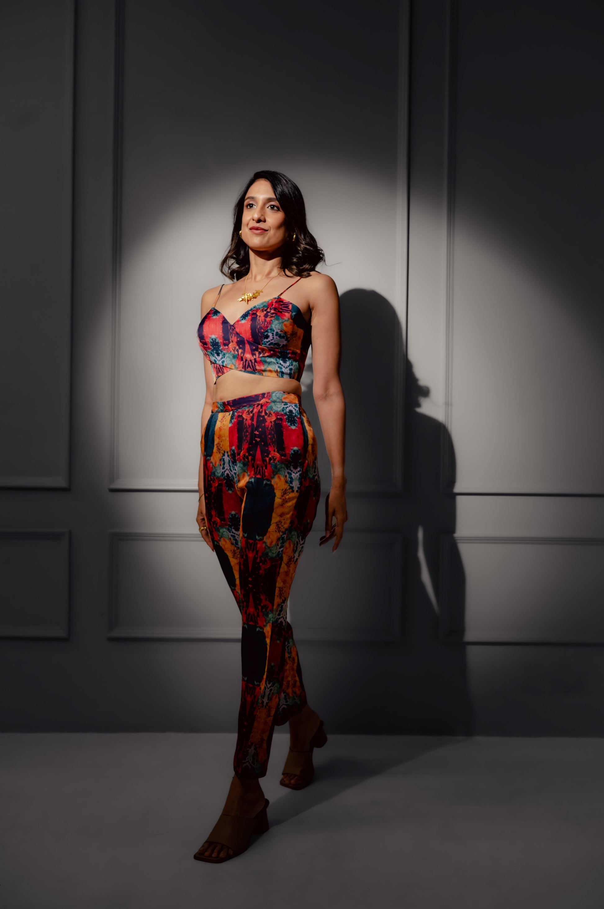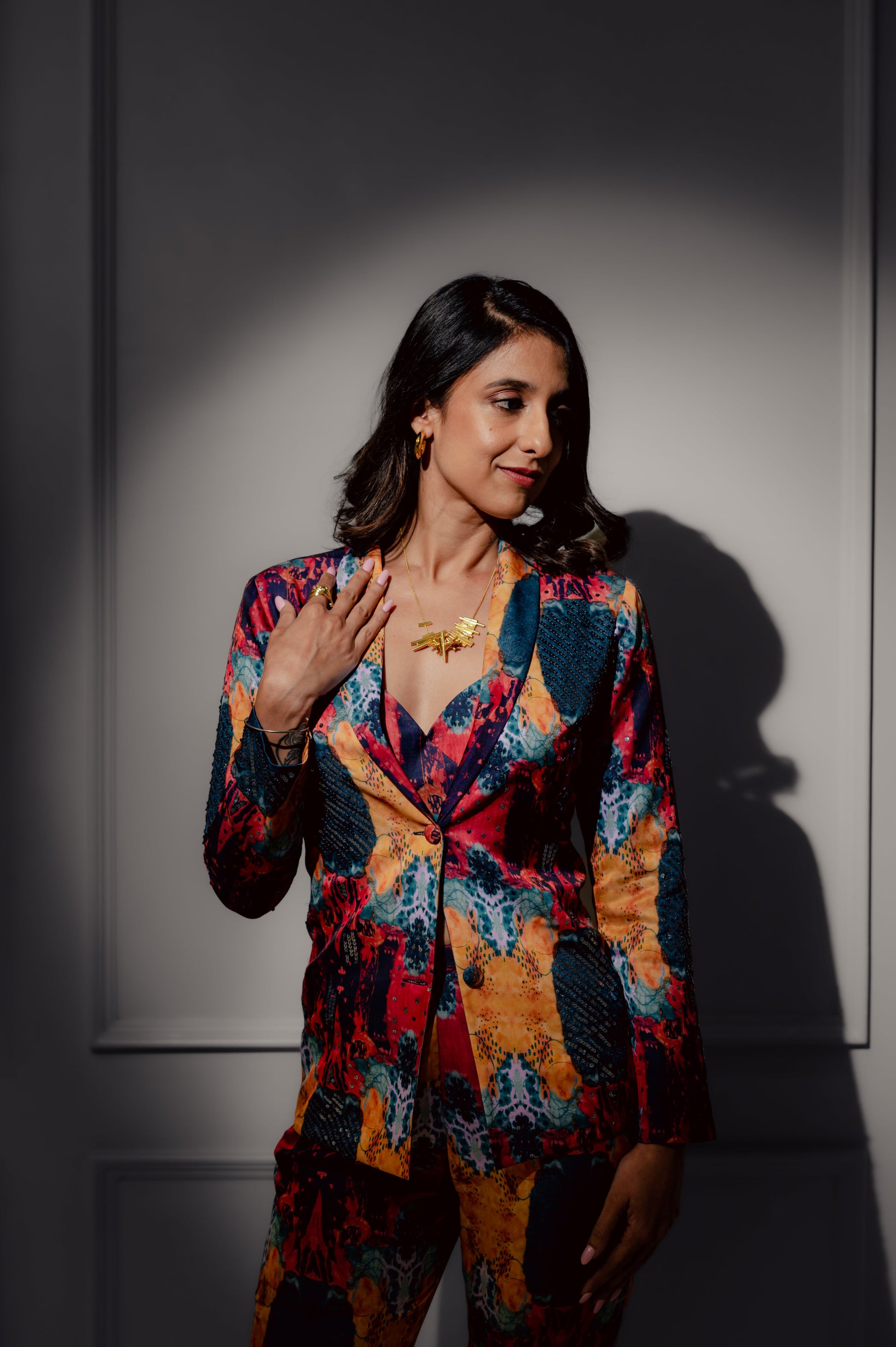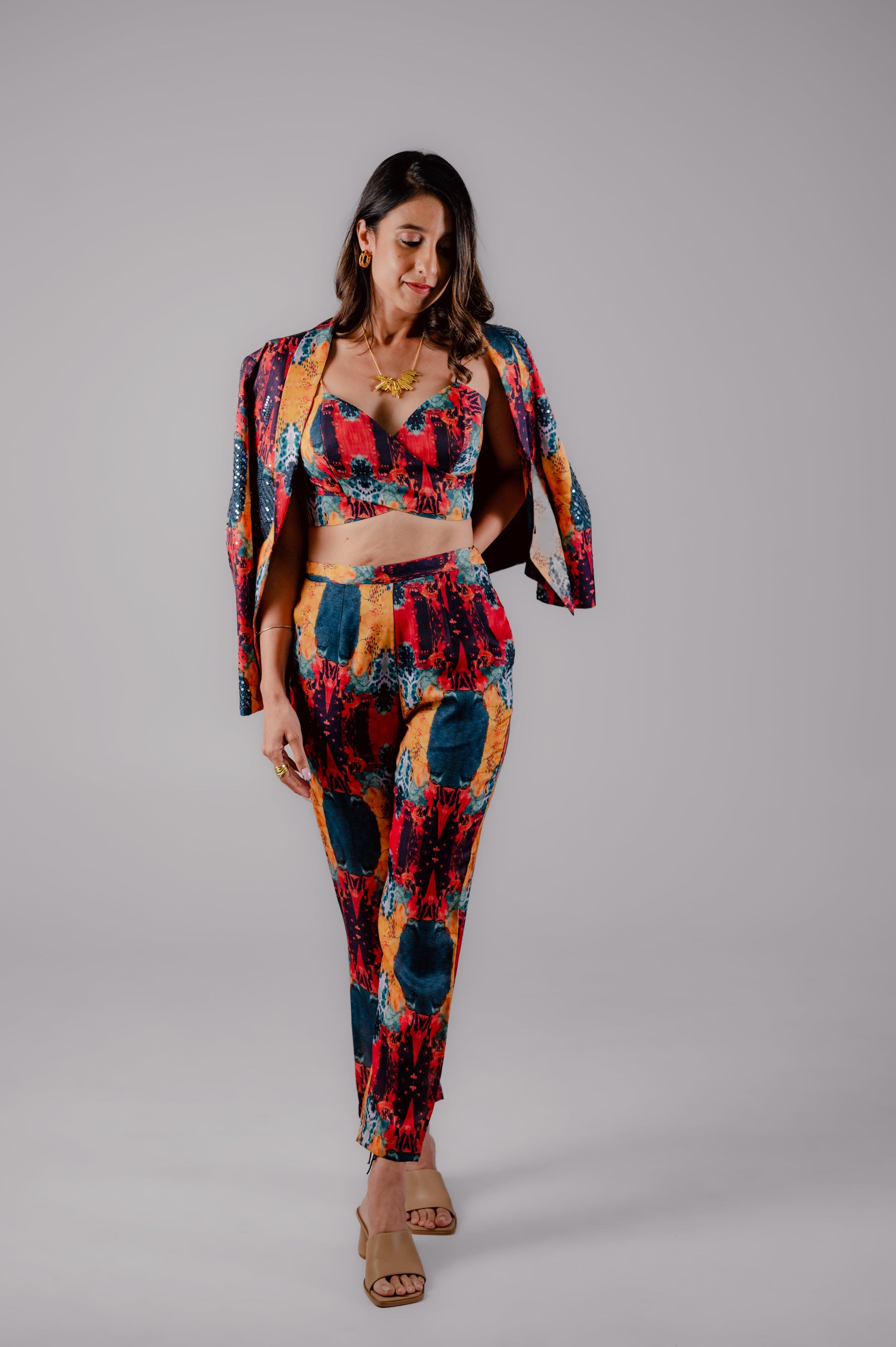 Inspired by our very old kaleidoscope prints this 3pc set sets a vibrant tone to your festive wardrobe. With highlighted embroidery this blazer & bustier look combined gives a casual yet formal look.