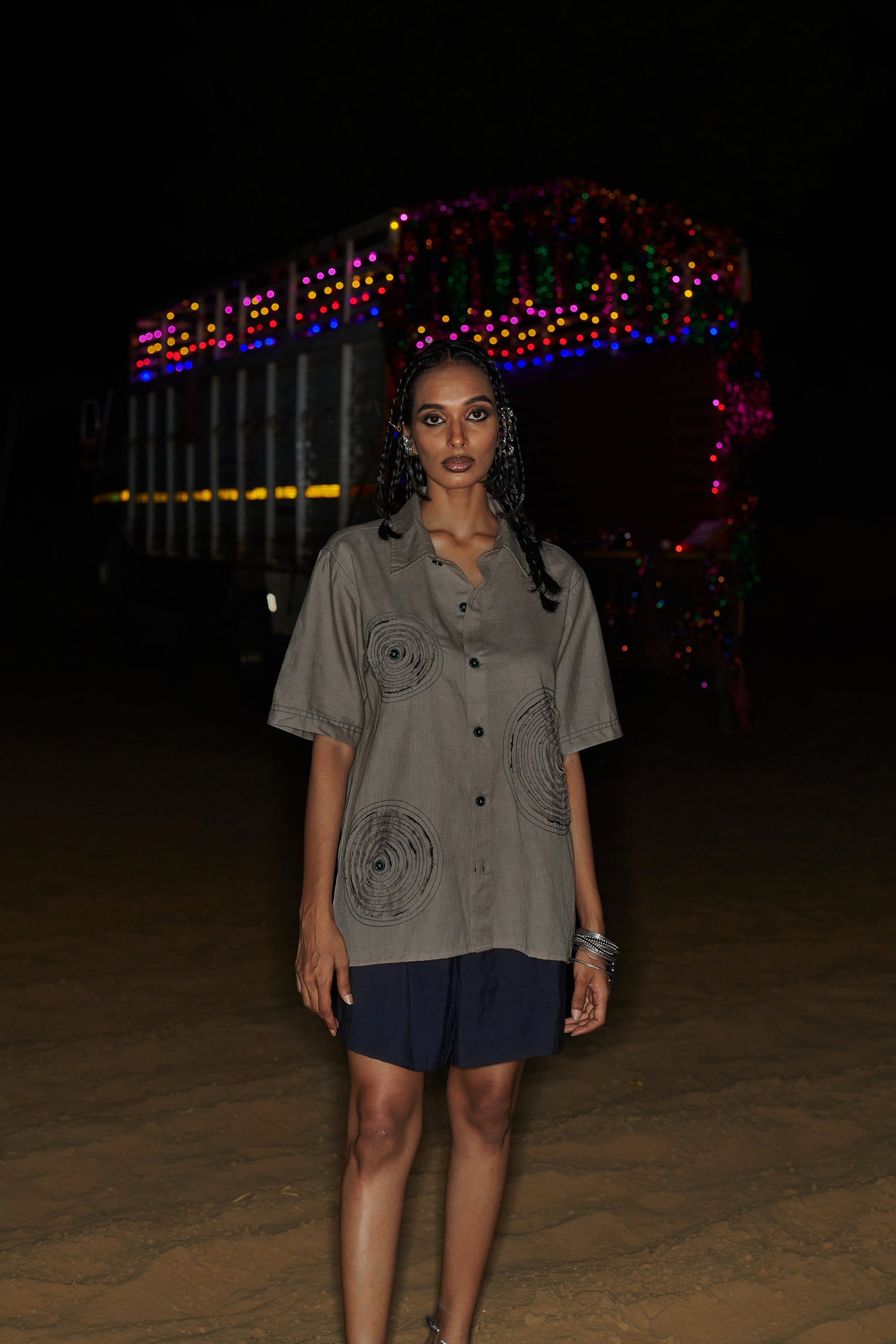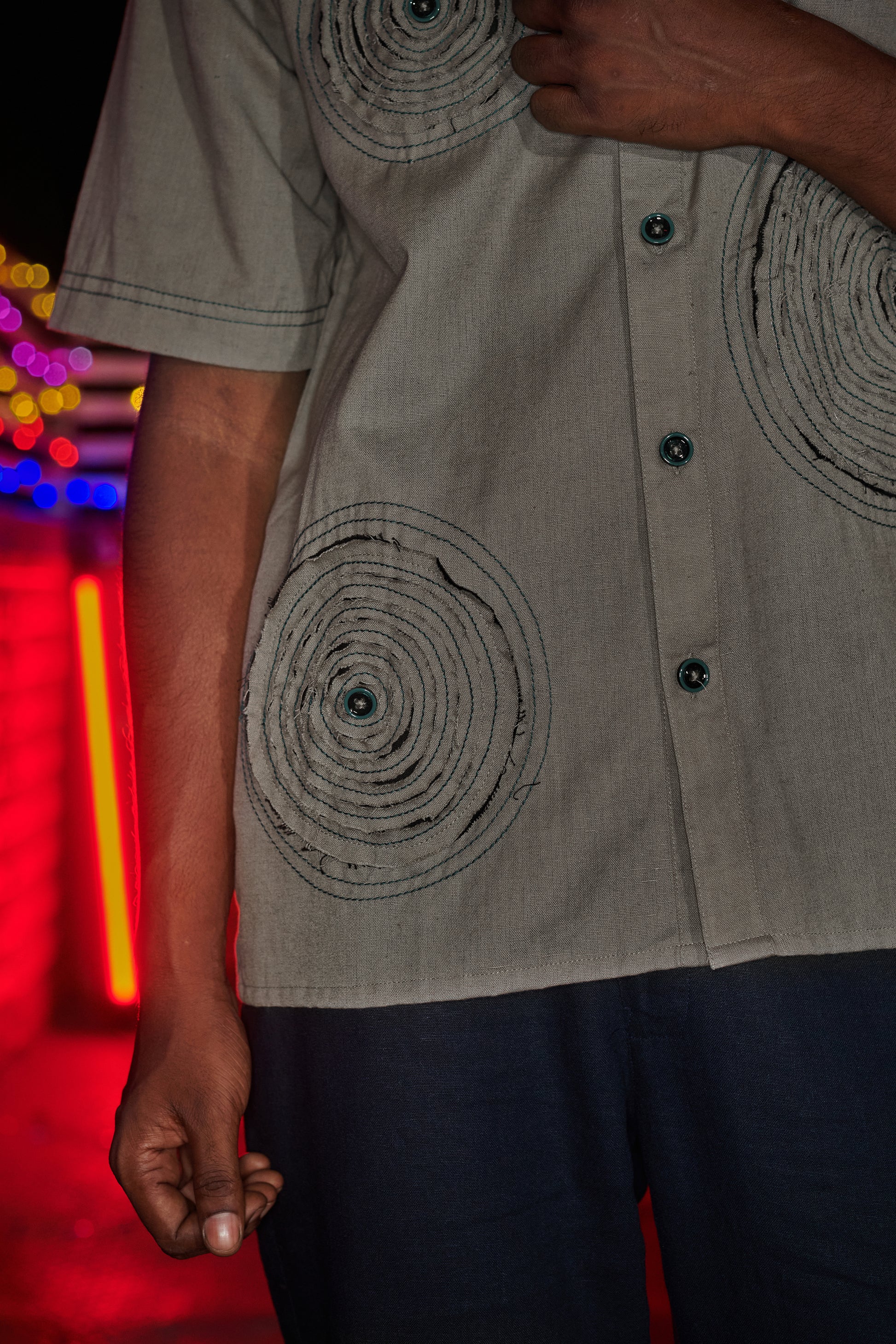 This grey shirt features four circular patches that represent the mental loops that trap the mind. The patches have two layers: a grey top layer that blends with the shirt and a black bottom layer symbolizing the darkness within. The circular stitches around each patch create a loop effect, and the fabric is intentionally distressed to reveal glimpses of the black underneath. With each wash, the grey fabric frays more, exposing the hidden darkness. "The Loop" is a striking piece that visually captures how the mind’s repetitive thoughts can gradually uncover deeper, darker struggles, intensifying with time.
