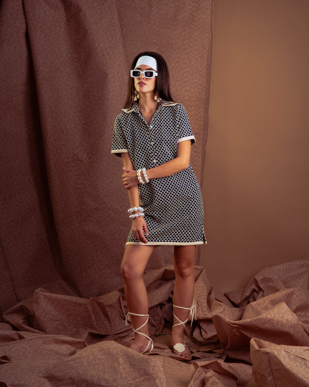 Stand out with this navy blue collared dress in a rich cotton material fully emboriered fabric detailing of lace on bottom and sleeve hem as well as collor which enhance your body silhouette.