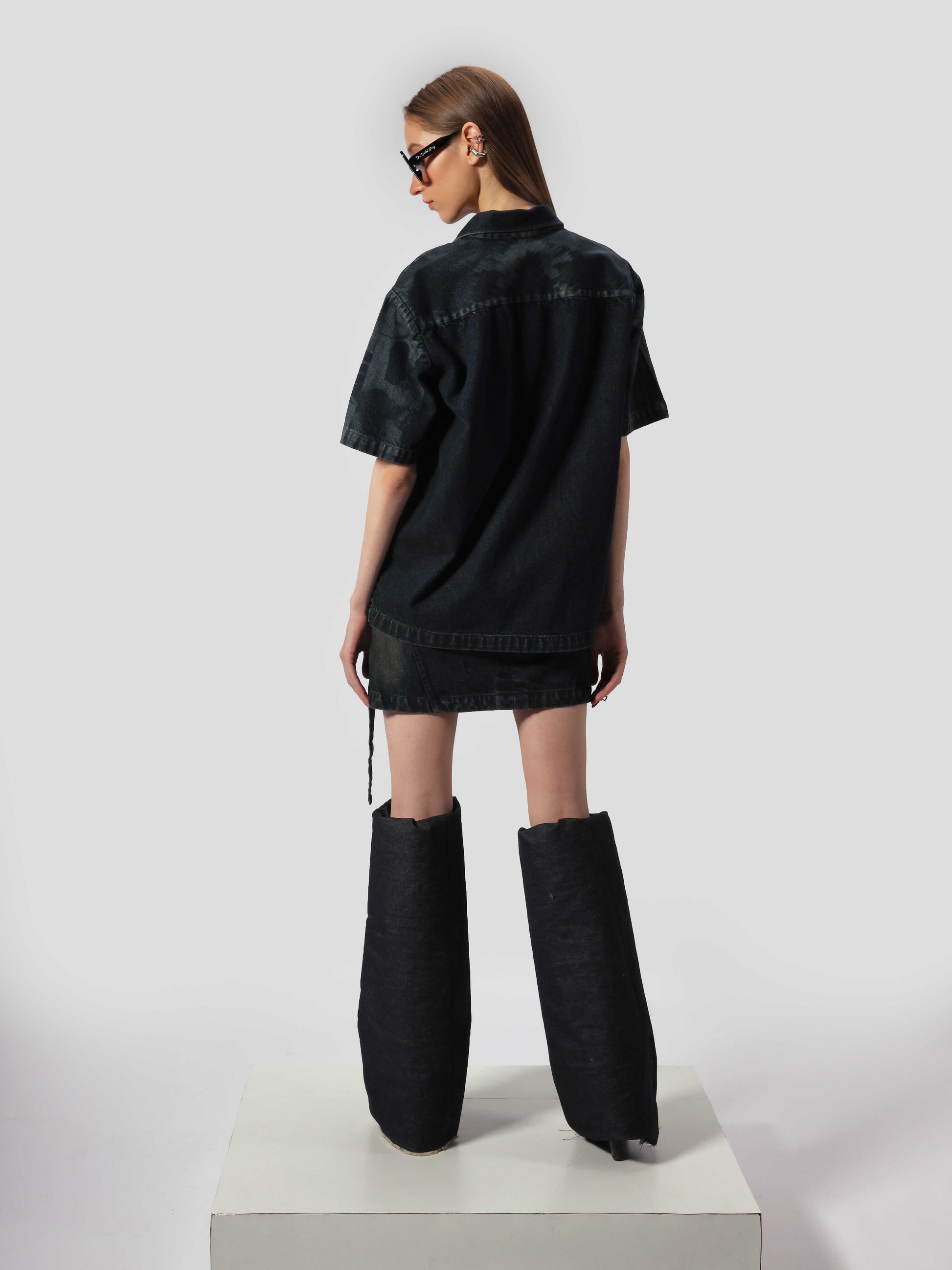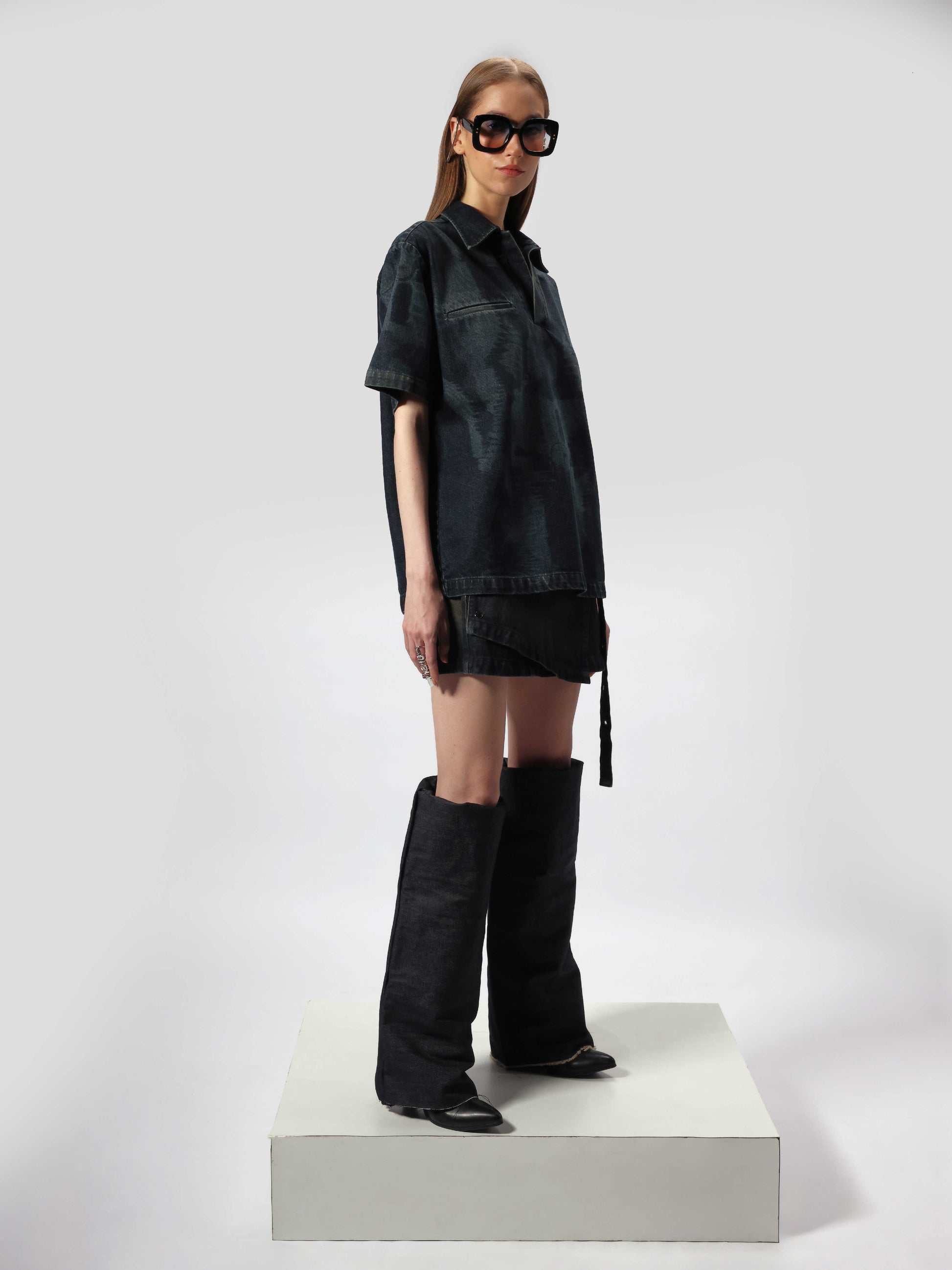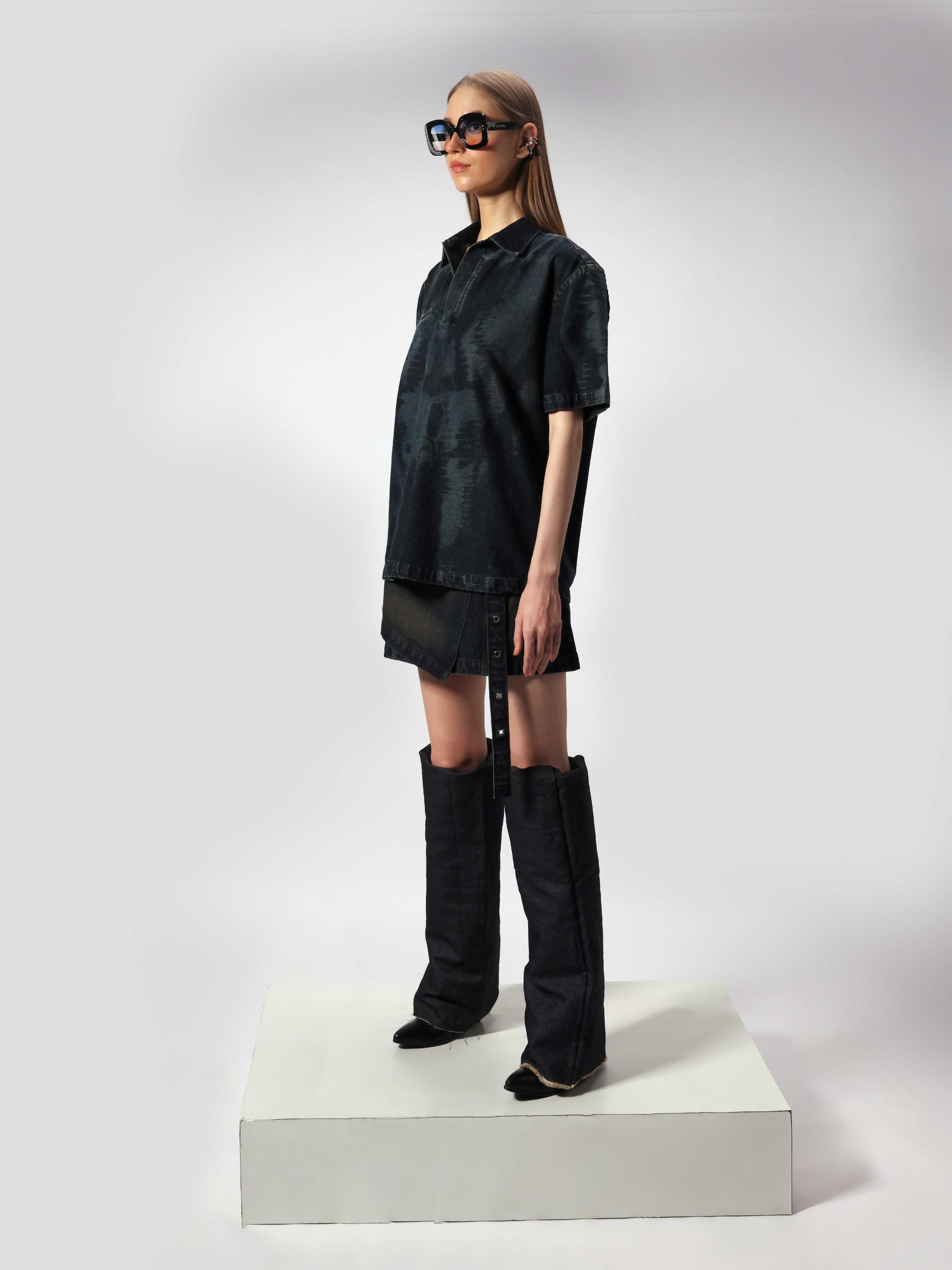 Oversized denim shirt in signature THERAPY’24 wash, designed as a canvas of expressive art therapy. Featuring a indigo base accented with vintage wash, this shirt showcases an artistic screenprint across the front, sleeves, and back yoke. Crafted with a pointed collar and side slits, and finished with refined French seams.