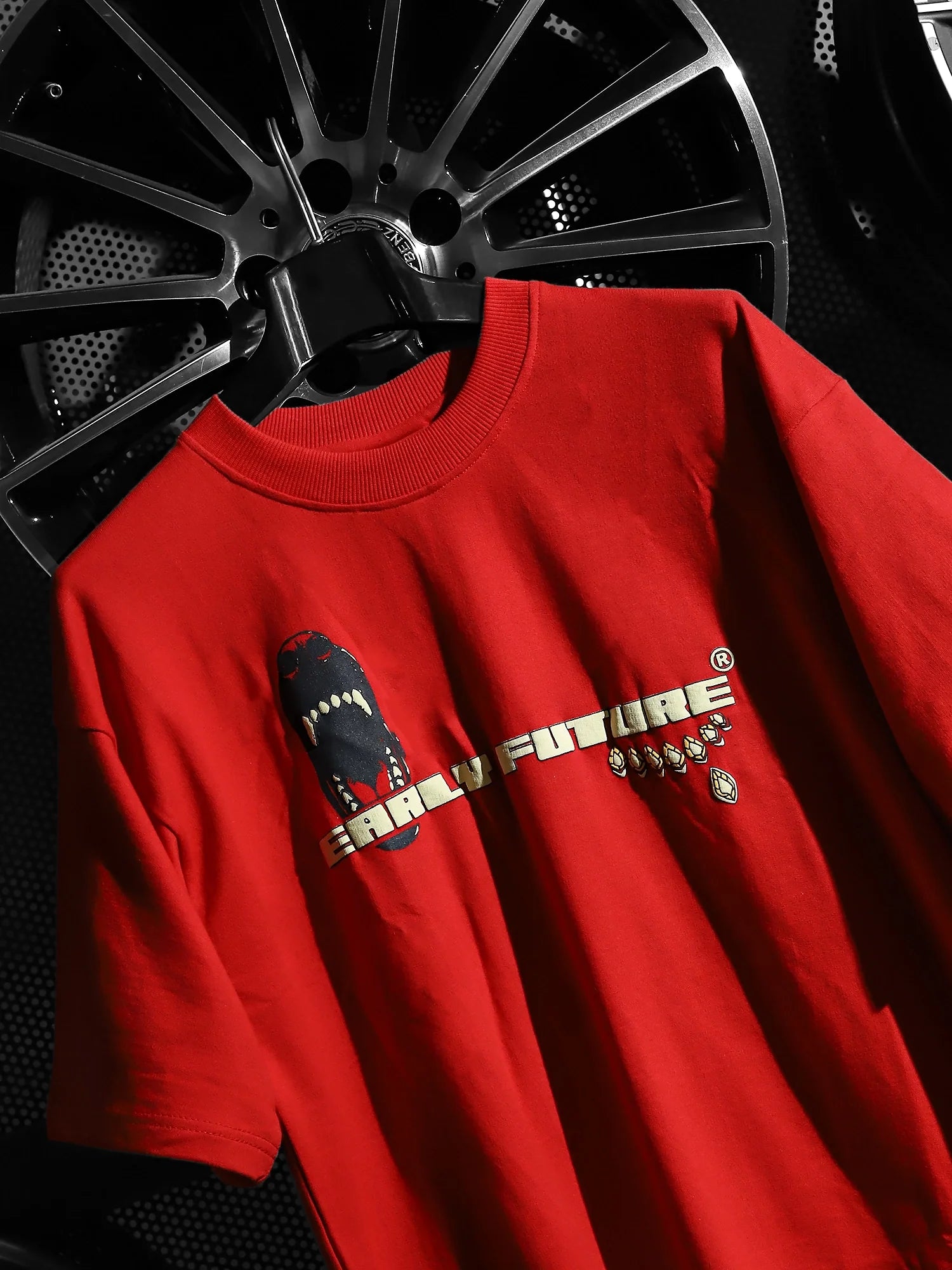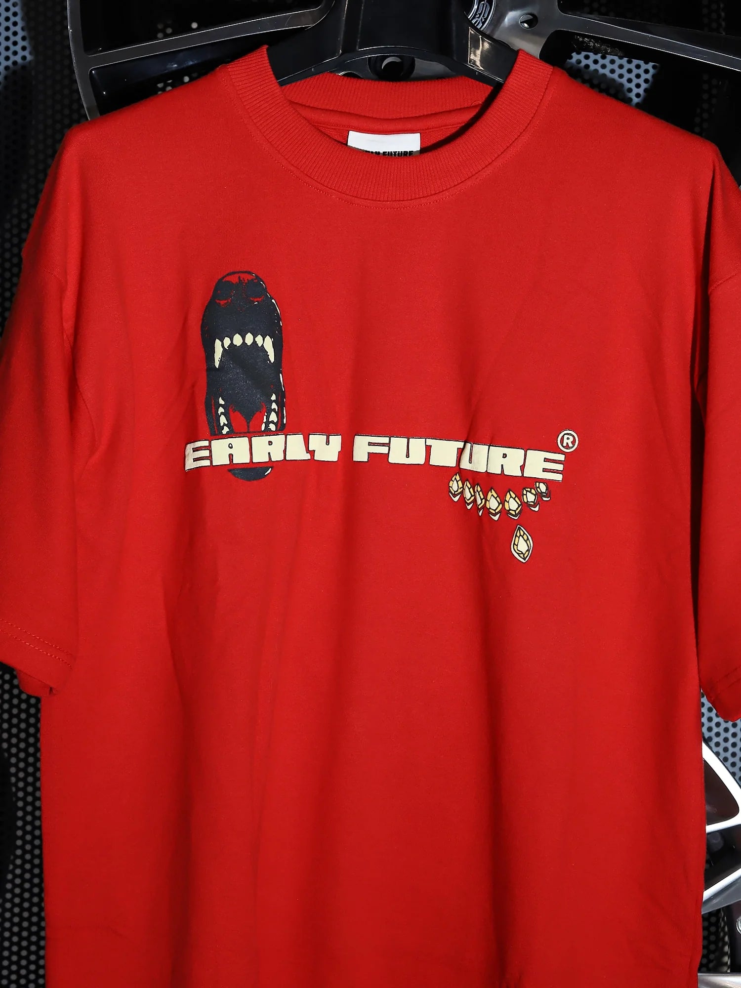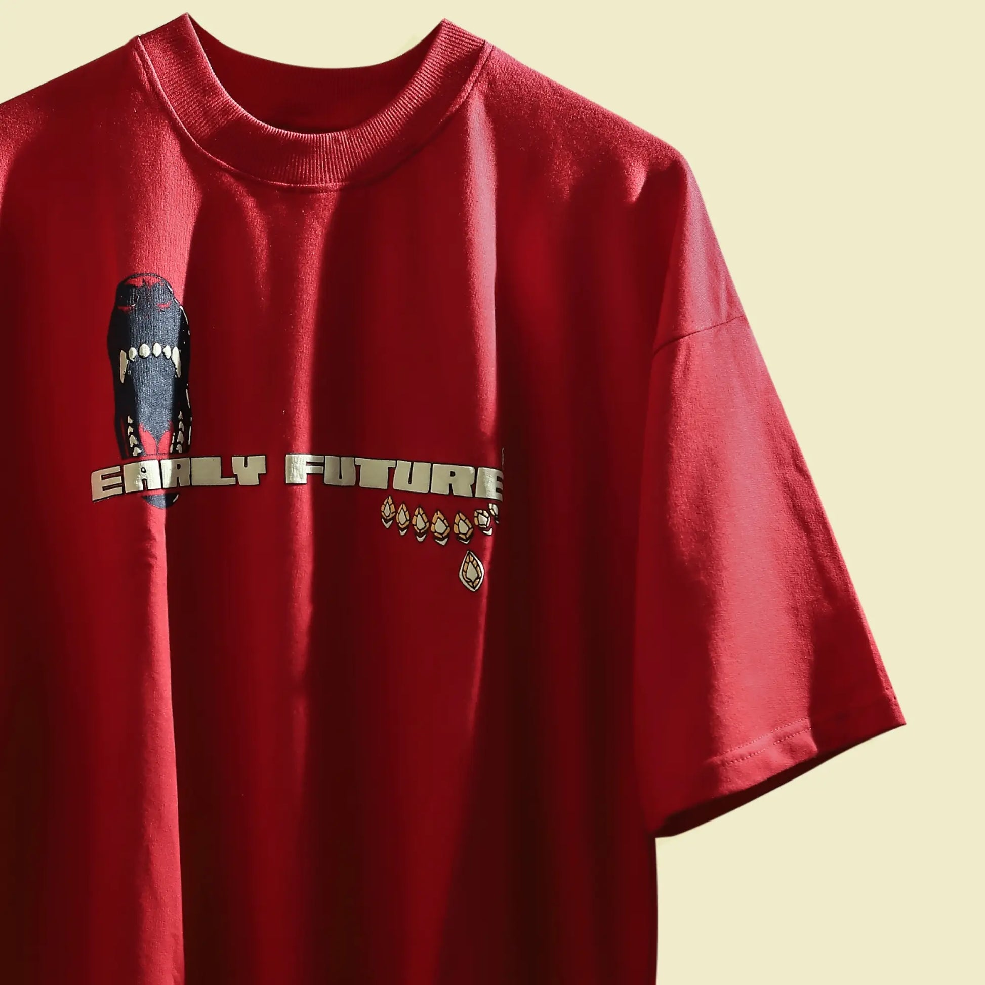 The front delivers a warning – a snarling set of fangs guarding the EARLY FUTURE name, flanked by gold emblems of vigilance.