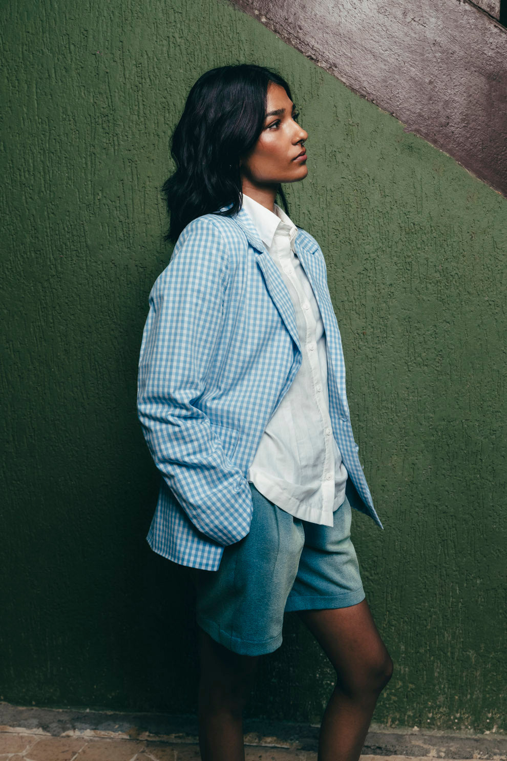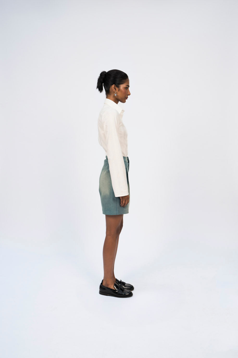 high waist - double pleat - front fly closure - green tint wash - side pockets - mid thigh length