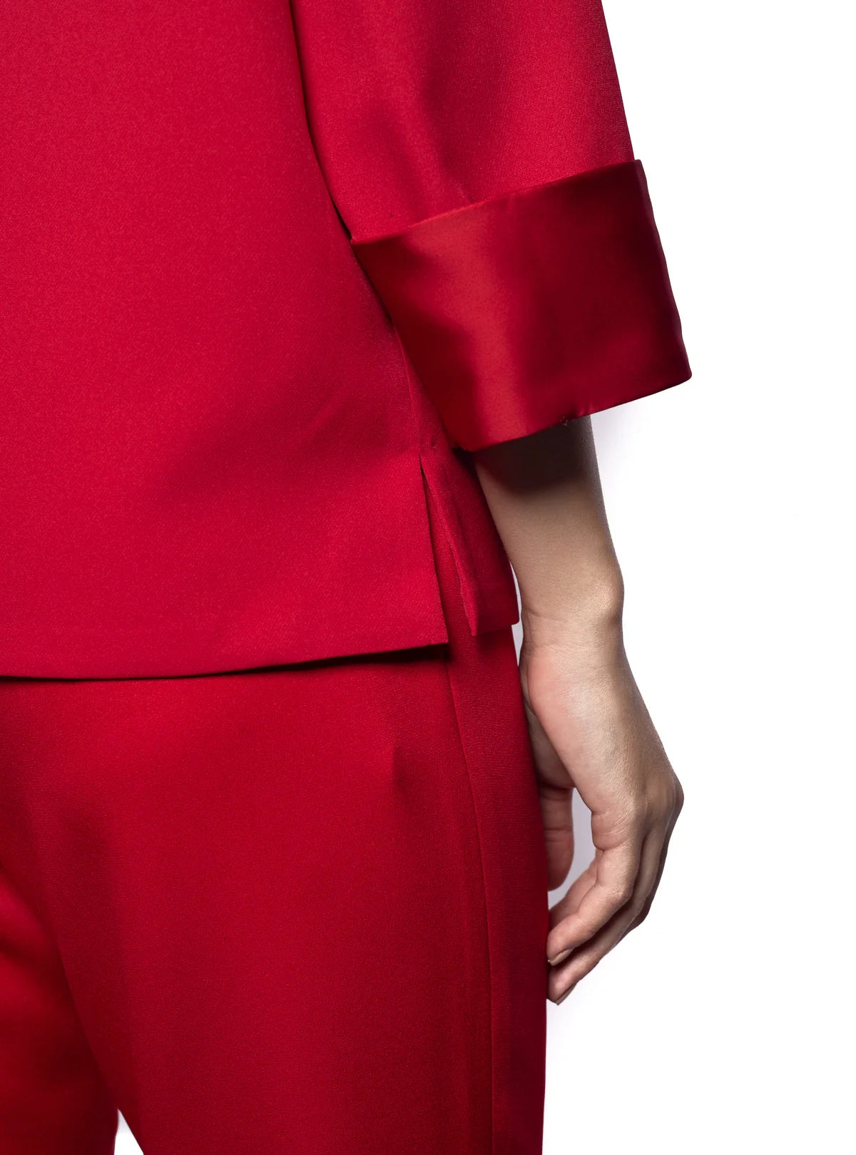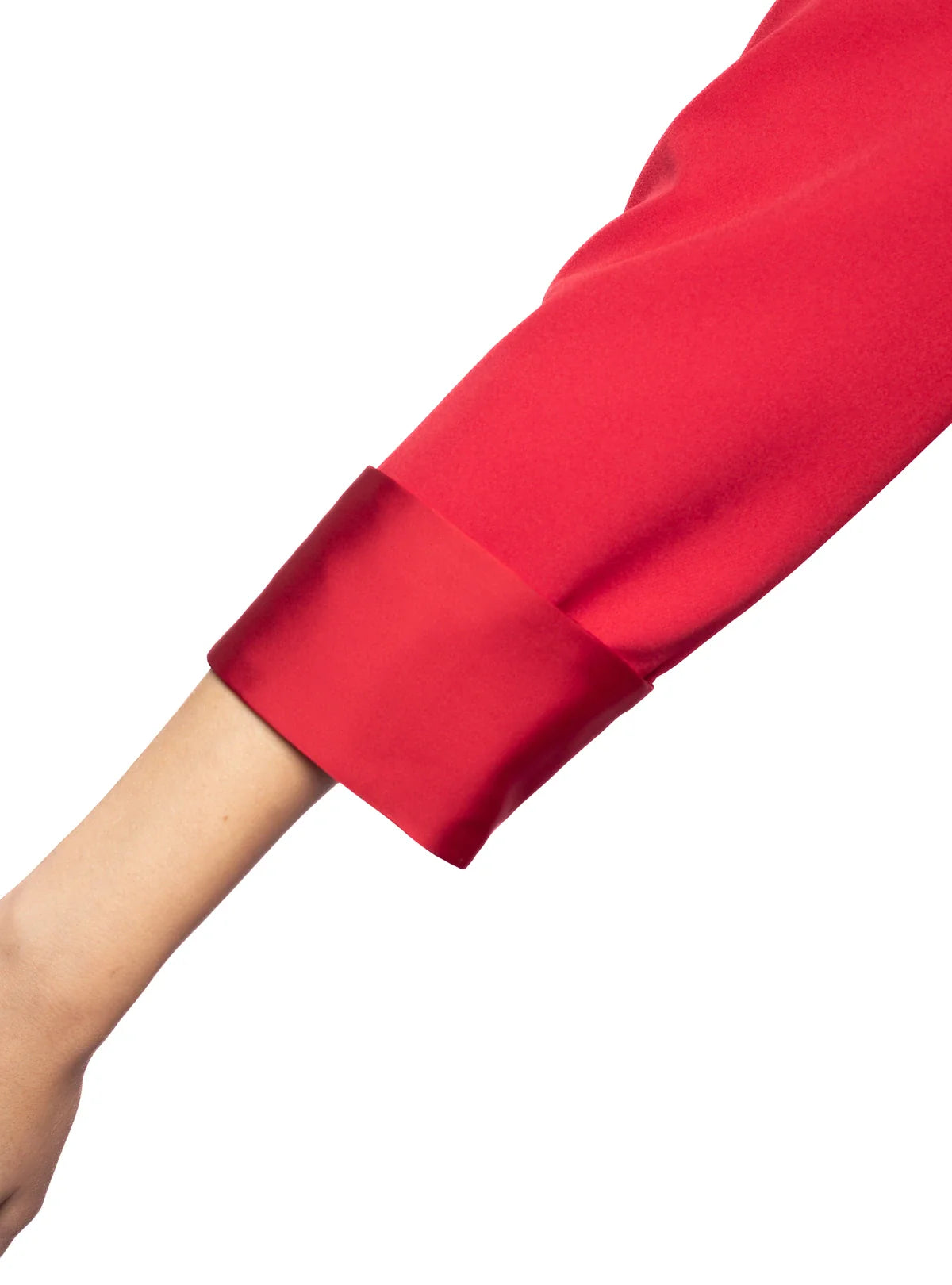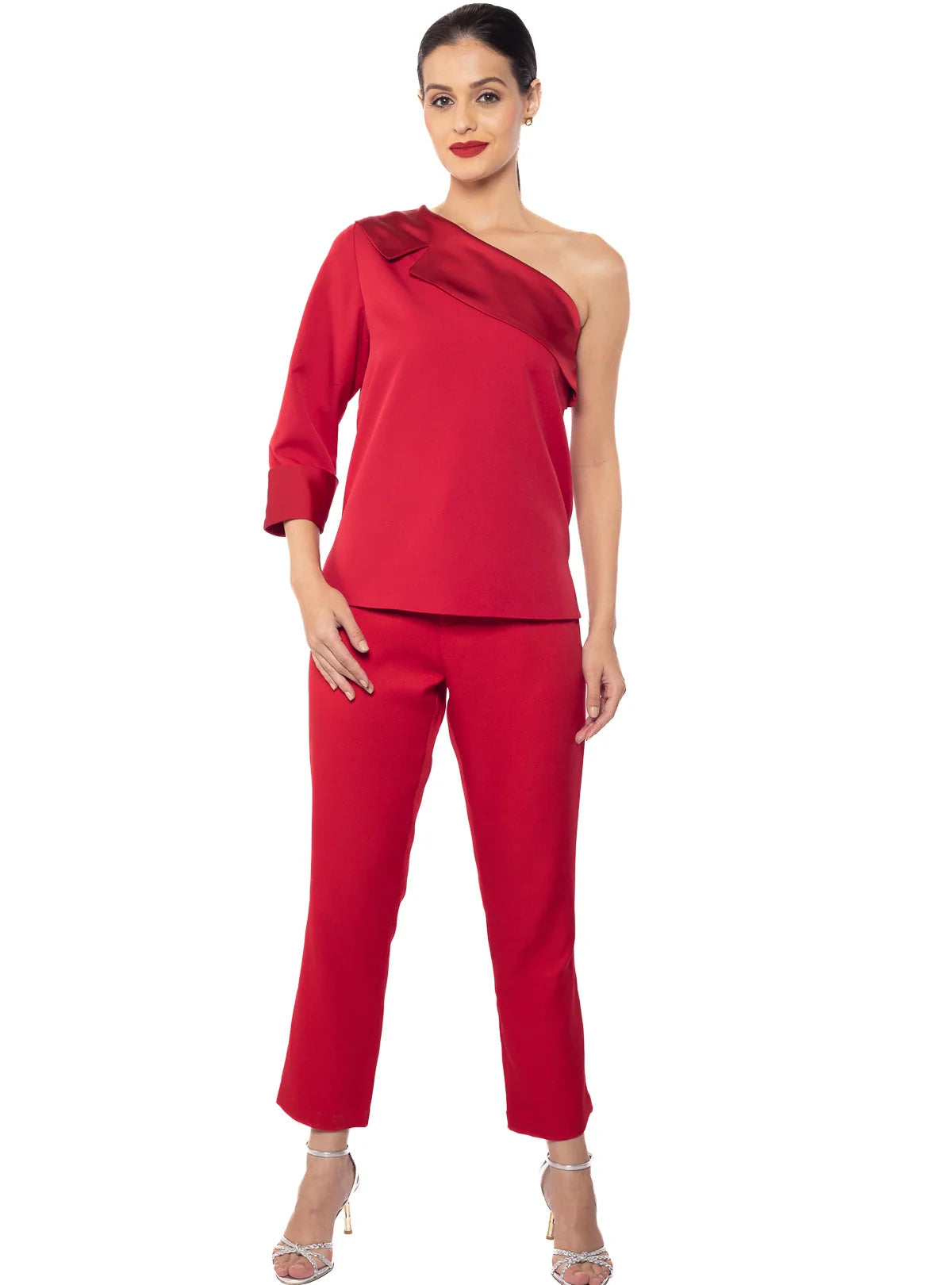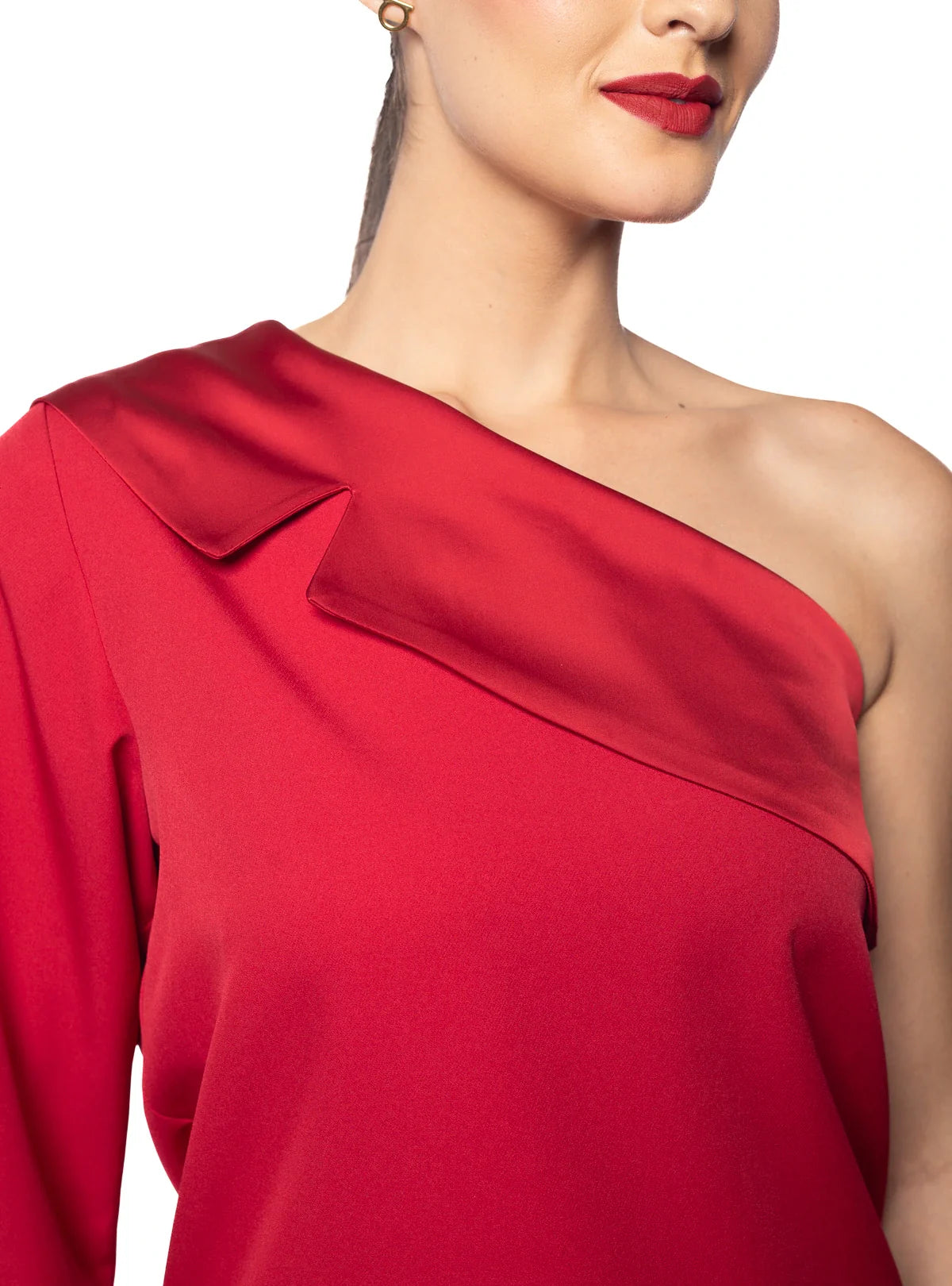 Designed with a contemporary asymmetrical neckline with gel tape that exudes elegance and edge. The standout wide satin lapel detail adds structure and flair, perfectly complementing the unique silhouette. One sleeve features a sharp three-quarter length with a wide satin cuff, creating a bold contrast that enhances the modern aesthetic. The hem is thoughtfully finished with side slits for ease of movement and a flattering fit. A concealed side zipper ensures a seamless finish and easy wearability.