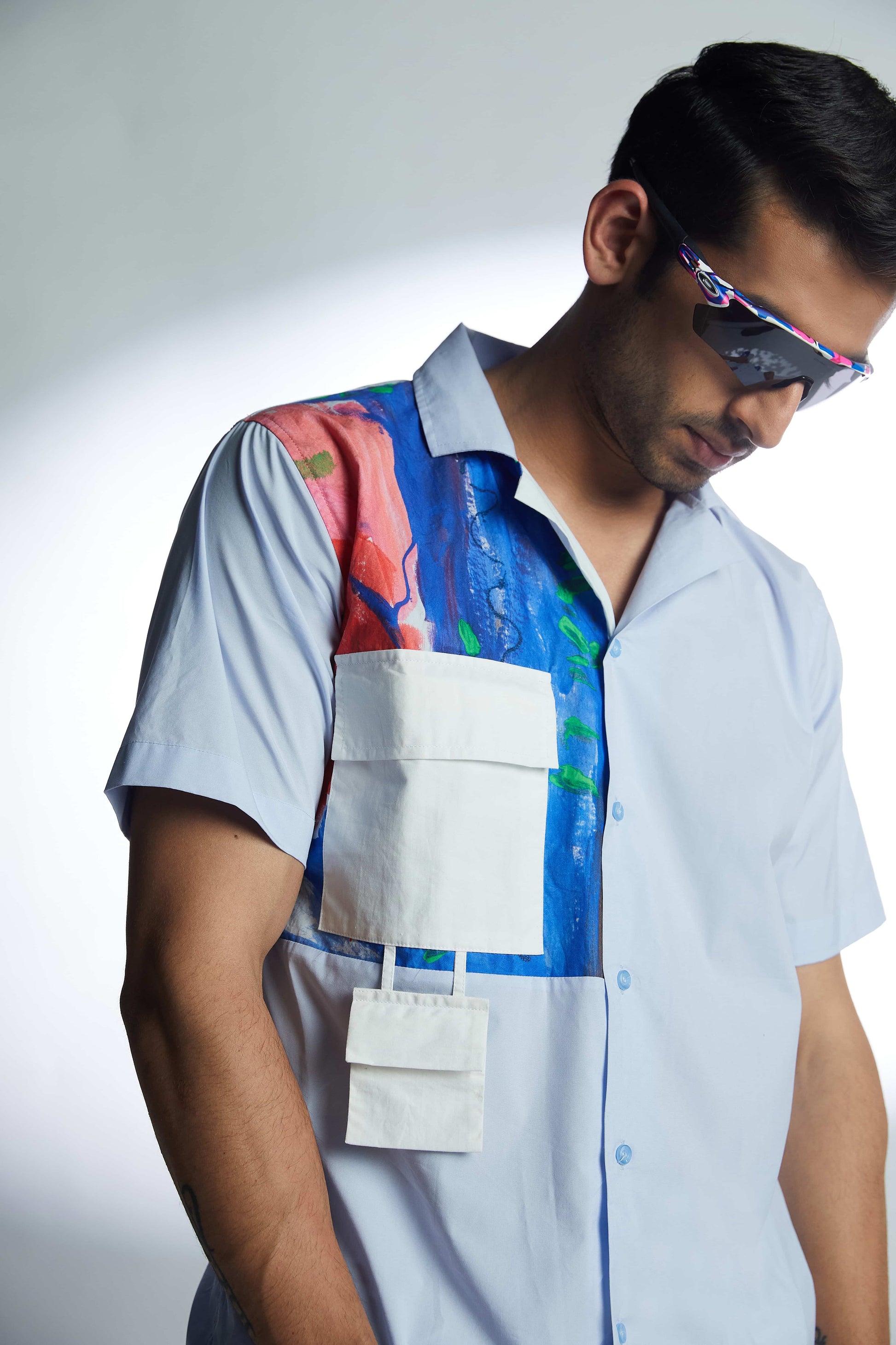 Regular-fit collared button up shirt with short sleeves. Asymmetric twin pockets featuring "Underwater world" Print with reflective detailing. The Underwater world is designed in collaboration with Muskaan. An NGO for specially abled. This Artwork was created by Kavita. 15% of our net profits will be donated for their welfare.
