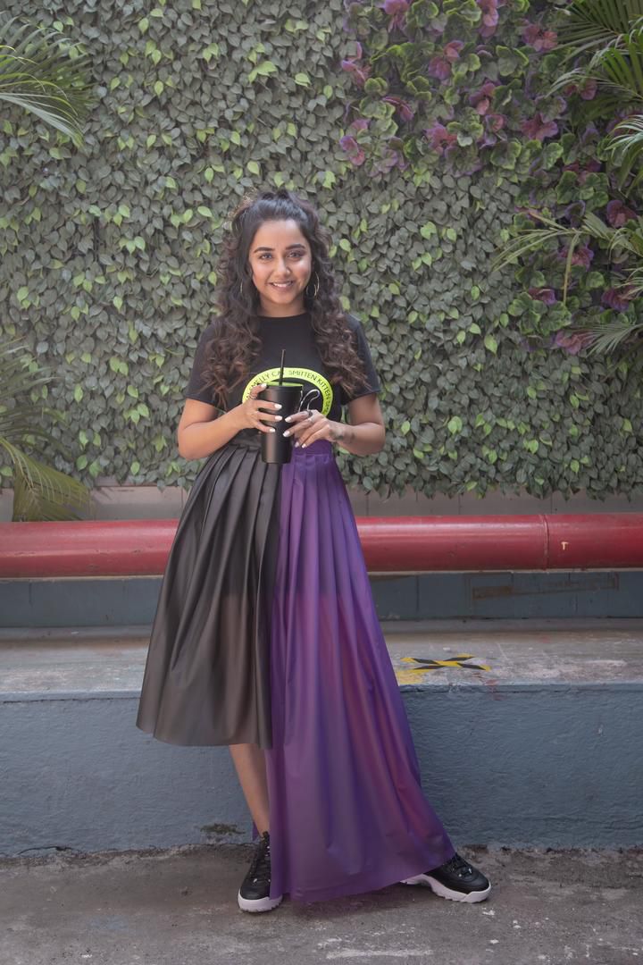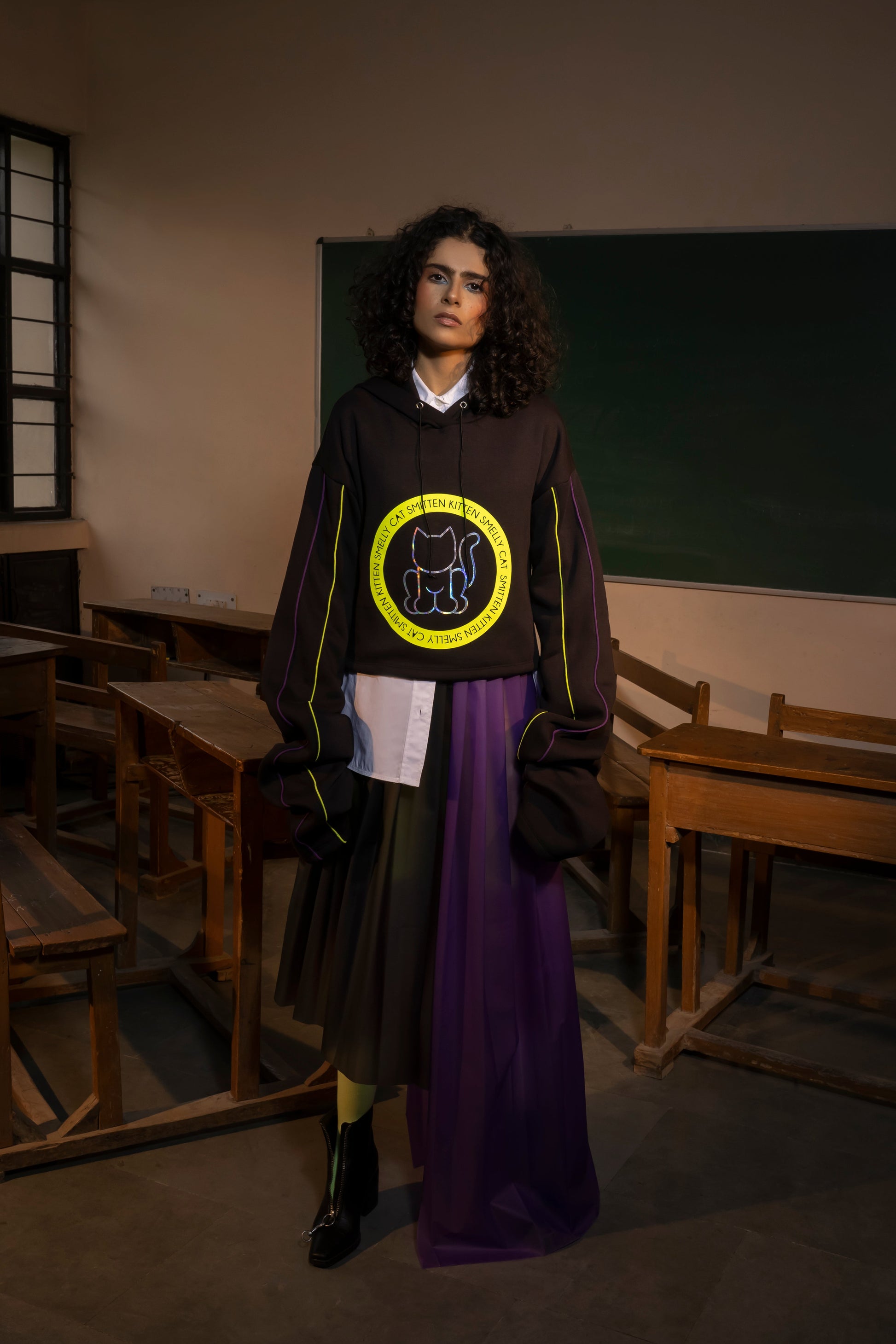 High-waist translucent pleated skirt with two tone colour blocking with invisible side zip fastening.
