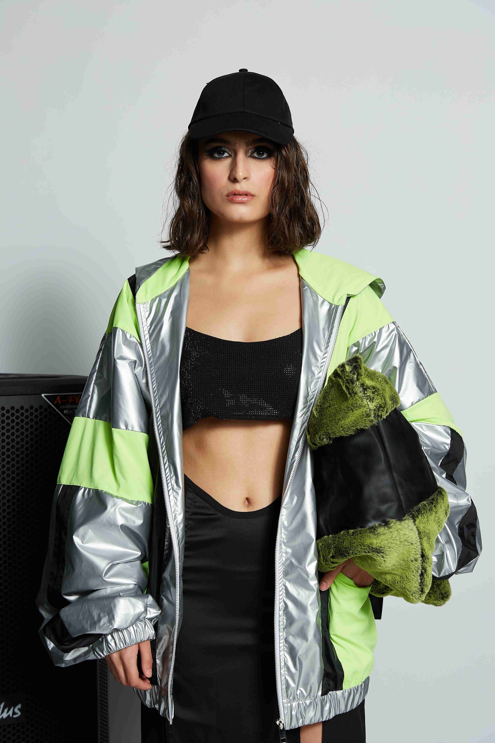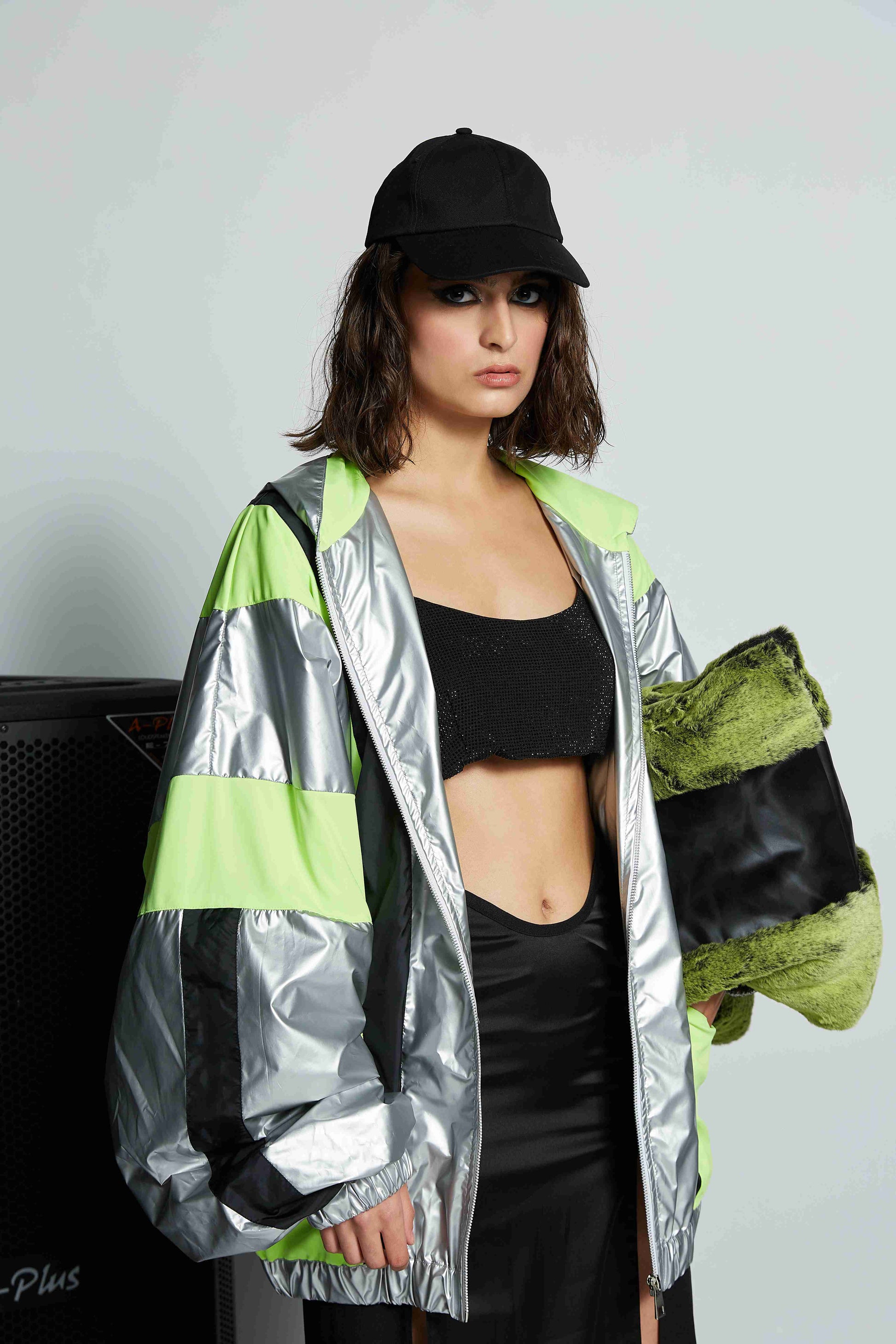 Oversized Two-Tone Faux Bag juxtaposed with black textured leatherite with zip fastening on the top.