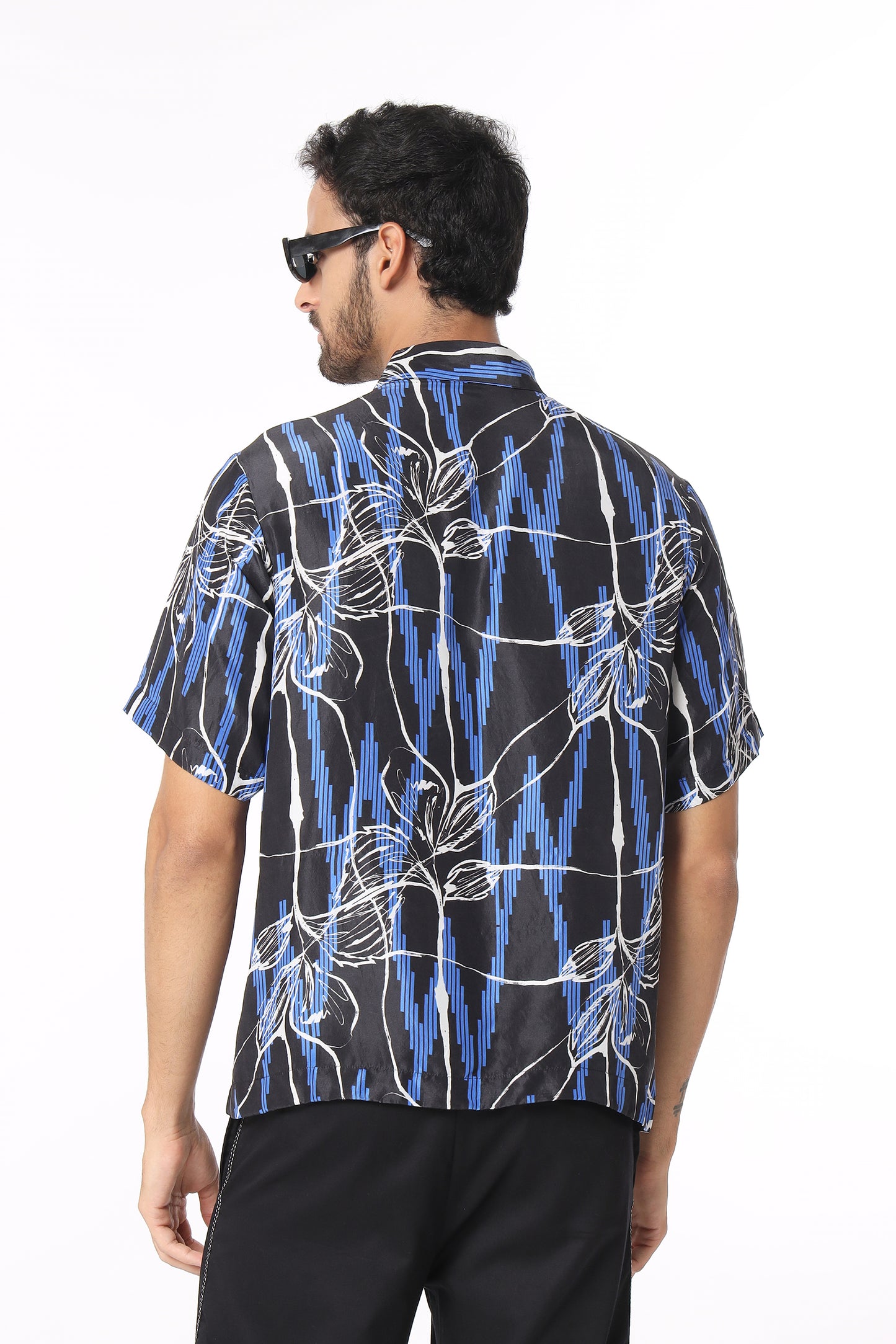 Black silk shirt with graphical print in electric blue and white color comes with a relaxed fit.