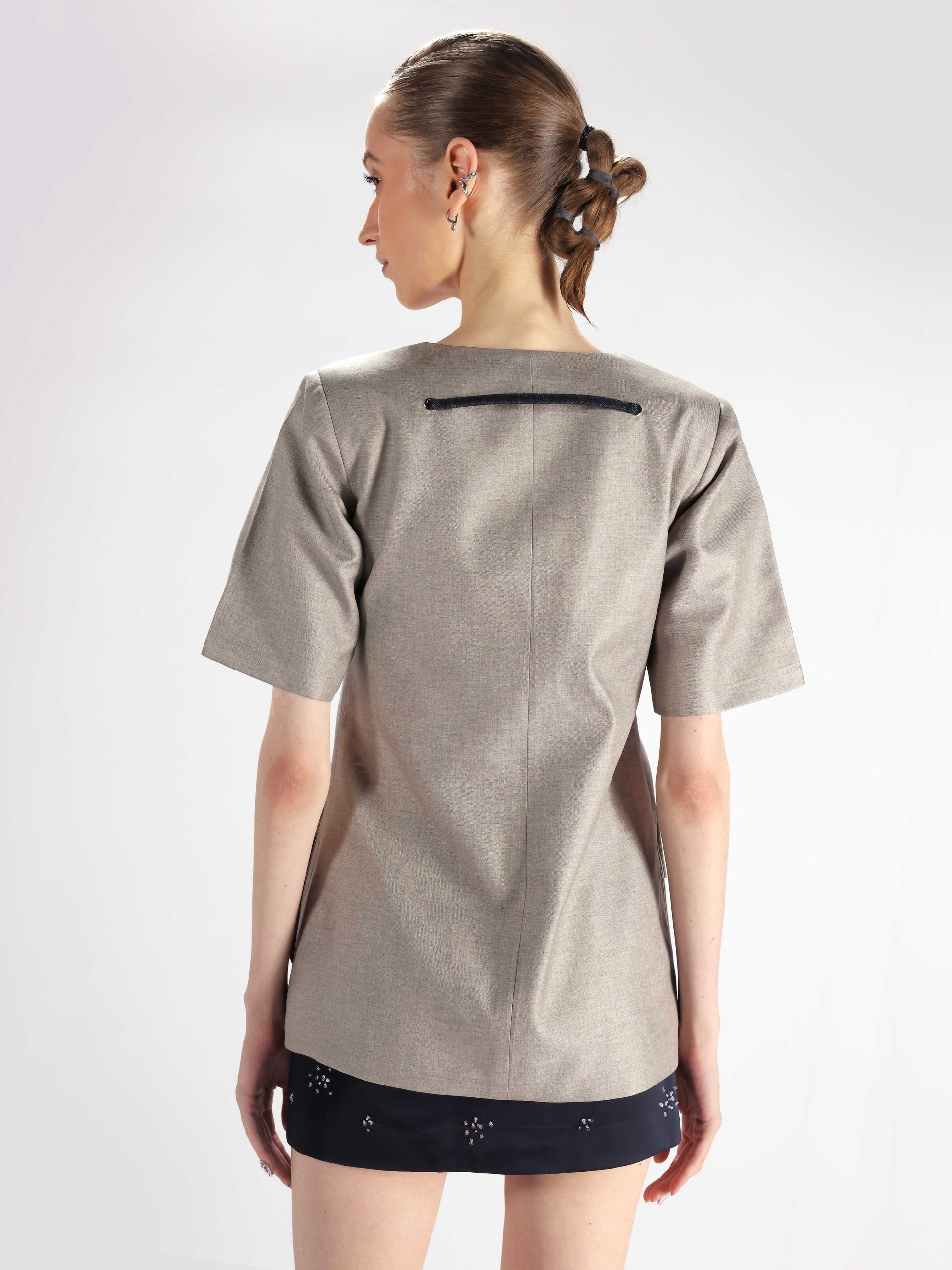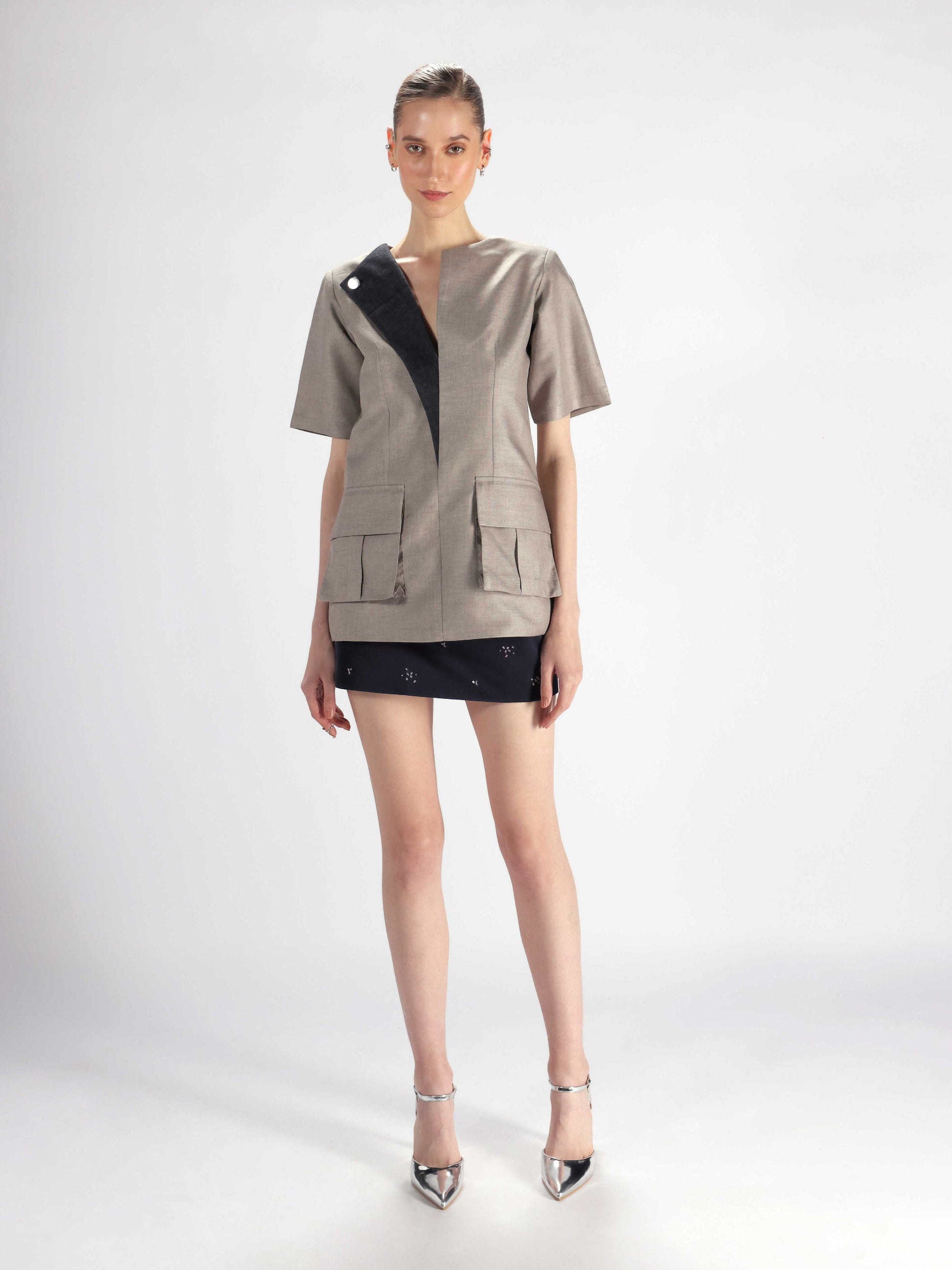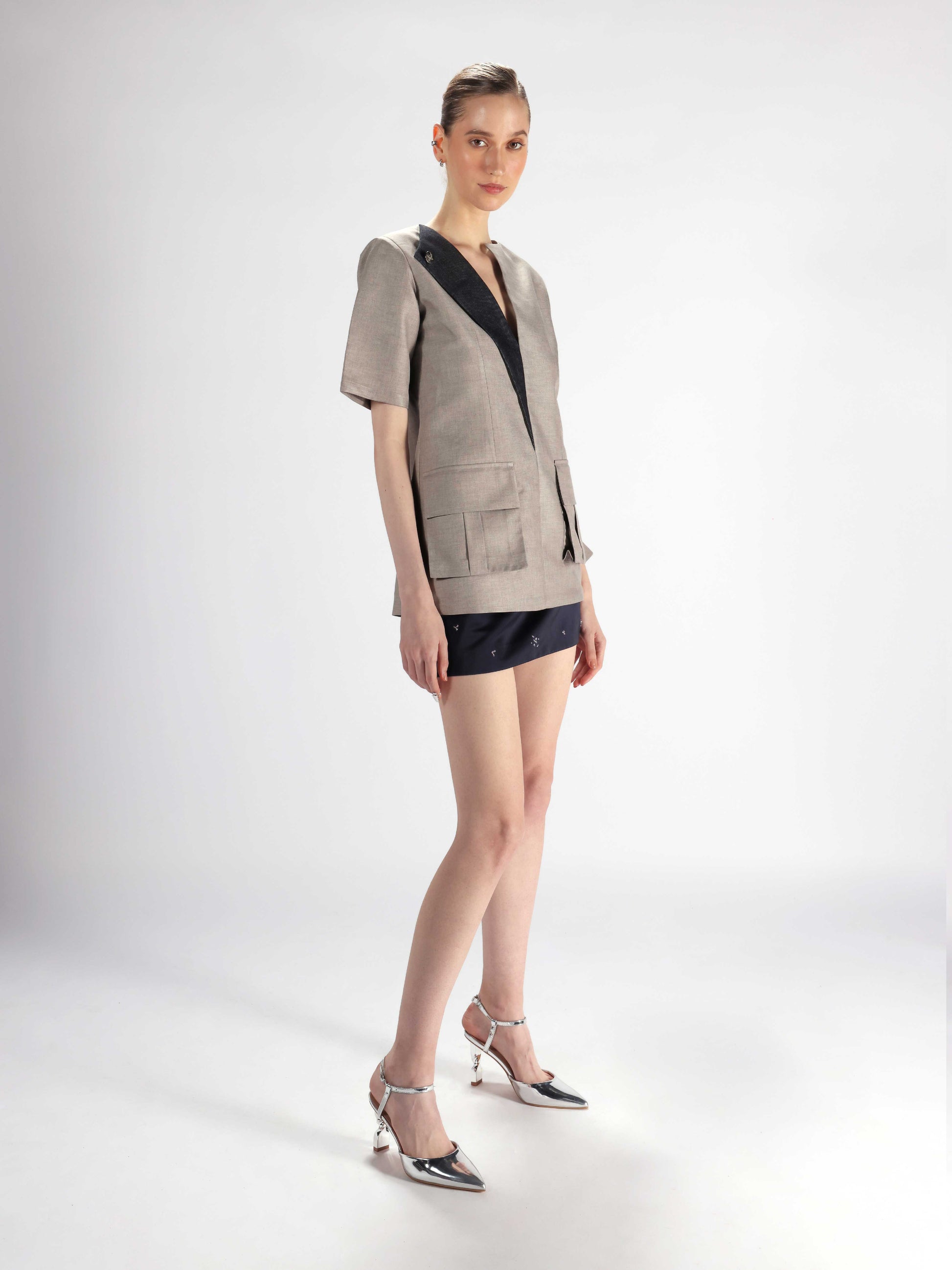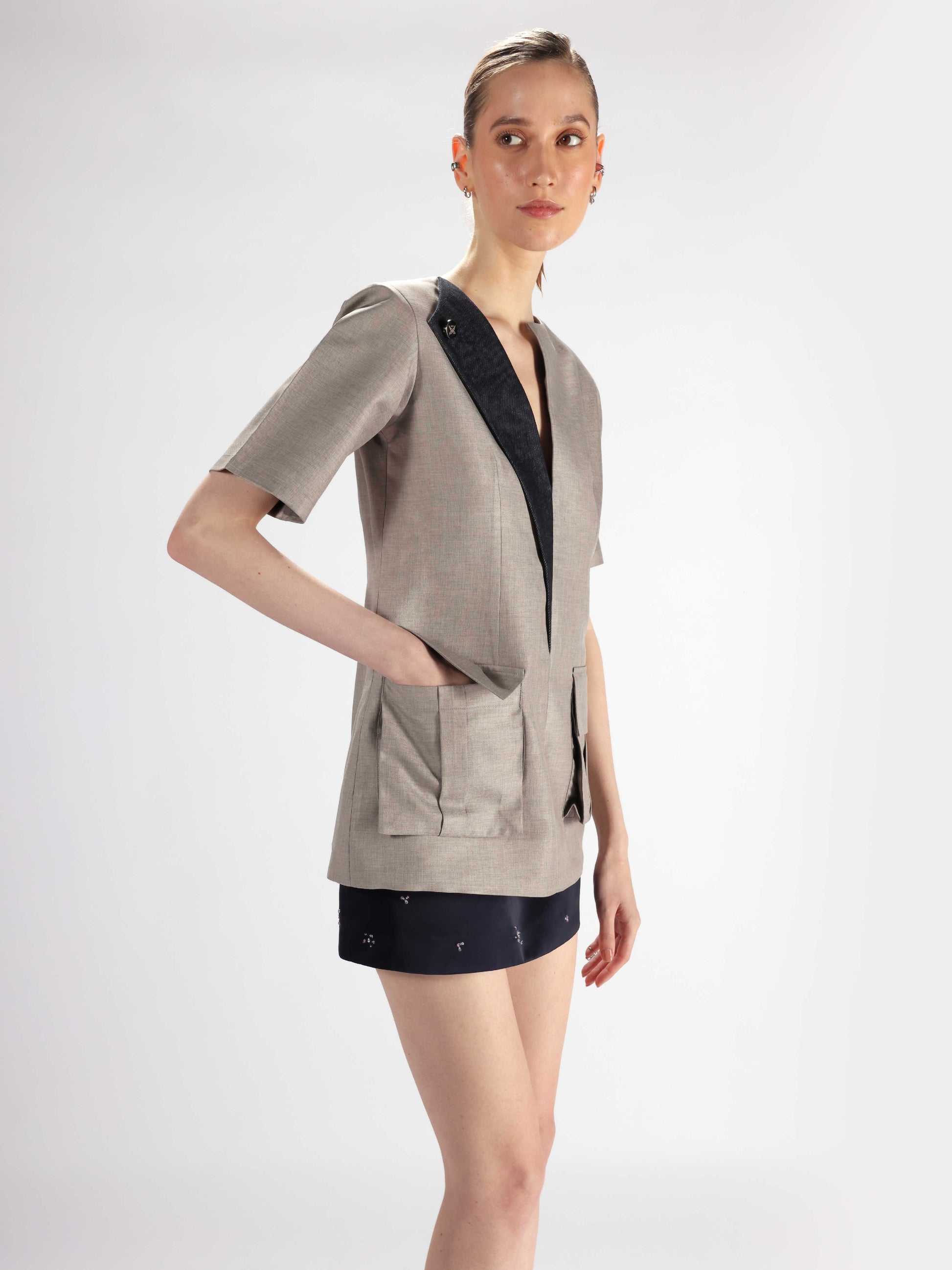 Short-sleeve mini dress crafted in grey suiting fabric, designed with strong shoulders and a contrasting asymmetrical lapel on one side in denim. Features a Rewrite logo button, oversized front pockets with inverted pleats, and rivet denim detailing at the back for a utilitarian finish.
