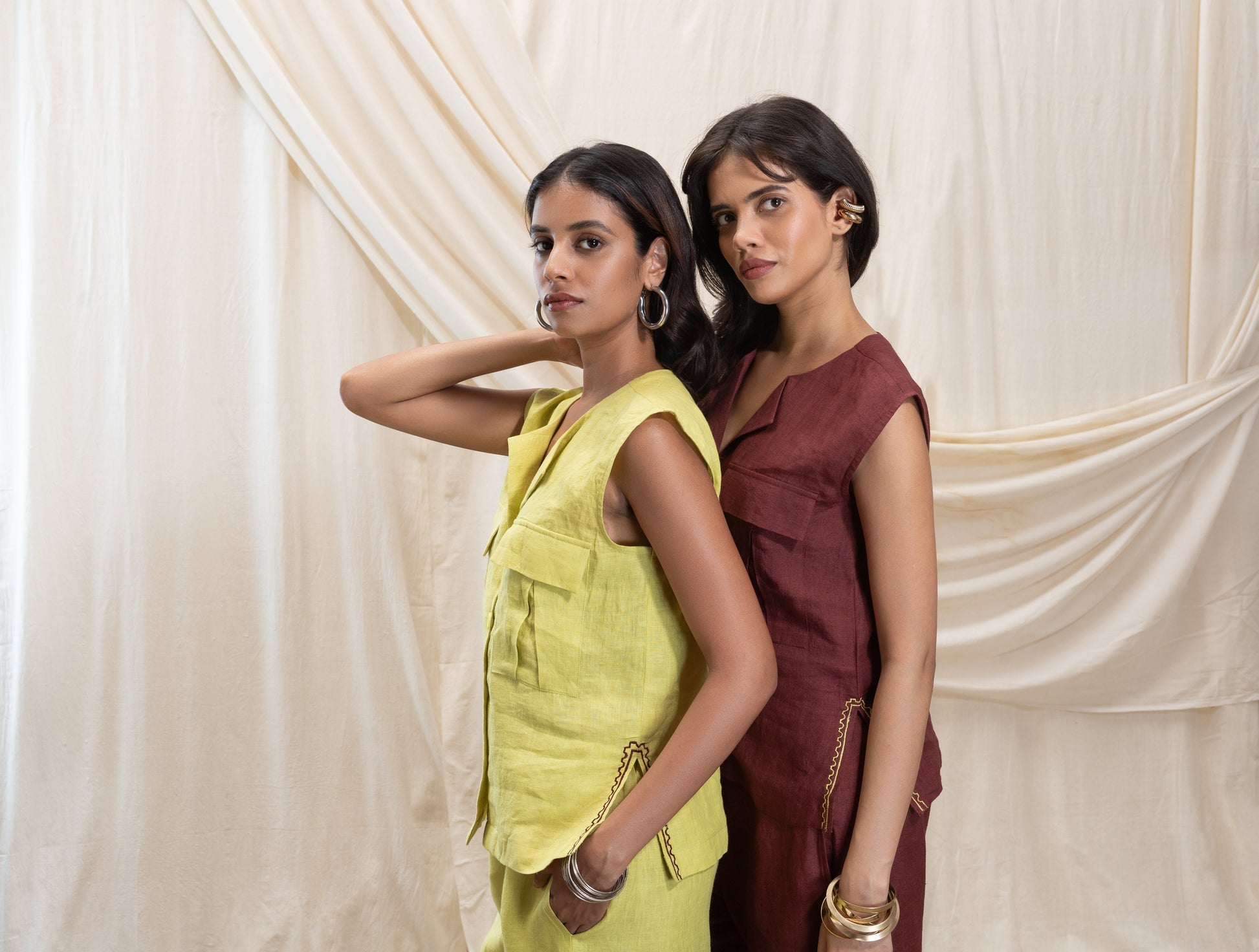 A buttoned sleeveless vest with a sharp V-neck and functional front pockets on either side. The vest features delicate line embroidery along the slit for added detail, while the back is adorned with the Akashi logo and signature stamp.