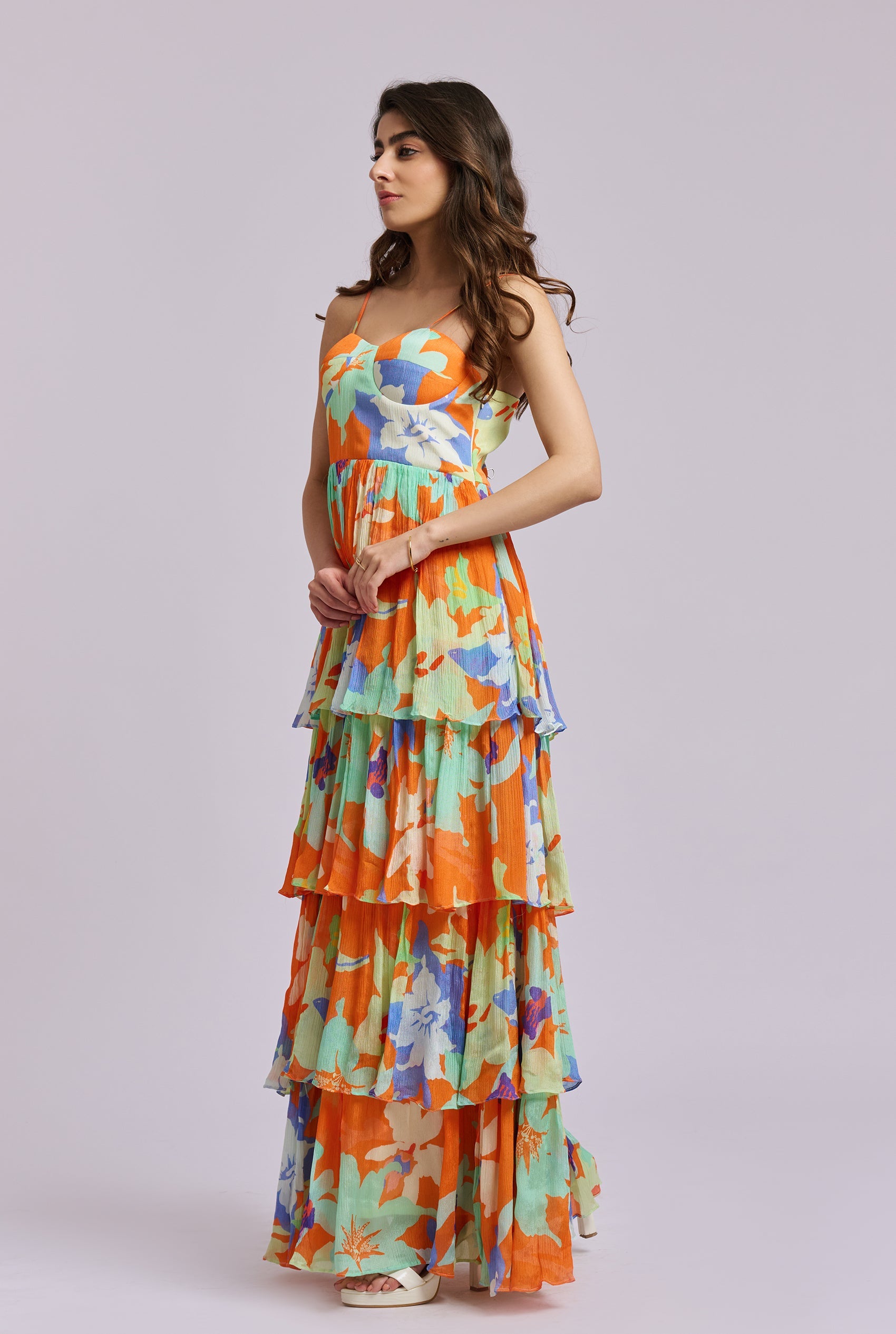 This elegant dress features a unique abstract print and thin straps for a delicate look. The fitted chest area highlights your silhouette, flowing down into a long, ruffled skirt with an A-line shape. The playful ruffles add movement and charm, making this dress perfect for casual outings, brunches, or special evenings.