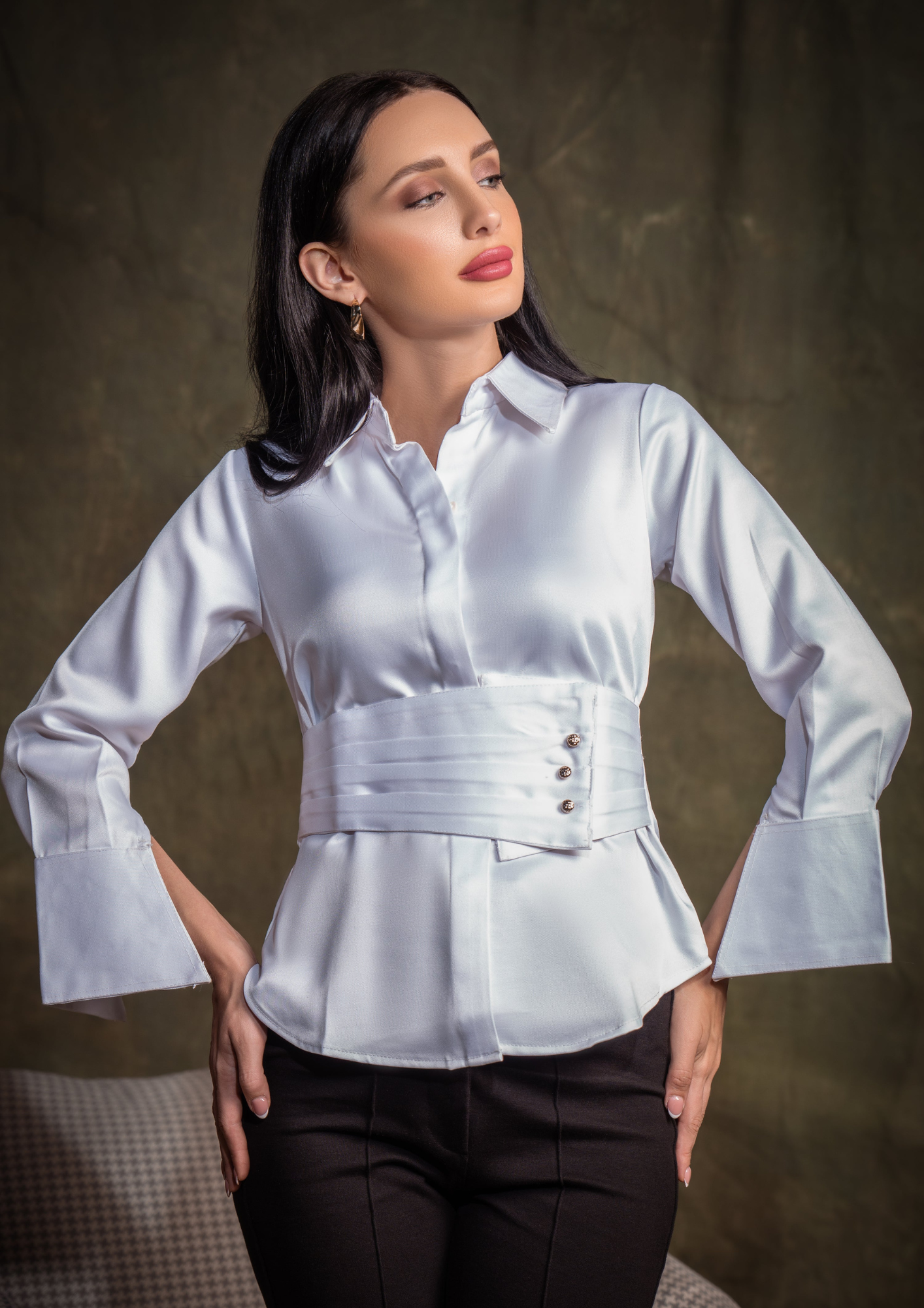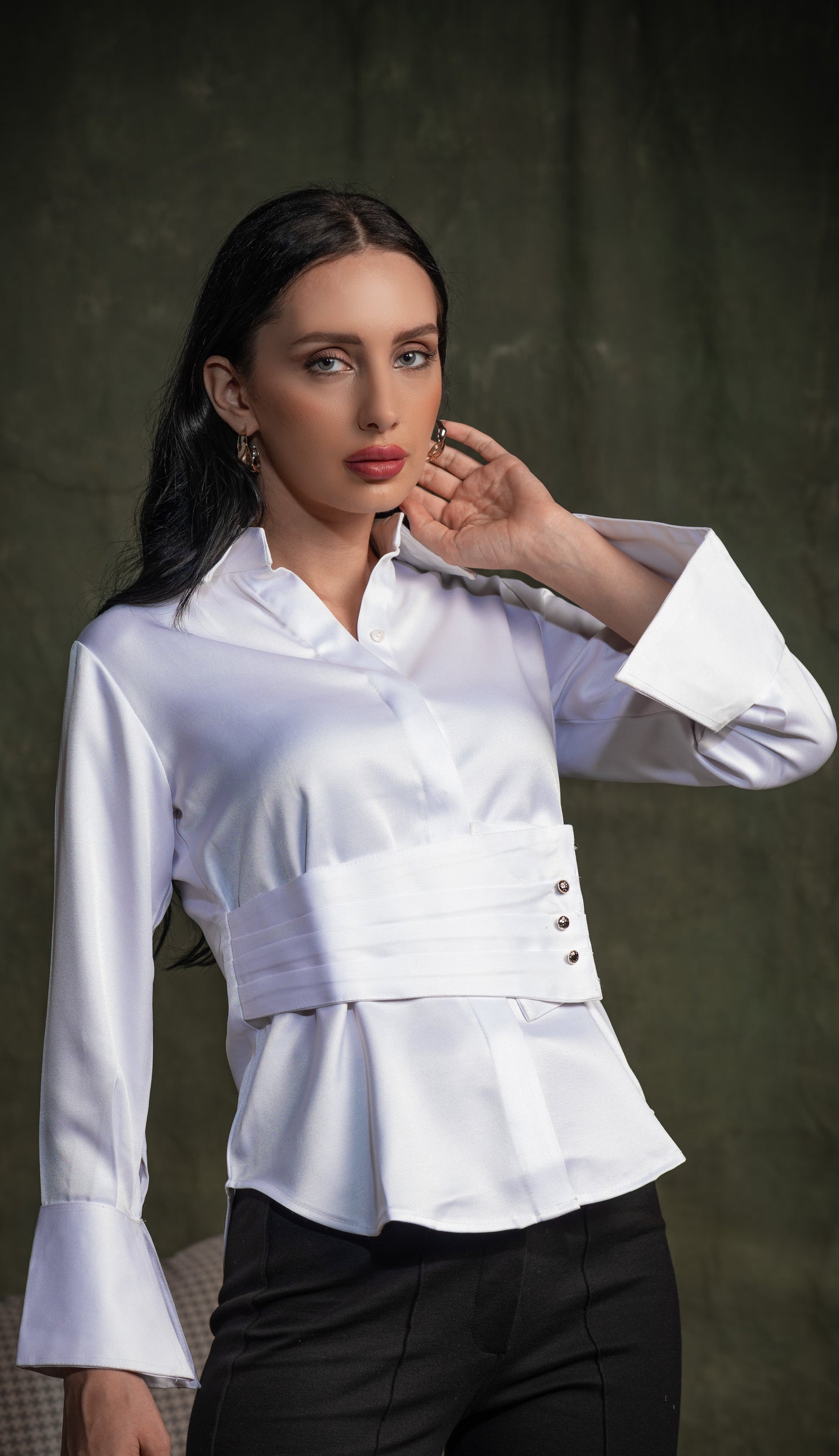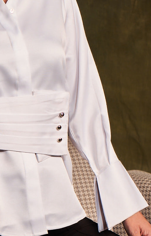 Elevating your attire with this belted crisp white shirt in a cotton twill fabric. It has a pleated broad belt with button detailing & broad cuffs, making it look dressy at the same time.