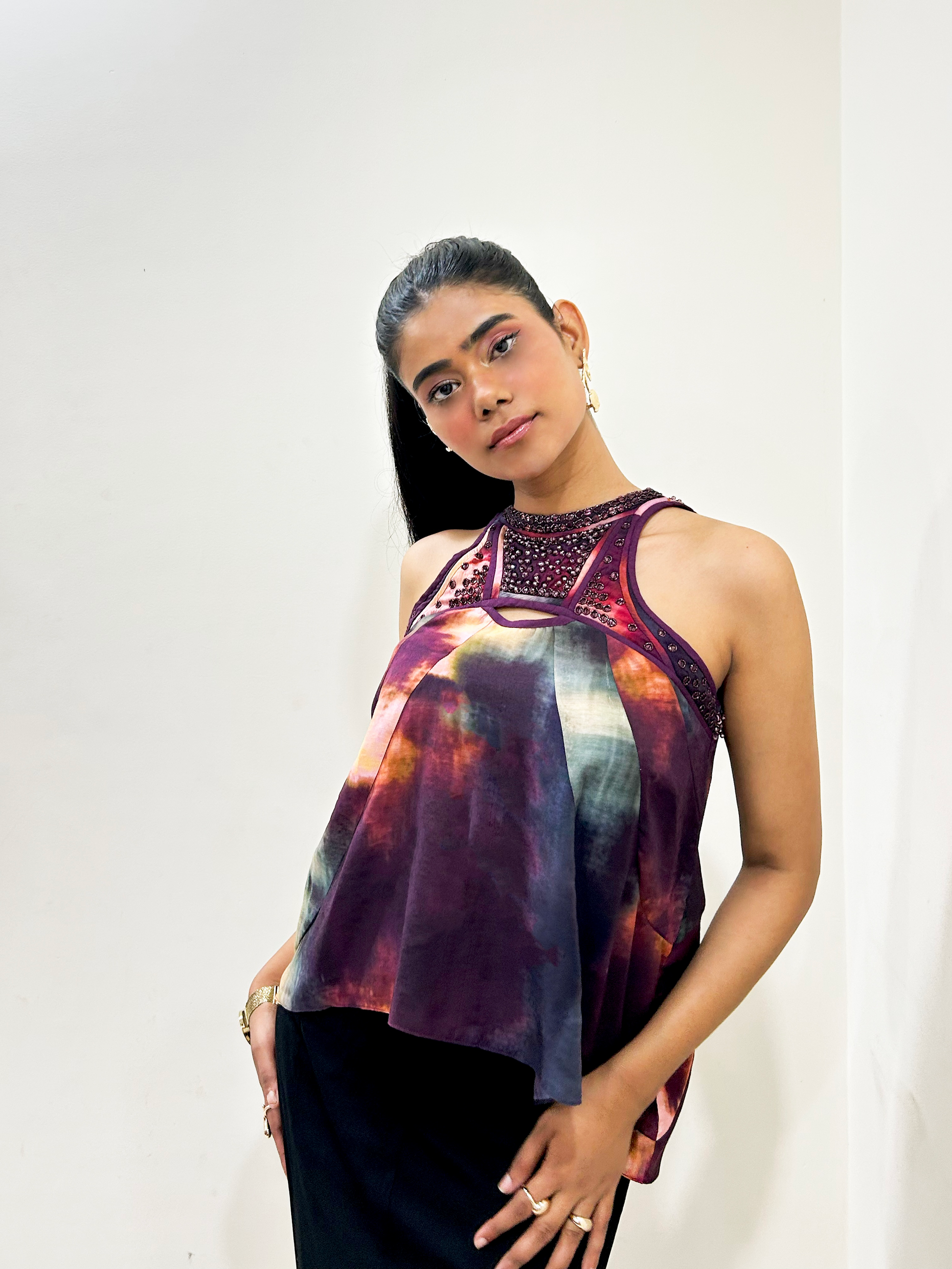 Infused with the energy of a starlit sky, this hand-dyed halterneck top is a striking blend of rich cosmic tones and intricate artisanal detailing. The sculpted neckline is adorned with tonal beadwork and sequins, adding dimension and luminosity. Crafted in fluid fabric that drapes effortlessly, the top flatters with its open-back silhouette and dramatic palette. A bold statement piece that moves between festive evenings and artful everyday edits with ease.