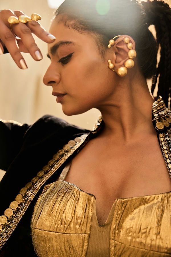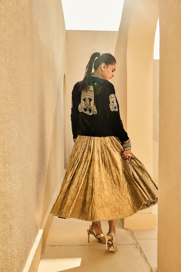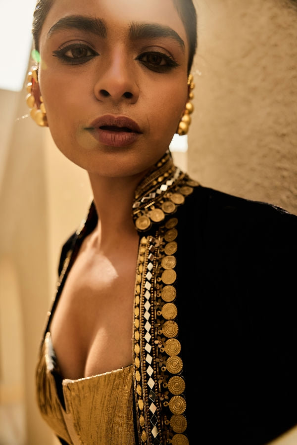 Primary Colour: Black and Gold, Material :Velvet and Silk Jacquard CrushOccasion : Festive ( Indo western ), Care Instructions : Dry Clean Only, Lining Material: SATIN AND COTTON, Special Finishings: COIN ,MIRROR,DABKA, Delivery Time: 20 Days, Fit: SEMI FIT