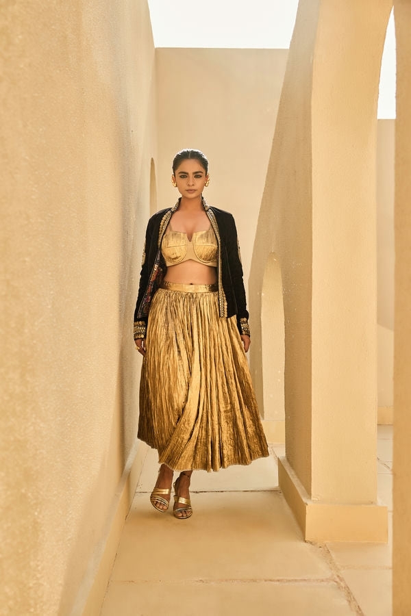 A luxurious black velvet jacket with a gold bustier and silk jacquard skirt, ideal for festive celebrations. Dry clean only.