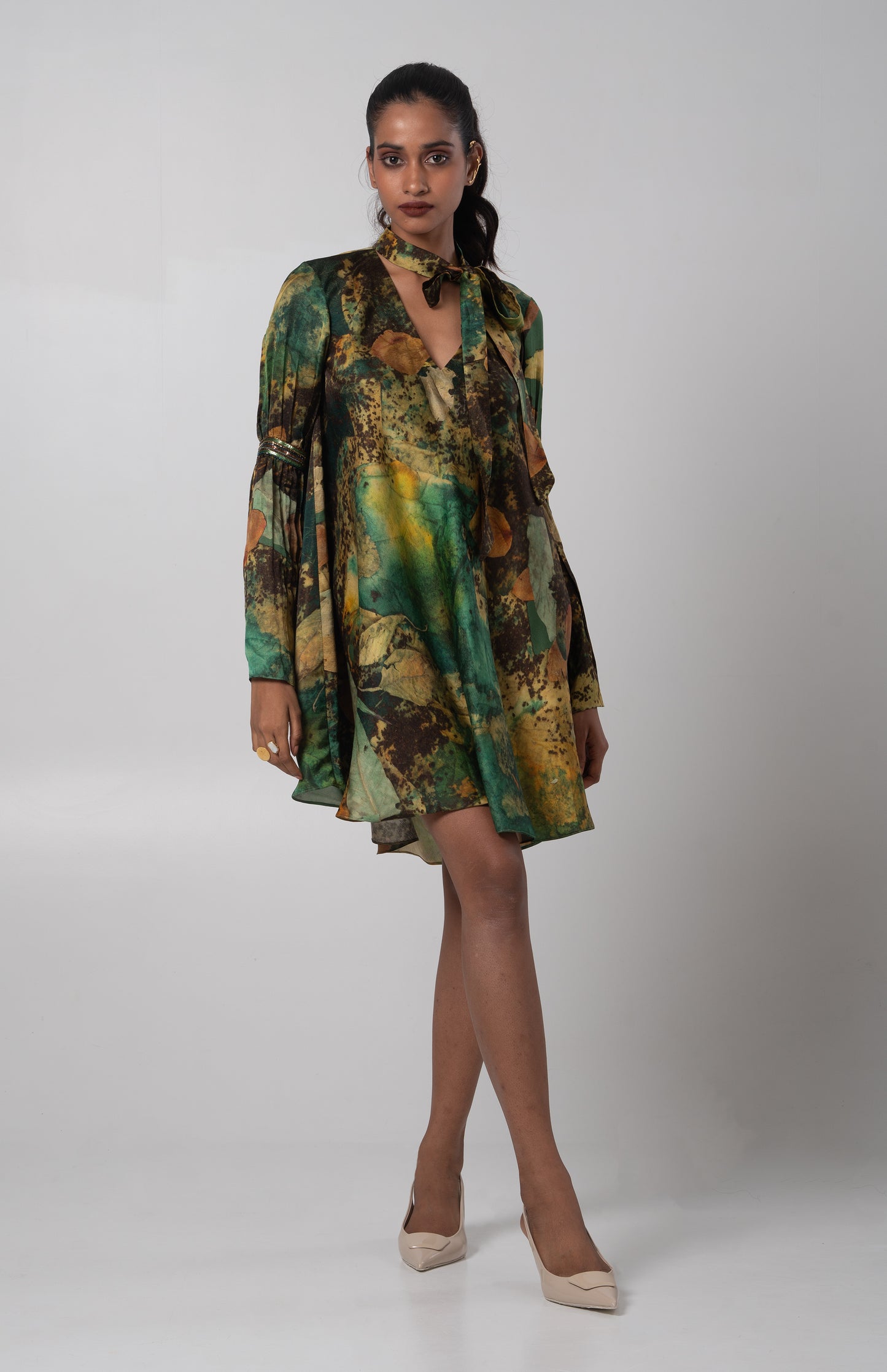 A short, bias cut dress with a tie up detail at the collar and hand embroidered panel at the sleeve.