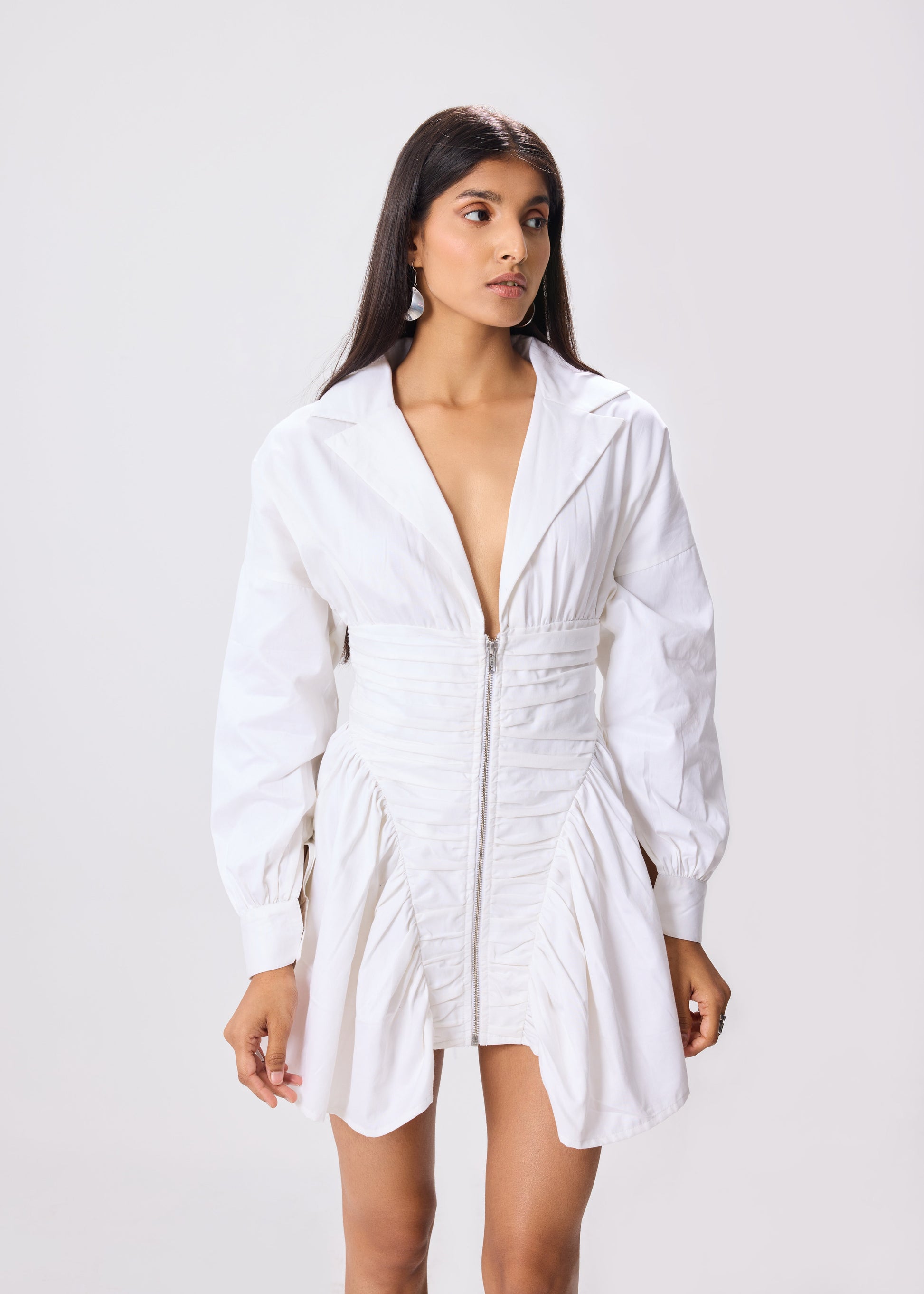 Our Victoria Dress falls straight out of the victorian era, with a contemporary twist. A classic broad lapel that gives a low cut neck, with a ruched body that is a mix of soft yet street elements. The side cuts in the shape of vintage corsets, with fabric gathered on sides to create volume. A metallic zipper to elevate the whole look.