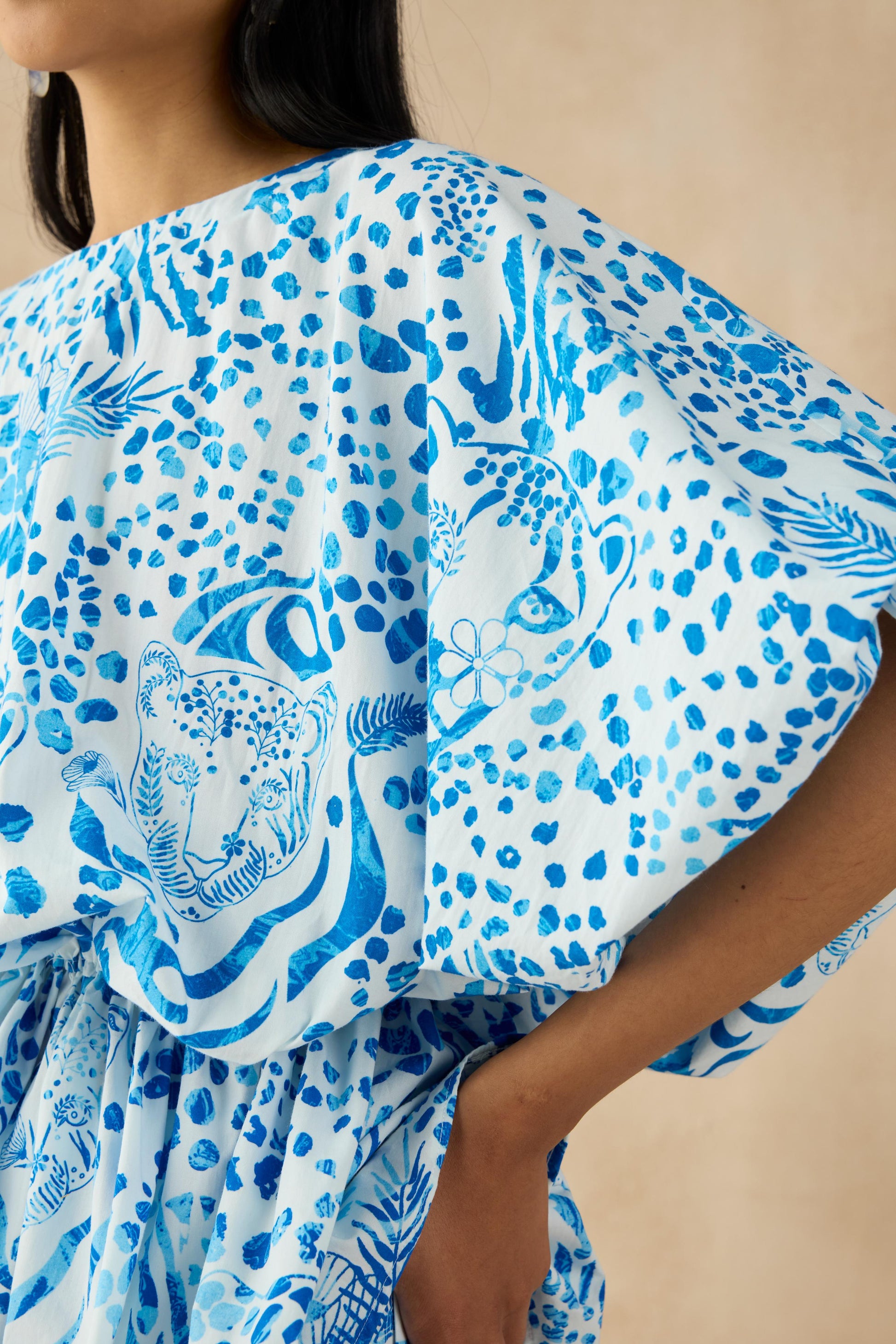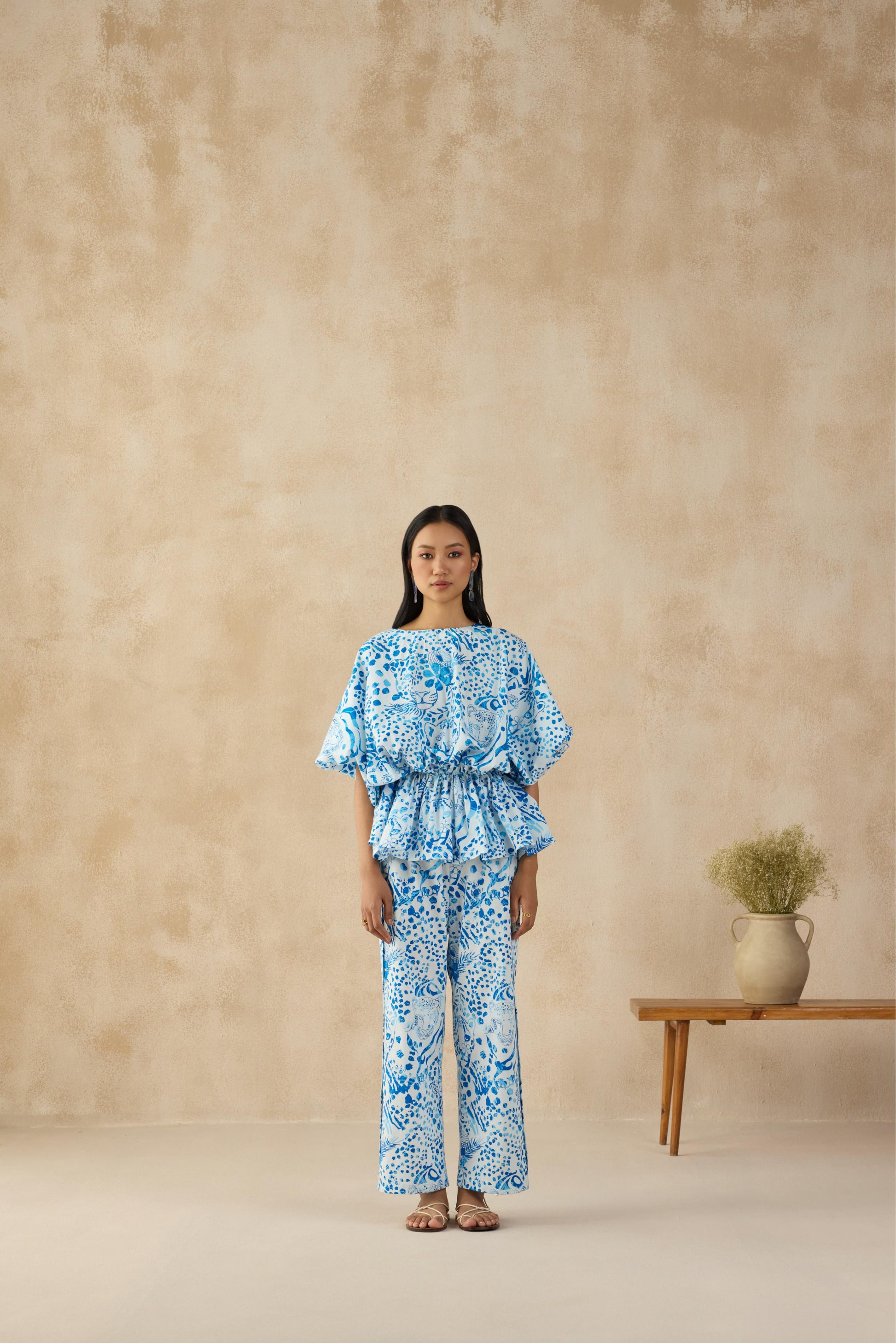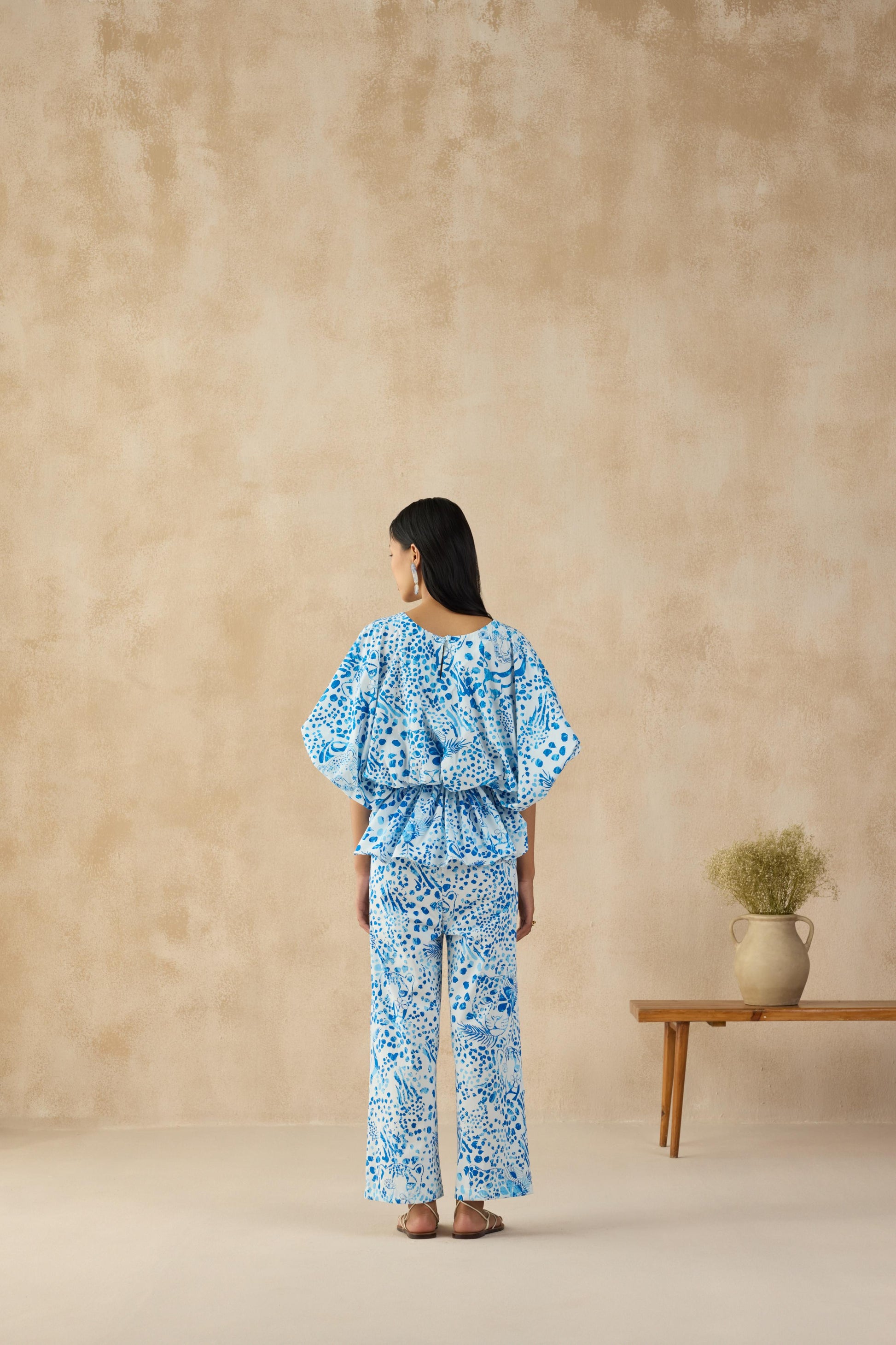Step into effortless style with the Seychelles Set, featuring a striking blue and white panther print. Crafted from breathable cotton poplin fabric, the drawstring top adds a stylish detail at the waist, while the straight-fit pants offer comfort and elegance.