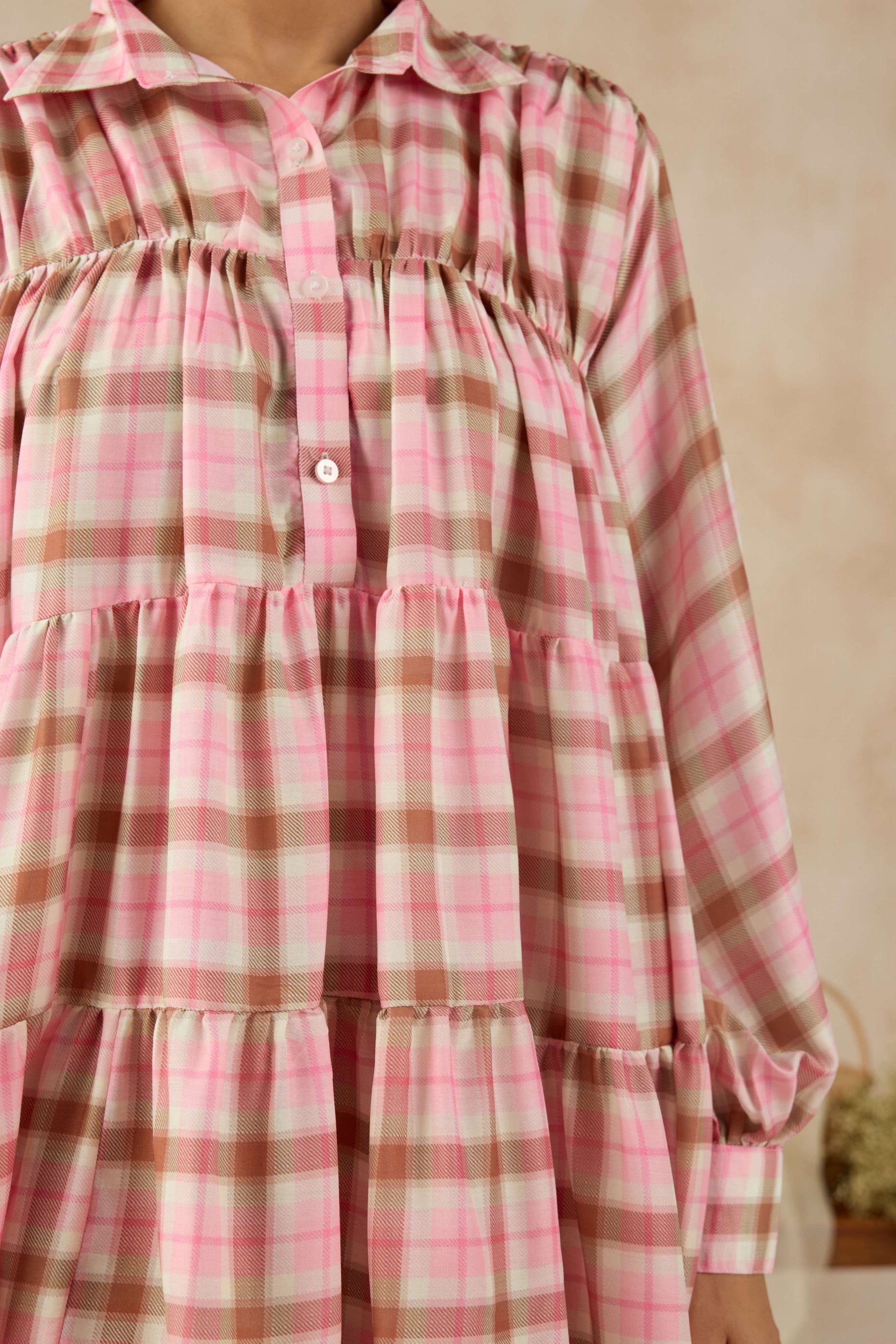The Vietnam Dress is a breezy, feminine silhouette crafted in soft, breathable cotton with a charming pink plaid pattern. Designed for effortless style, this relaxed-fit dress features a tiered structure with delicate gathers, offering graceful movement with every step. The collared neckline with front button details adds a hint of sophistication, while the billowy long sleeves with elasticated cuffs enhance its comfort.