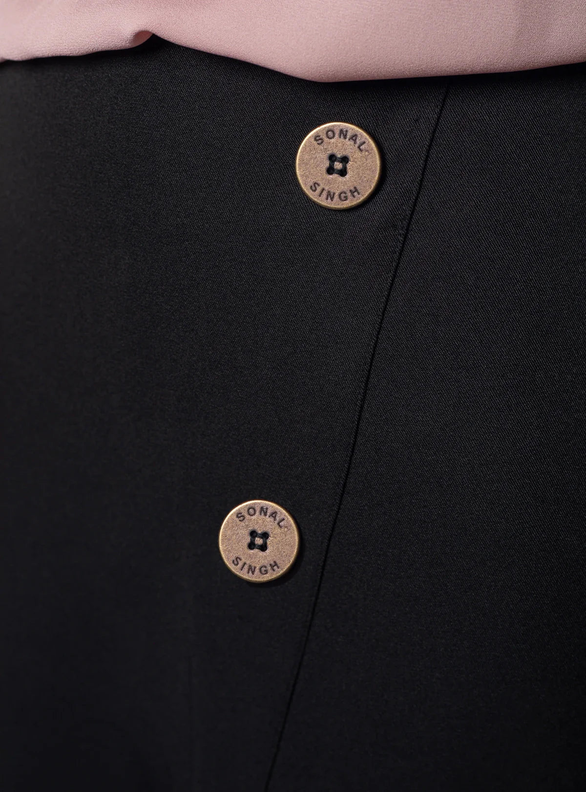 Black skirt never goes out of style! Our midi skirt with side slit and brass button-front is a wardrobe staple for office and evening events.