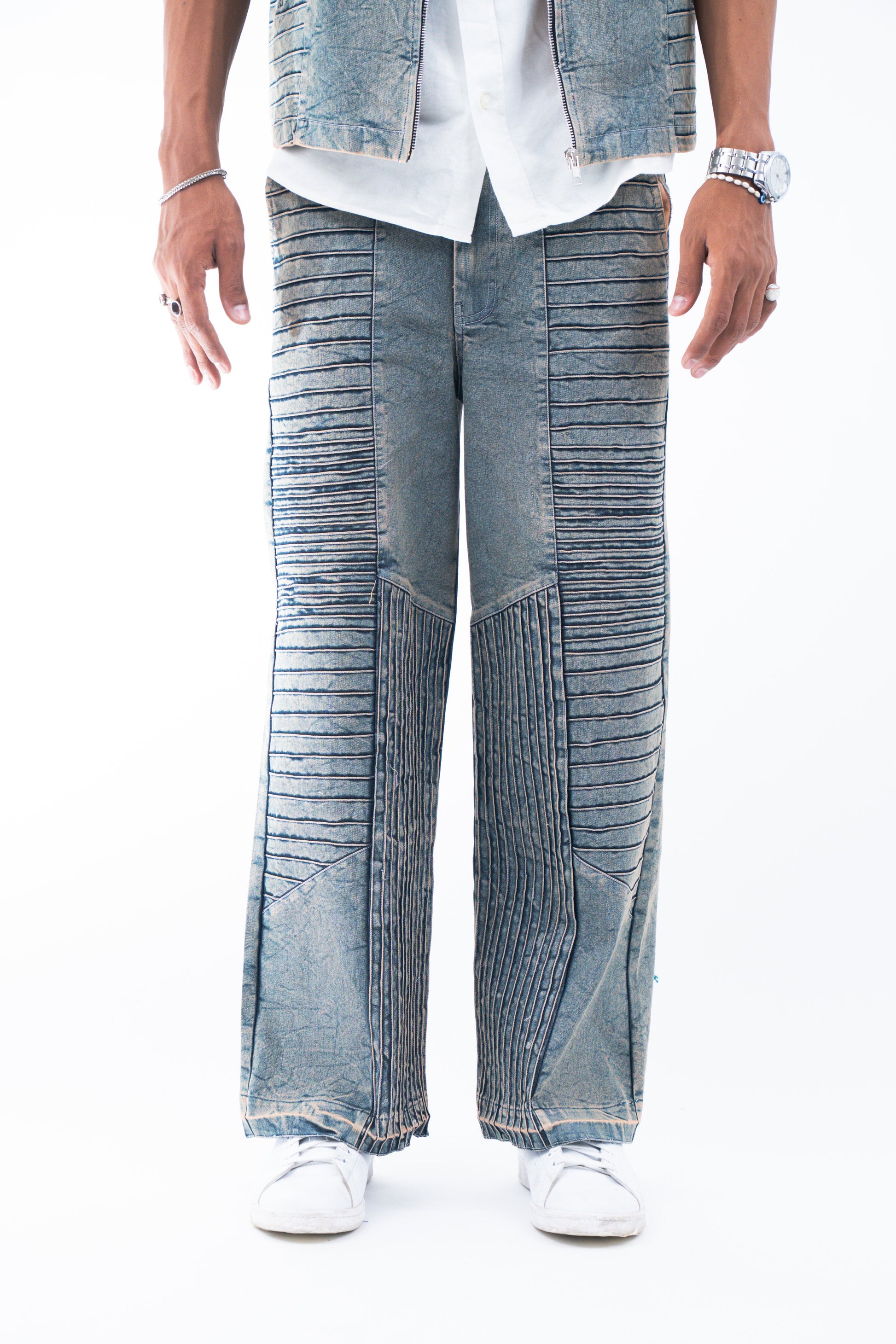 This premium blue denim jeans features panelling detail all over the body along with our signature gradation pintucks in vertical and horizontal manner. Each pintuck is meticulously crafted in a gradient pattern to give it a stimulating texture and visual effect. The denim is enhanced through the enzyme wash to give it a vintage appeal. Front button closure, front and back pockets, as well as added elastic on back for ease and comfort.