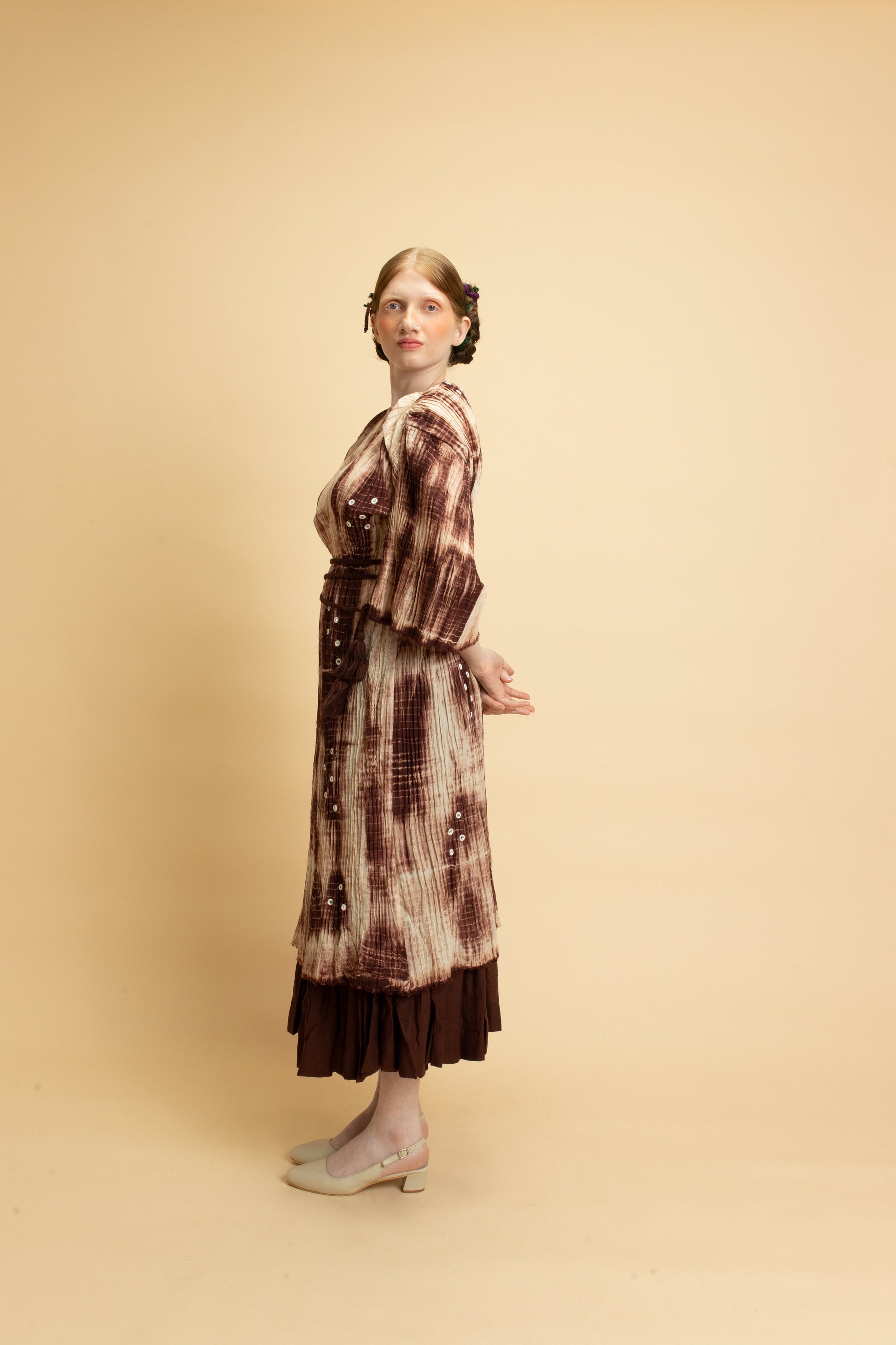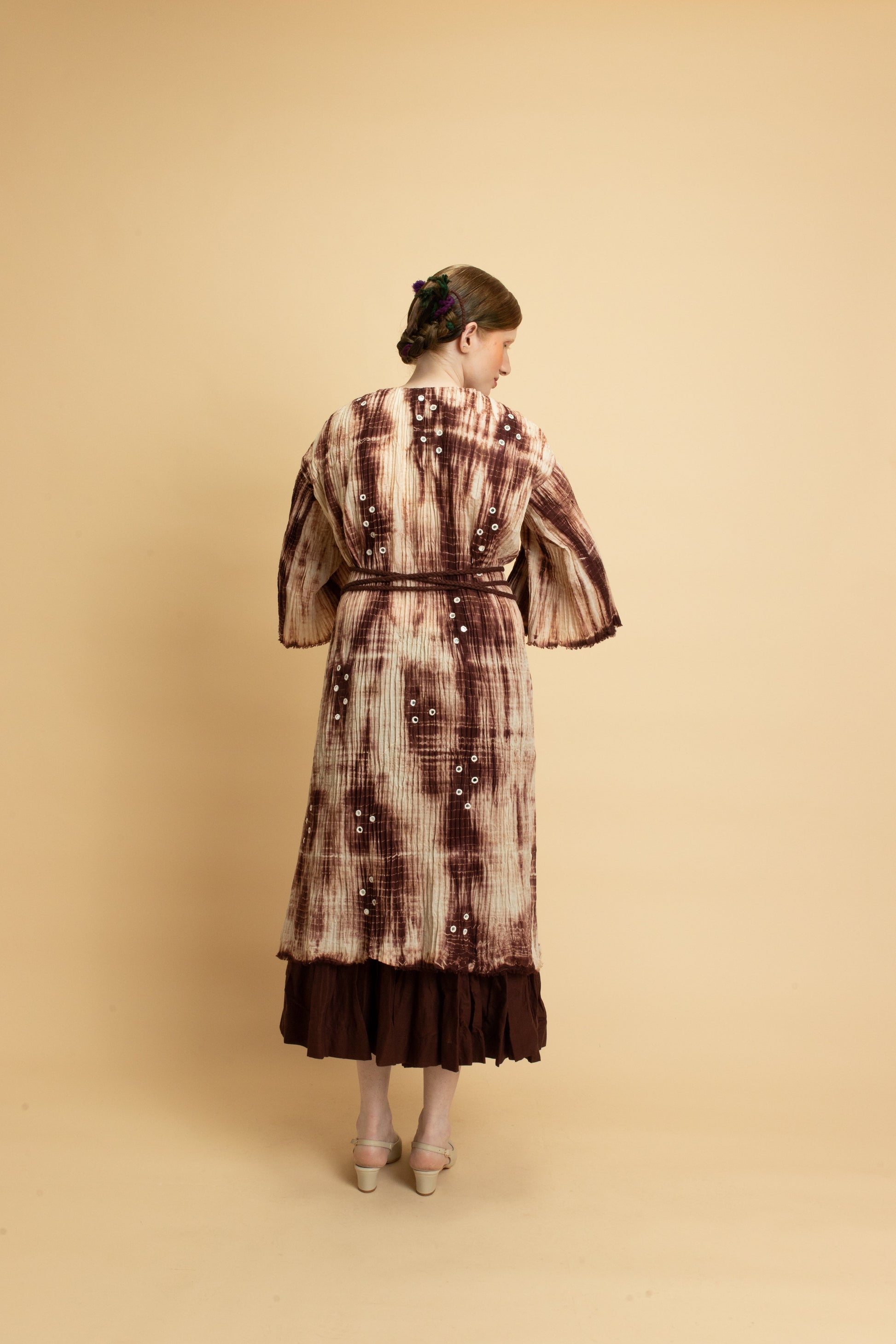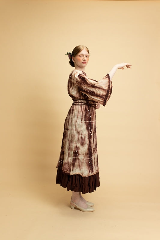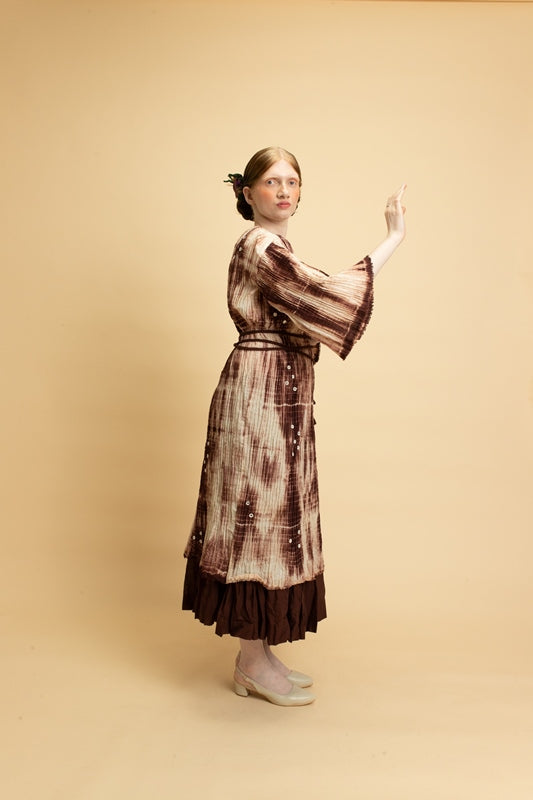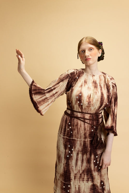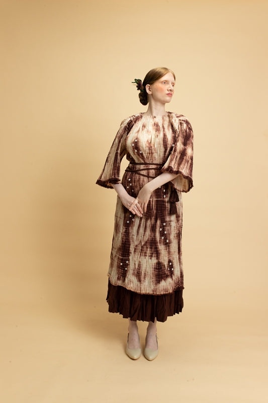 The Moon collection is created using soft cotton mal-mal that is heat pleated to create texture. The fabric is then tied and dyed into different colors of Virgo brown. The tunics are enhanced using hand mirrorwork embroidery details.