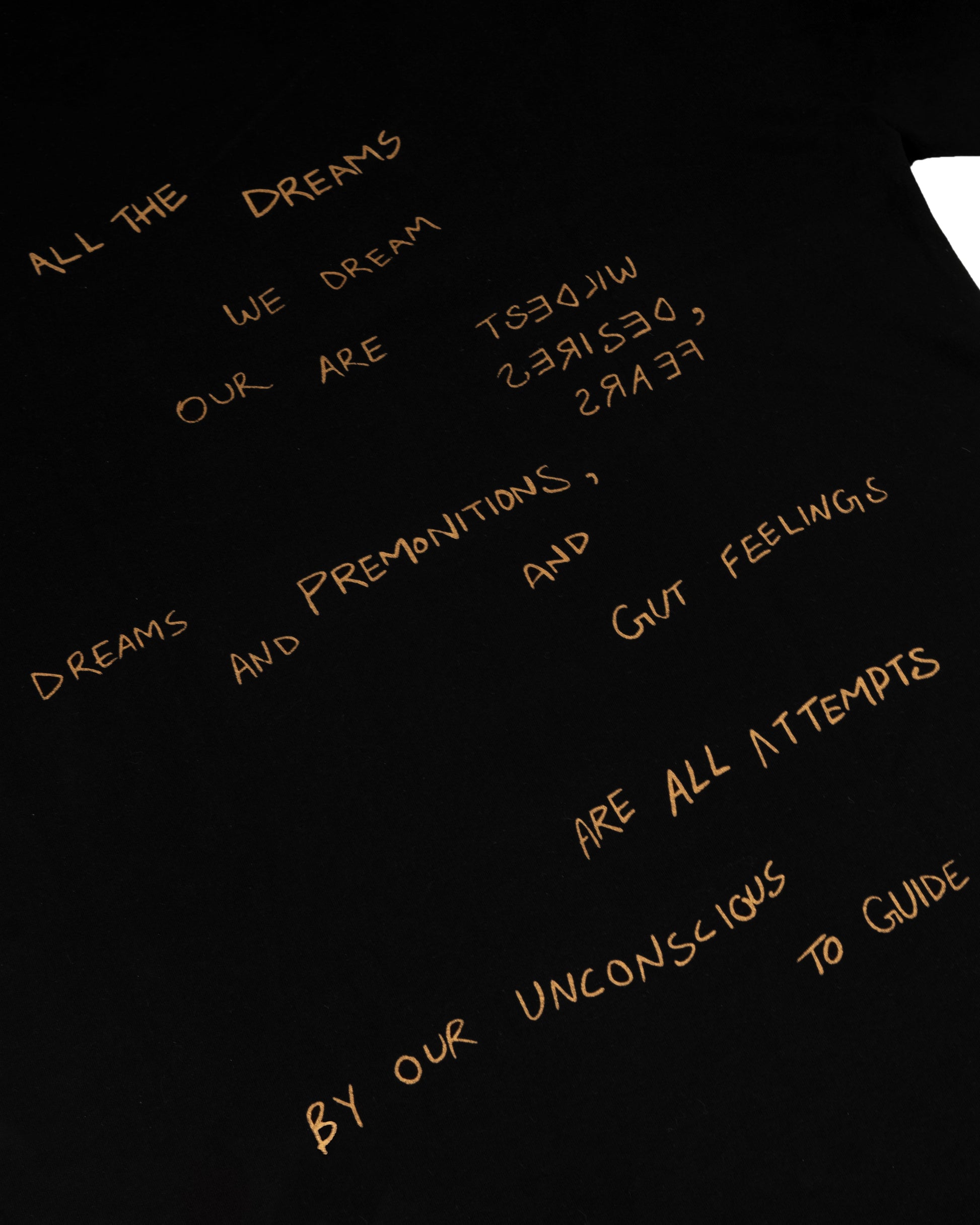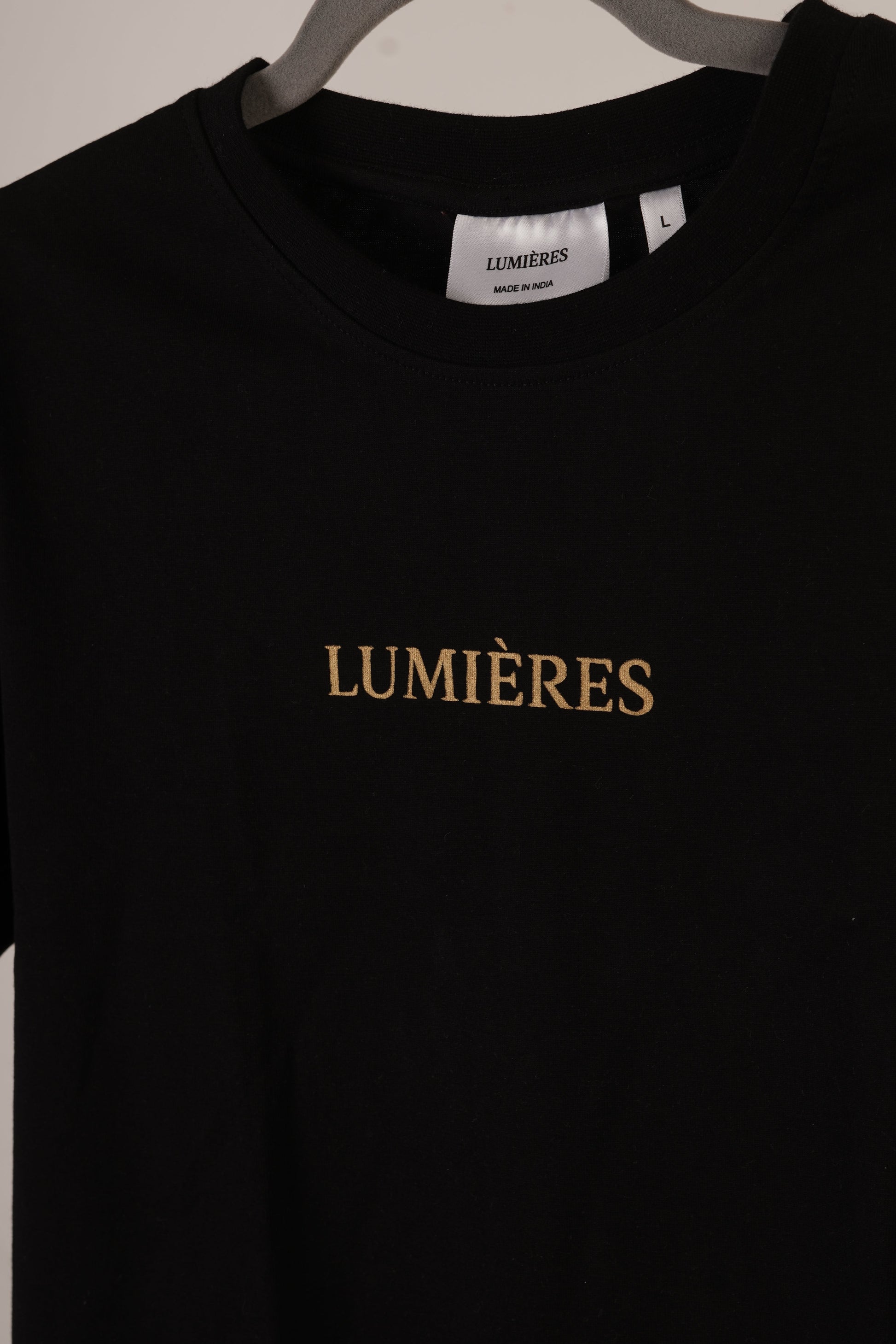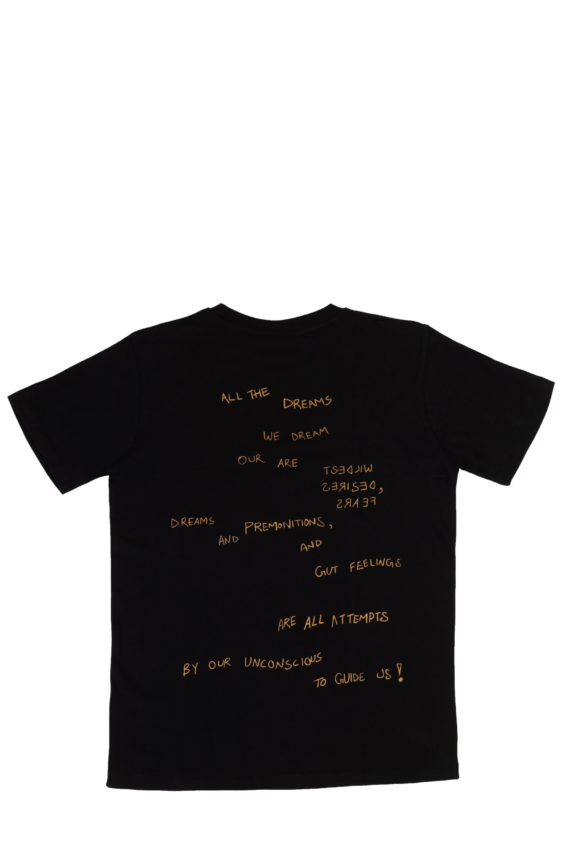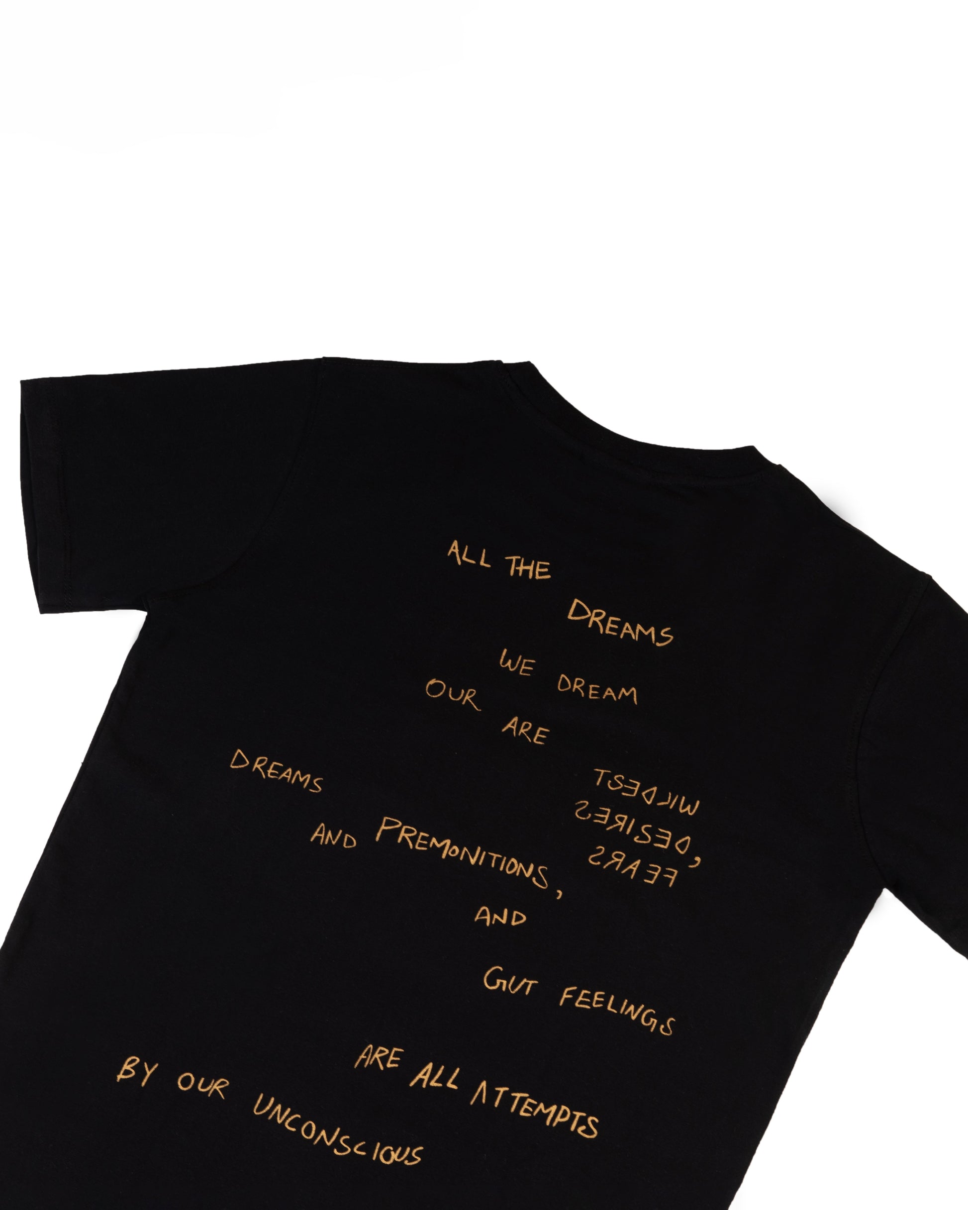 Unisex Black Regular Fit T-Shirt with crewneck and fitted sleeves. Golden Brand logo printed at Front and Golden text printed at Back. This design delves around the subconscious.