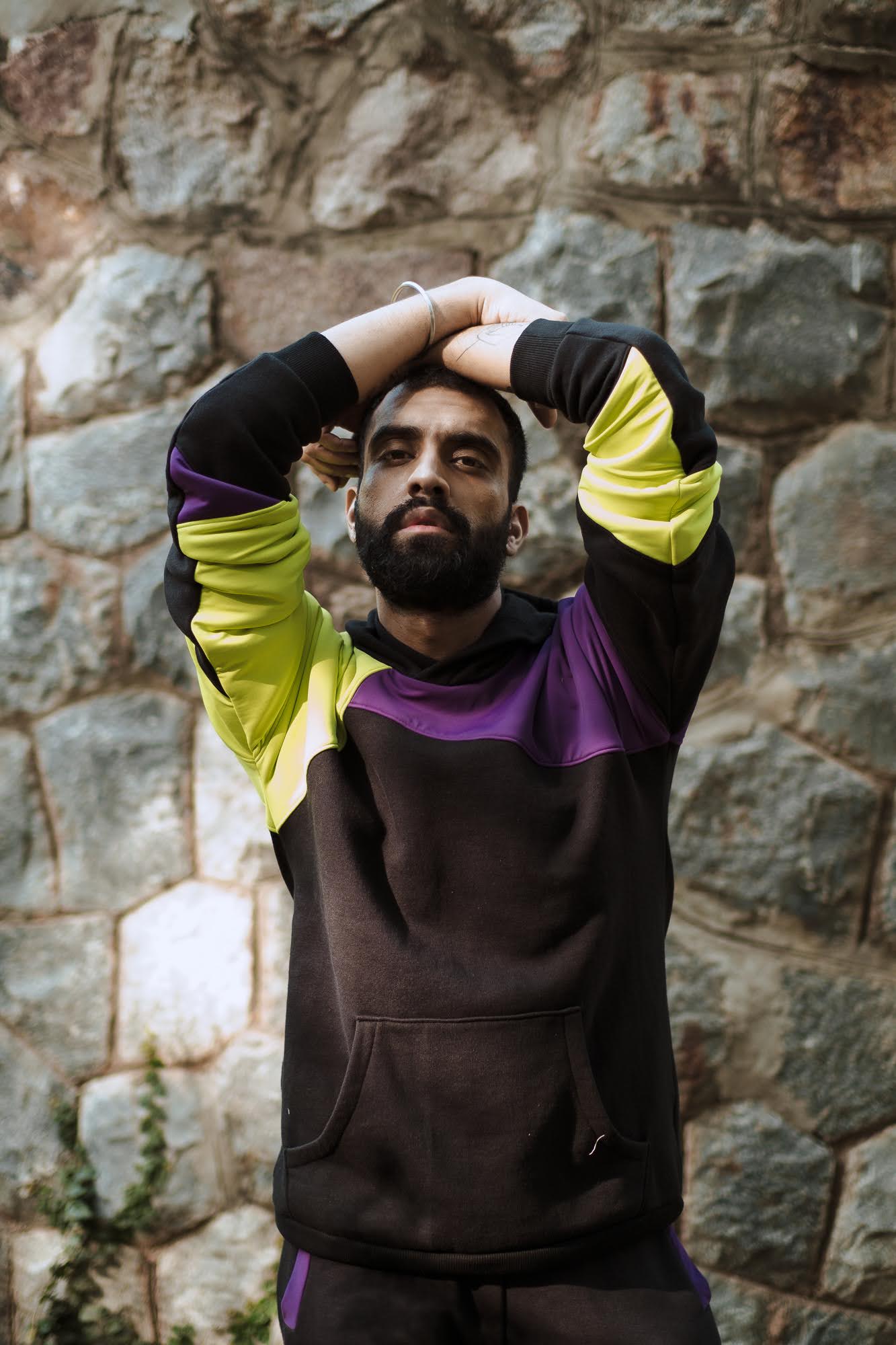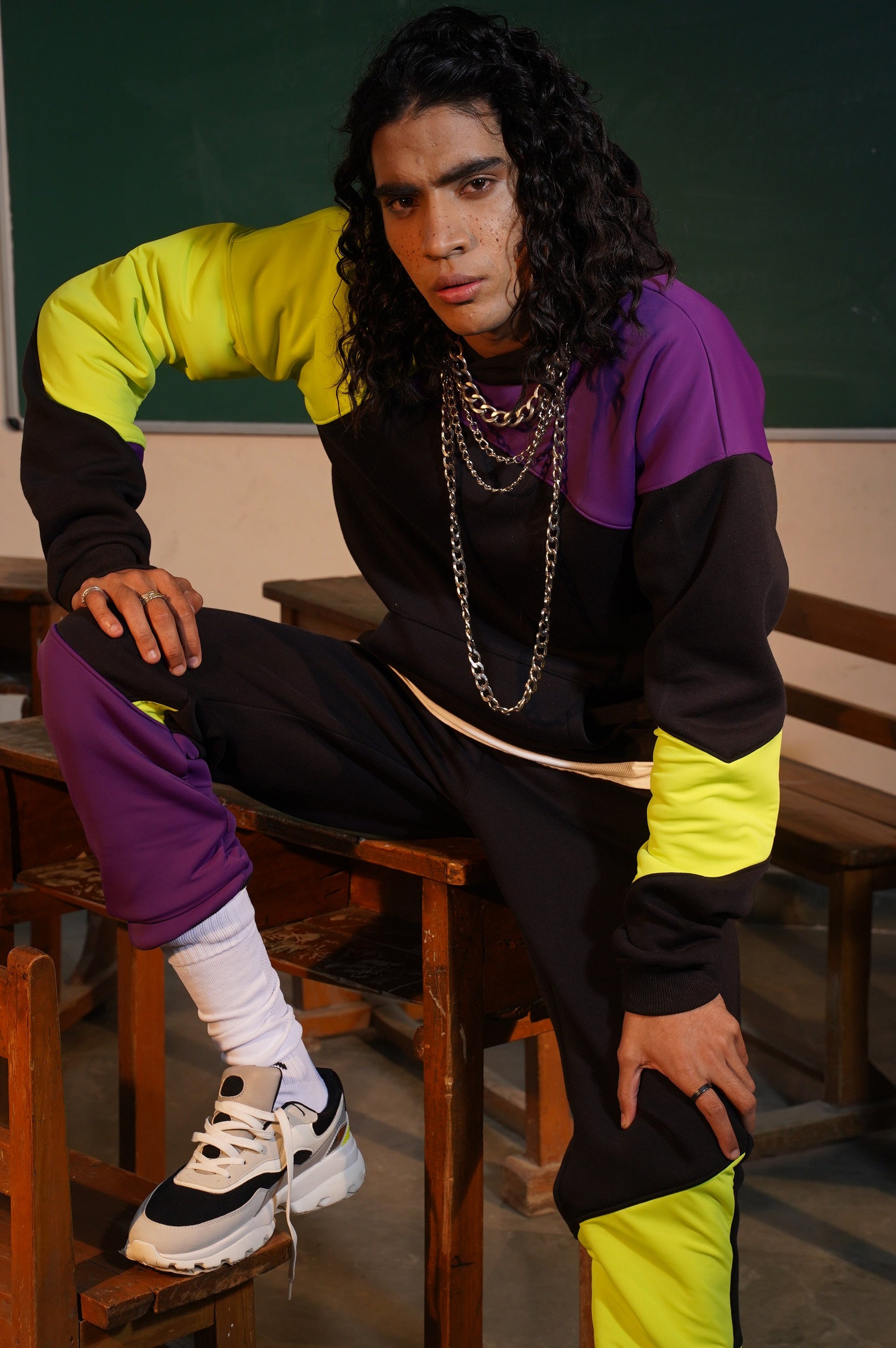Colour blocking hoodie with long sleeves. Featuring a holographic neon print on the hood ‘wah pah’ and finished with ribbed trims.
