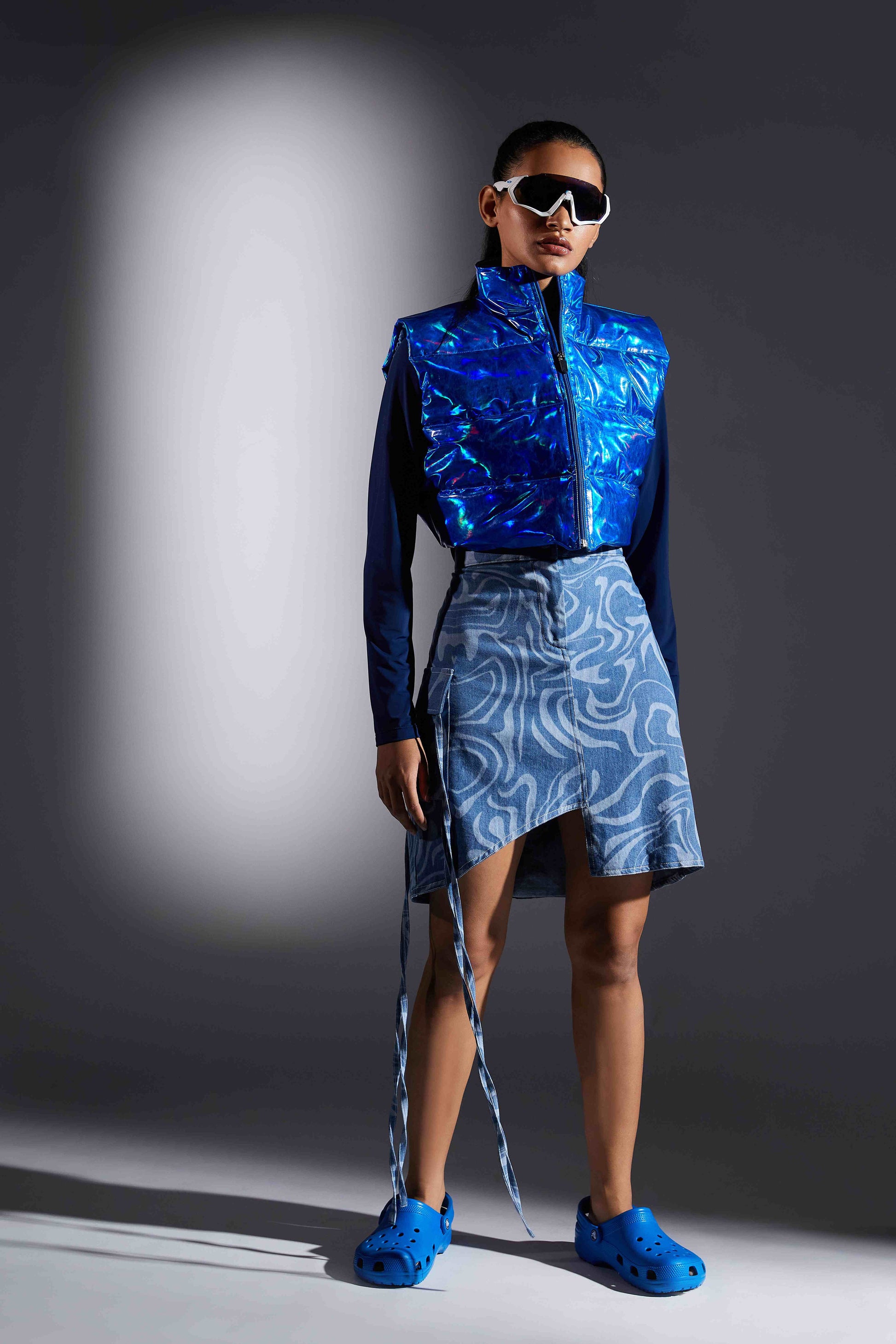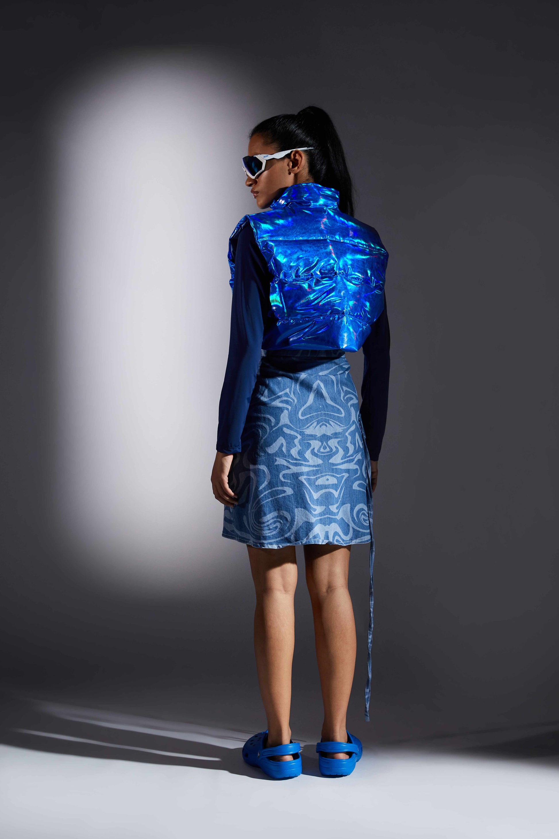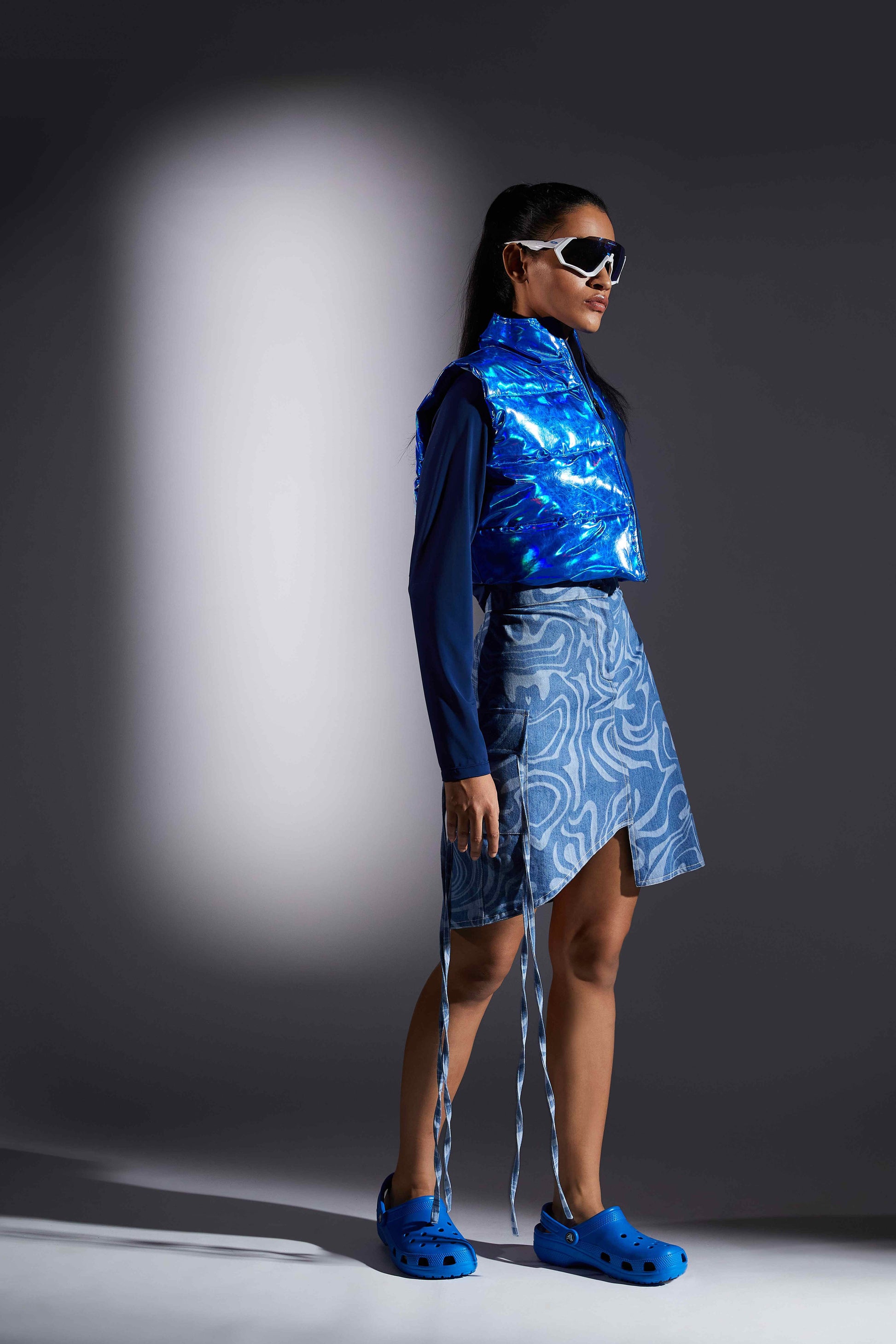 Wavy Denim Skirt with fringe patch pocket on the side. Finished with an asymmetric hem line. This collection is in collaboration with Muskaan. An NGO for specially abled. 15% of our net profits will be donated for their welfare.