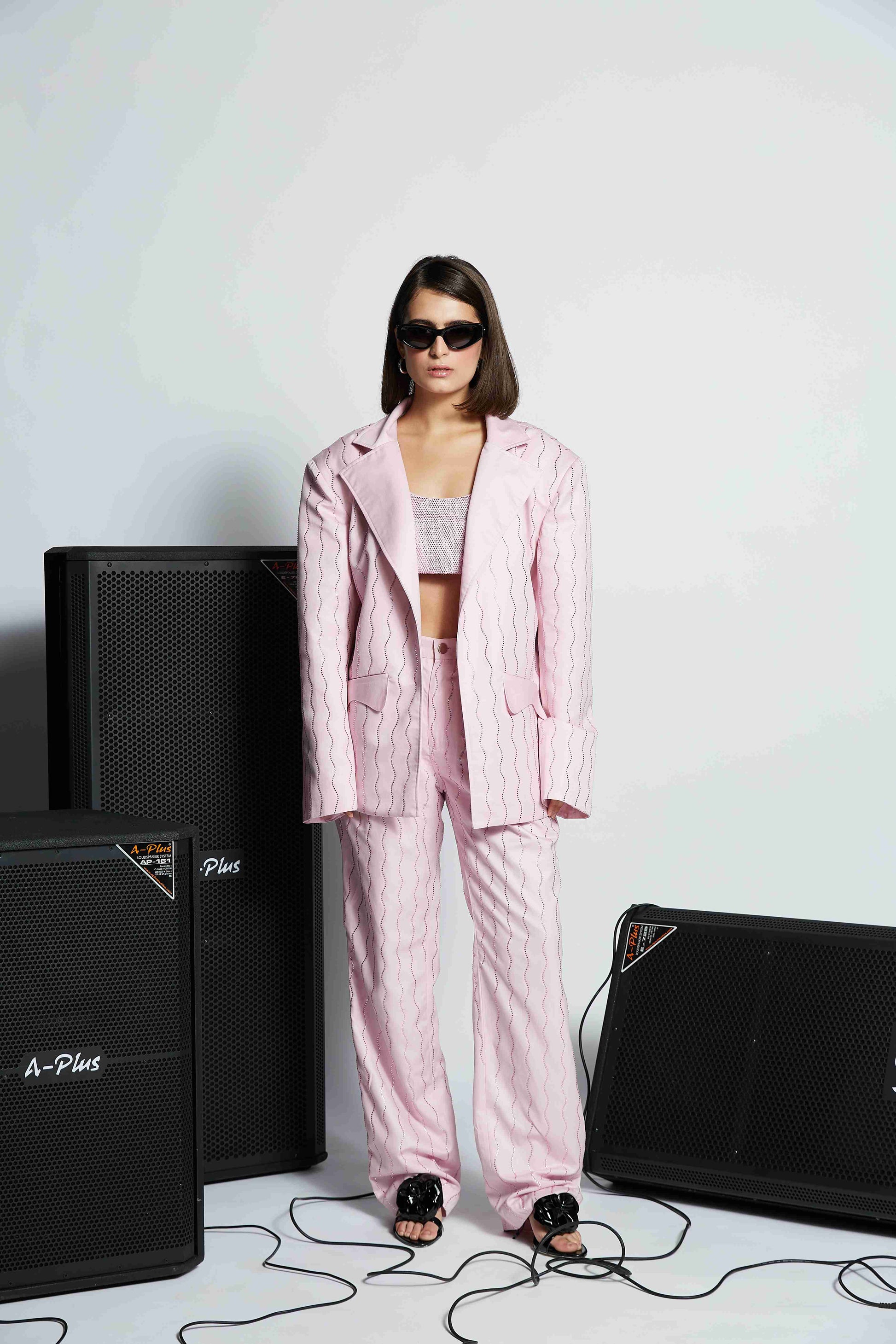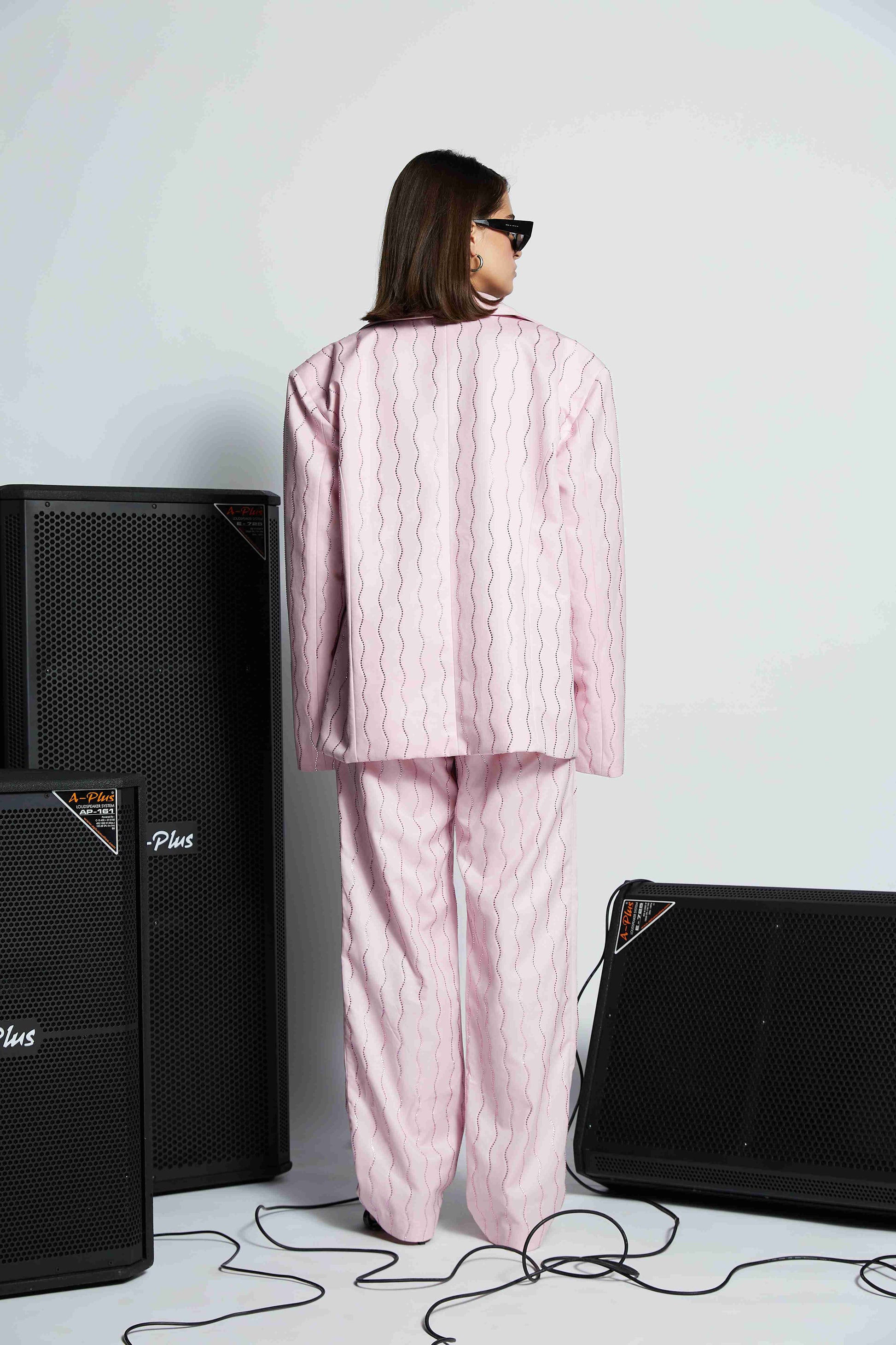High-waisted trousers detailed with hand embellished Swarovski crystals designing the wavy lines pattern with front fastening with metal closure. For a complete set, wear with its matching item.