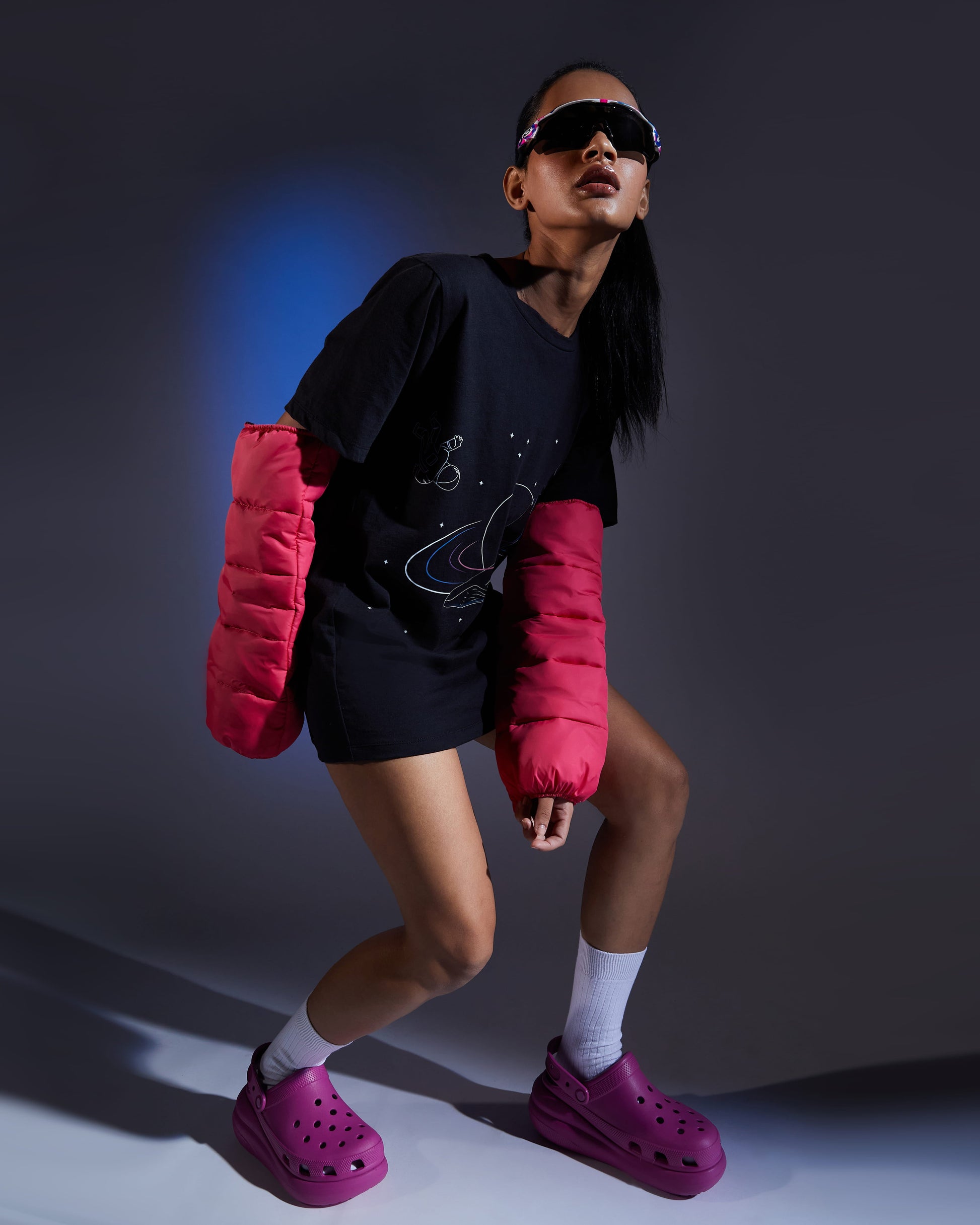 Round Neck short sleeve T-shirt dress with "whale galaxy print" along with a typography at the back "where yaa from spacemen". This collection is in collaboration with Muskaan. An NGO for specially abled. 15% of our net profits will be donated for their welfare.