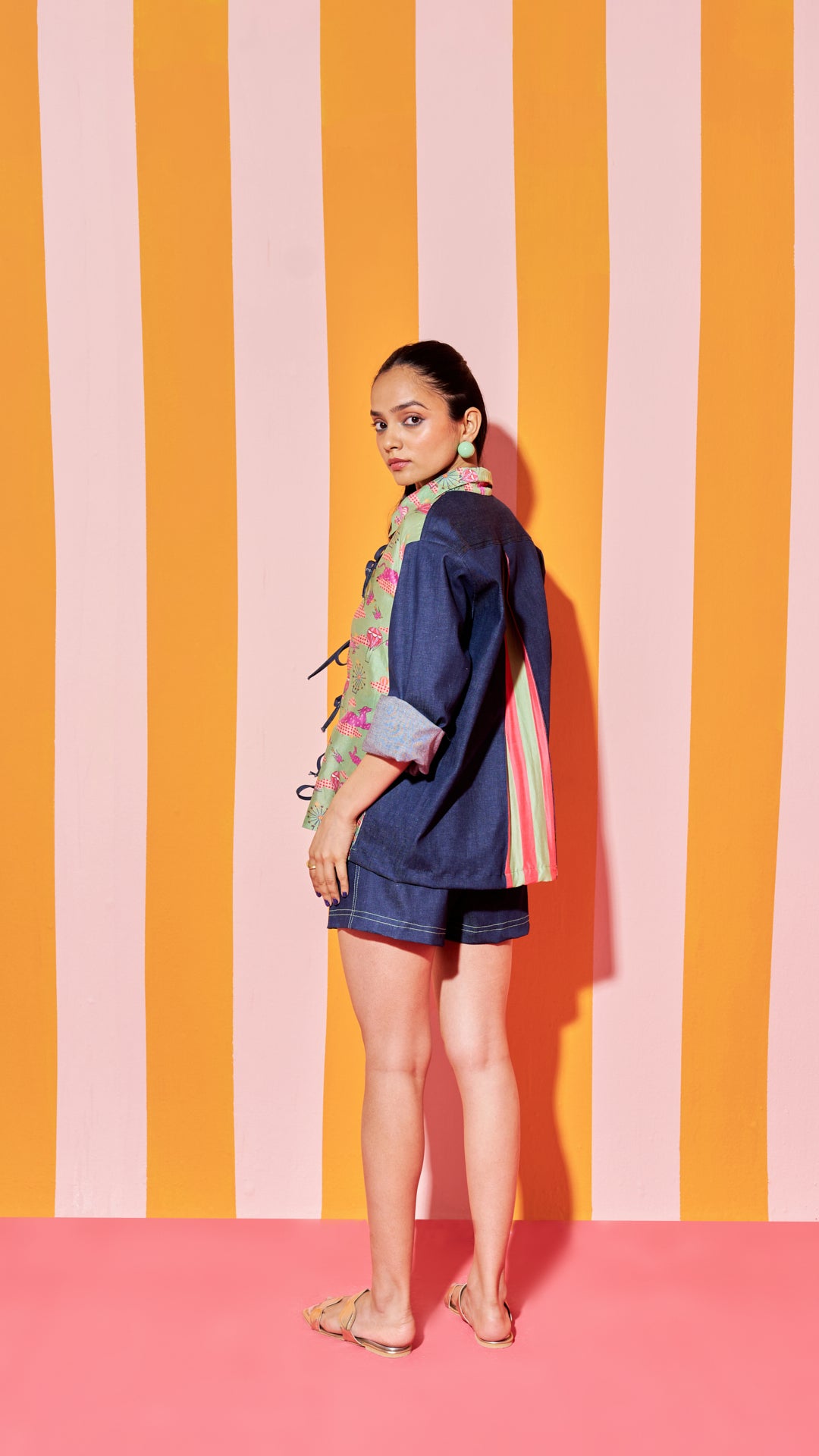 Collared shirt with long denim sleeves. Tie up detailing in the front and invert box printed pleat at the back.