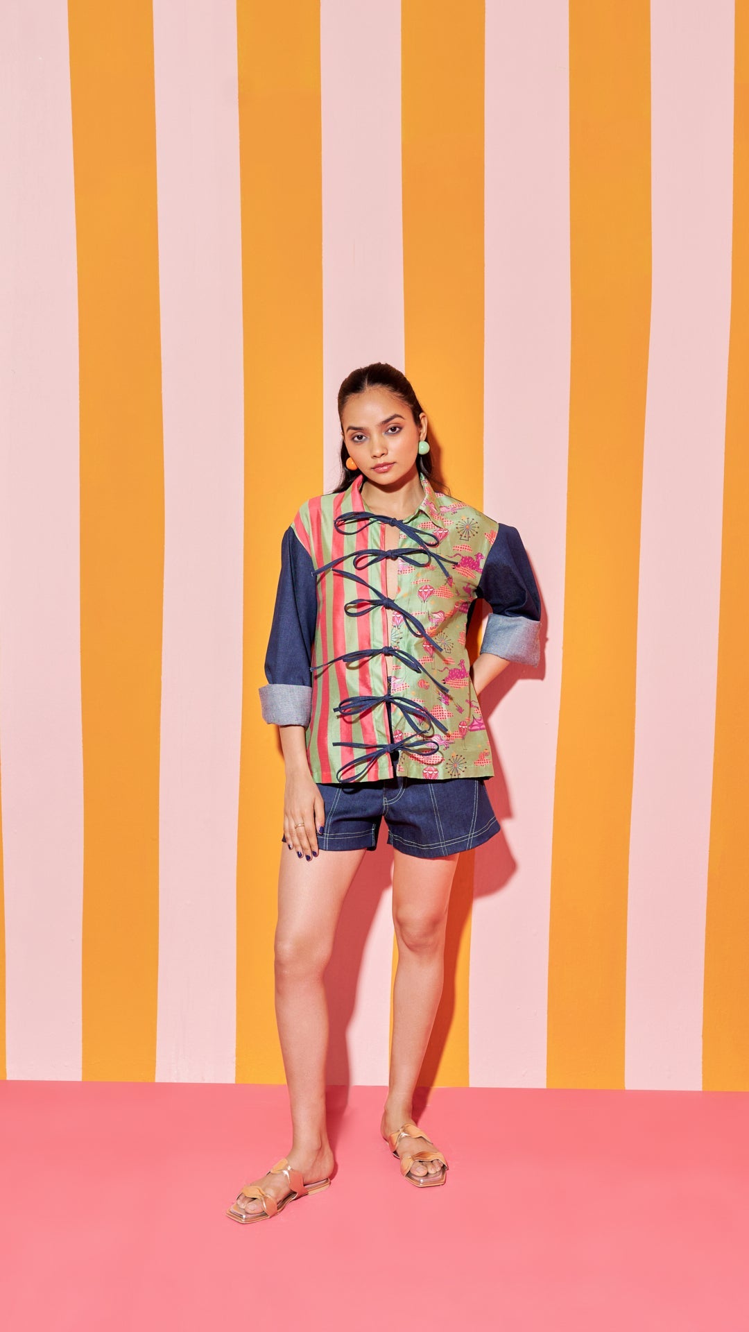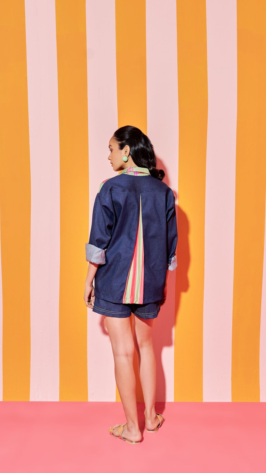 our Whimsy shorts comes with contrasting stitching detail. Front zip and metallic button fastening.