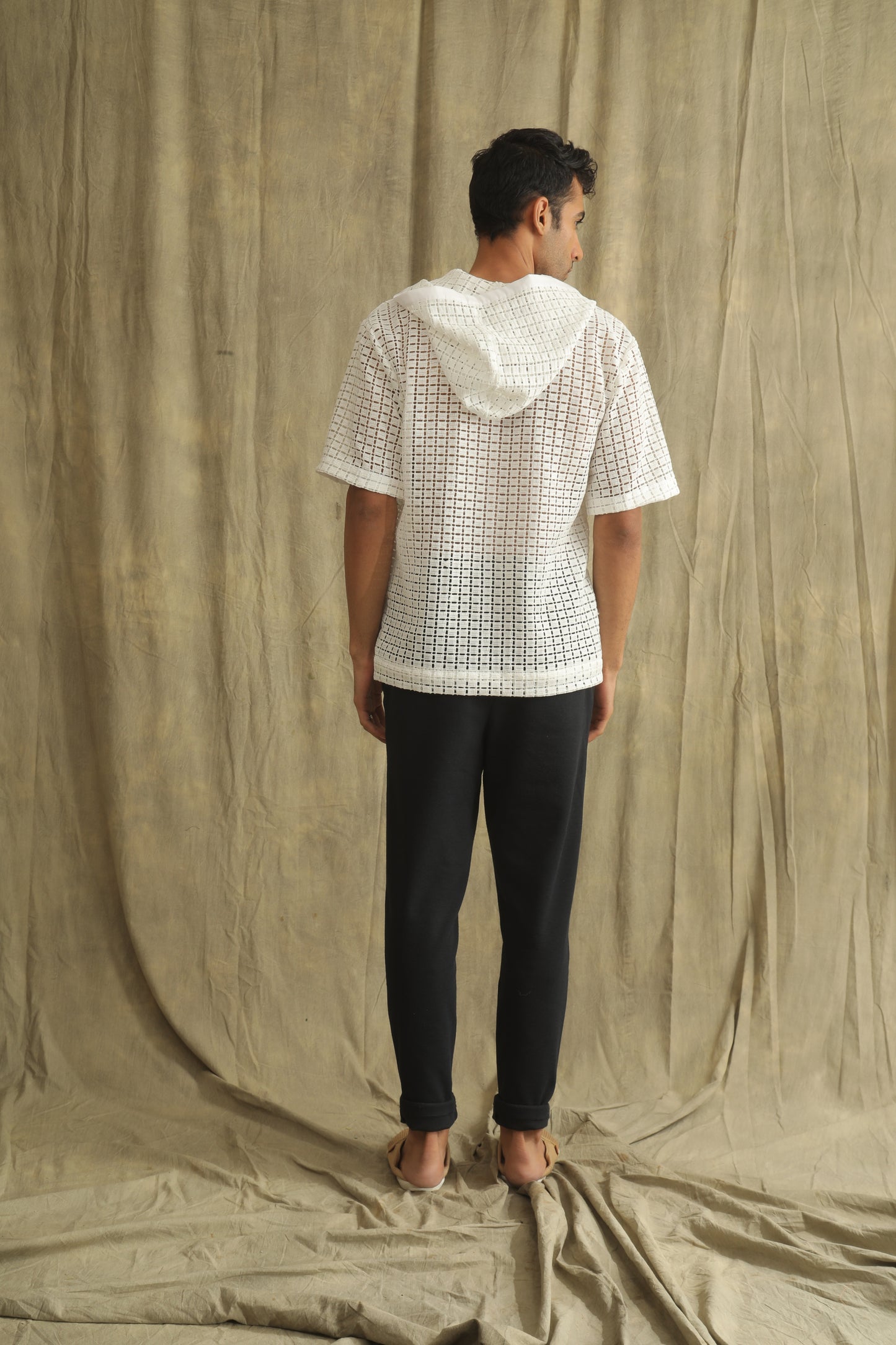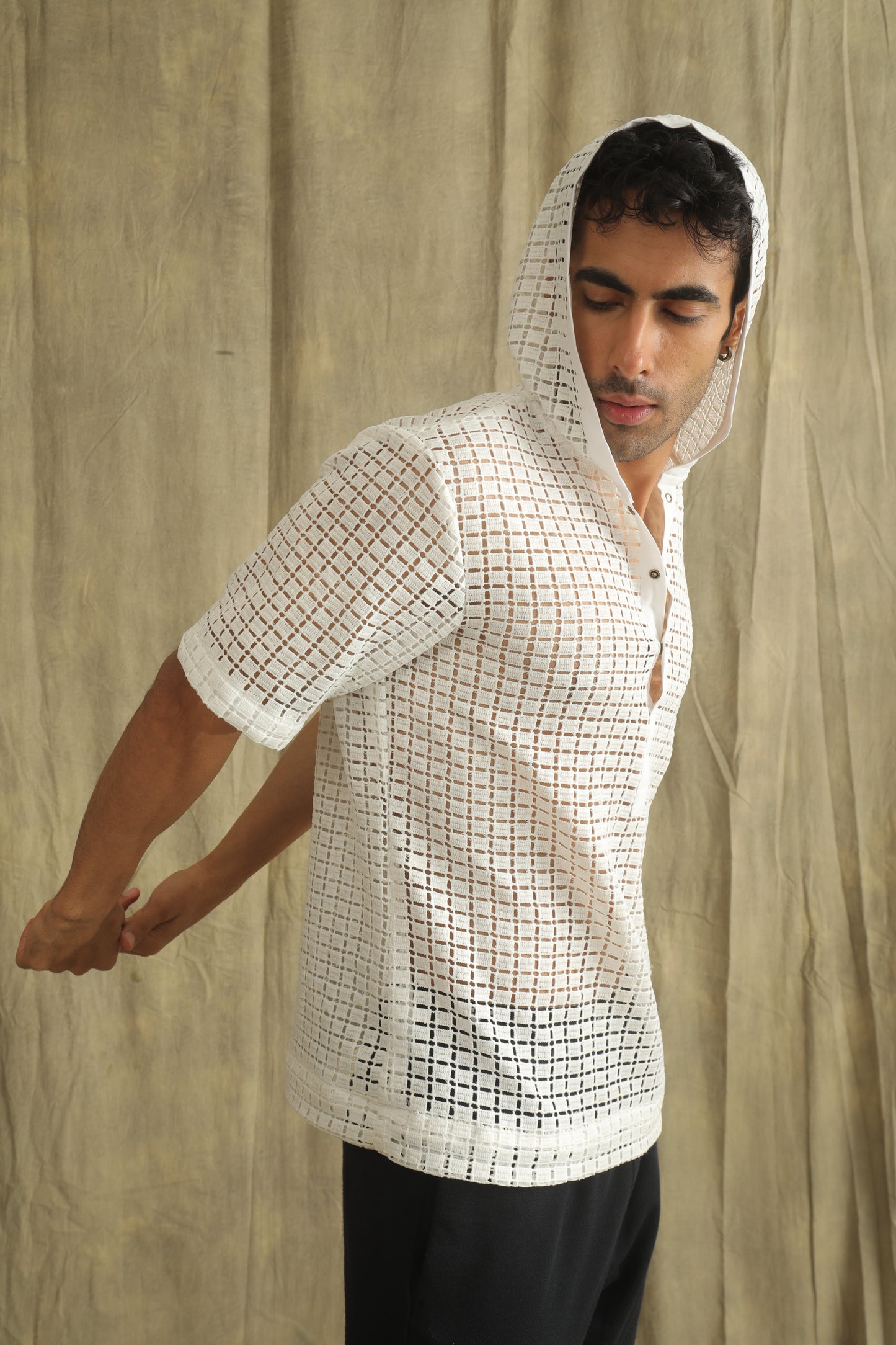 The men's crochet hoodie is a modern and trendy garment that combines style with comfort. Featuring an eye-catching square pattern, it exudes contemporary flair. This hoodie is perfect for casual outings, adding a fashionable and unique touch to any outfit.