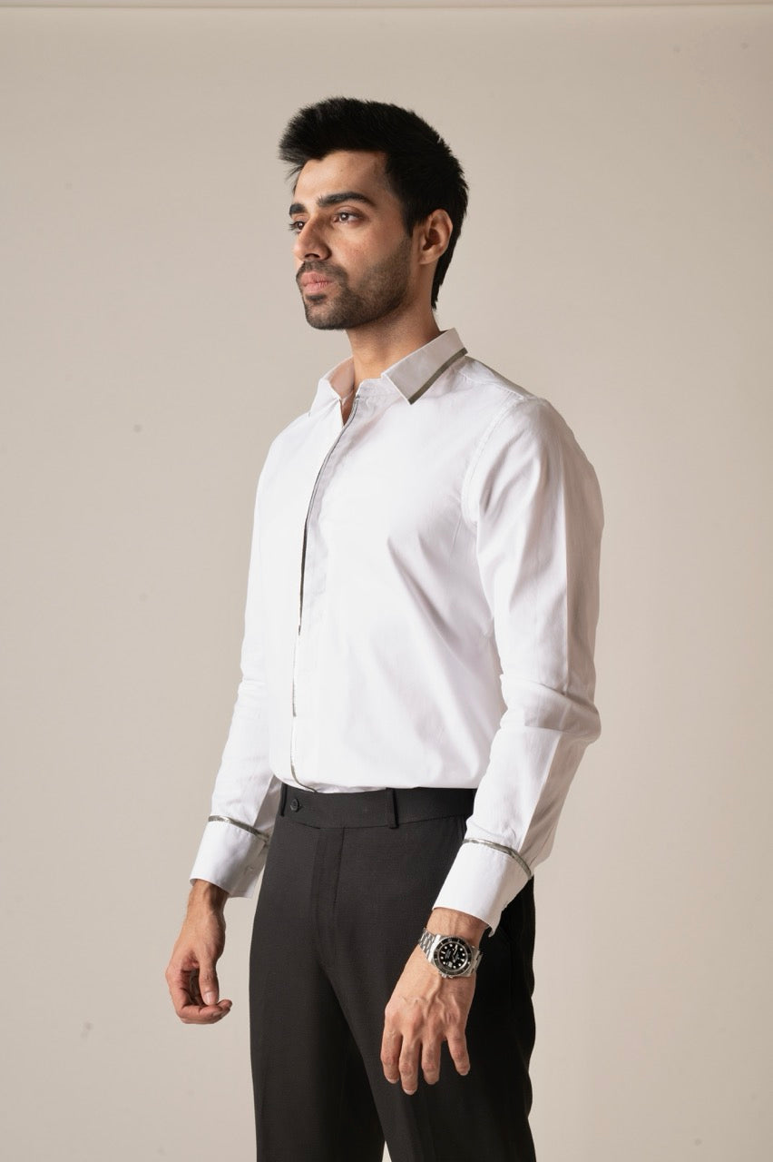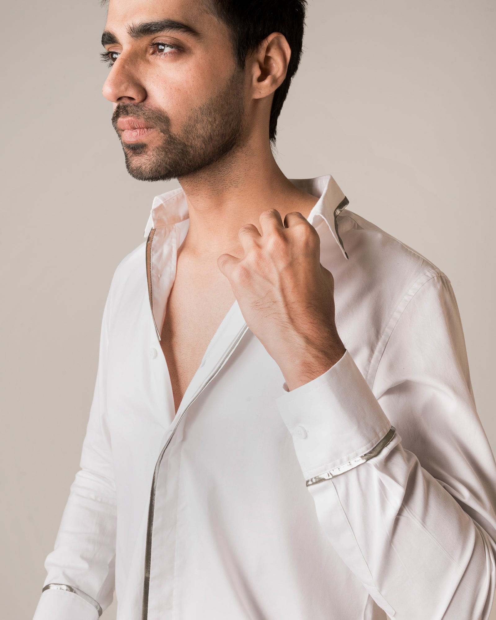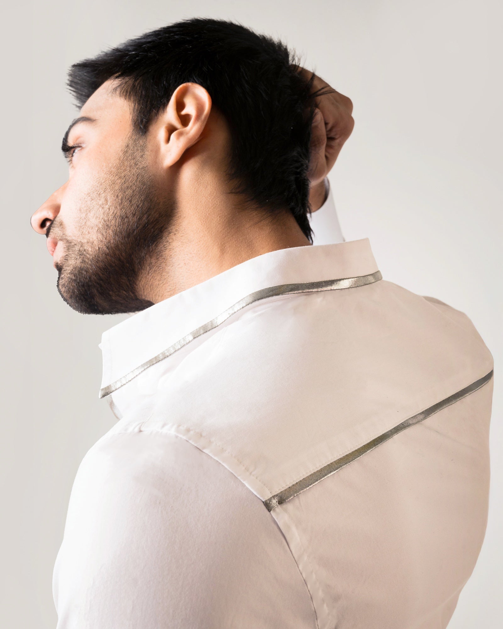 A classic white shirt with silver linings, that exudes understated sophistication. Pair it with black trousers for a formal dinner or black jeans for a night out at the club.