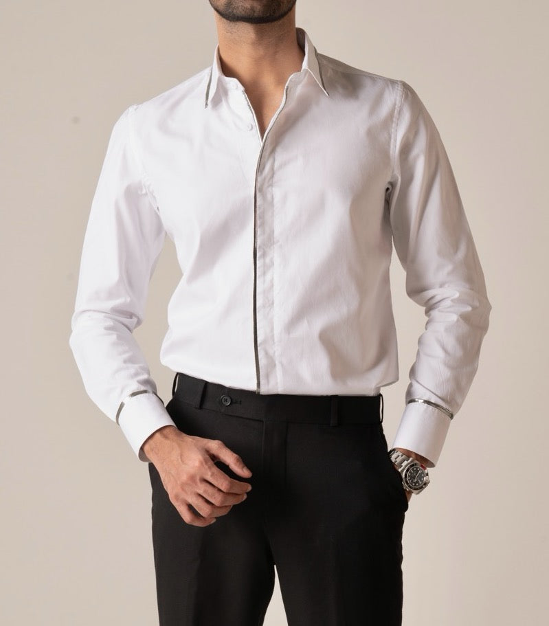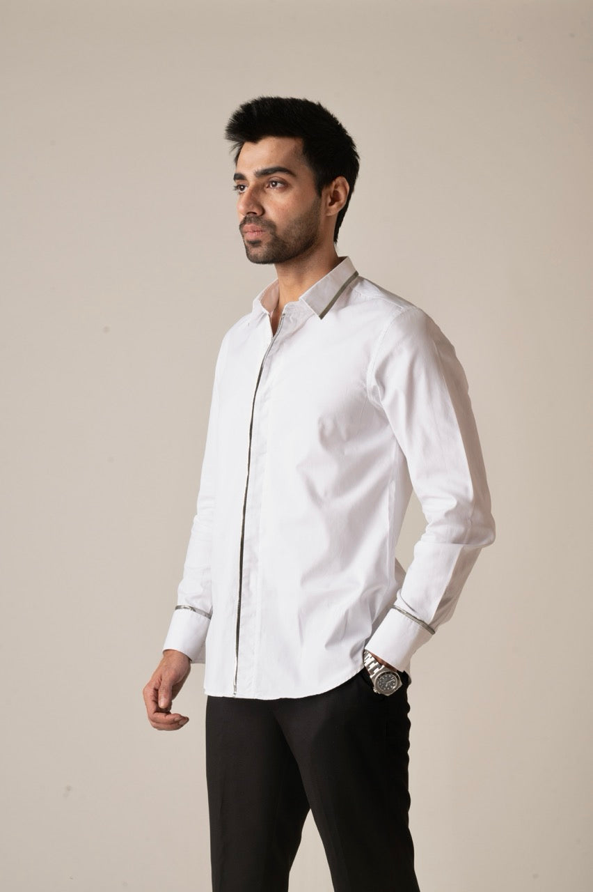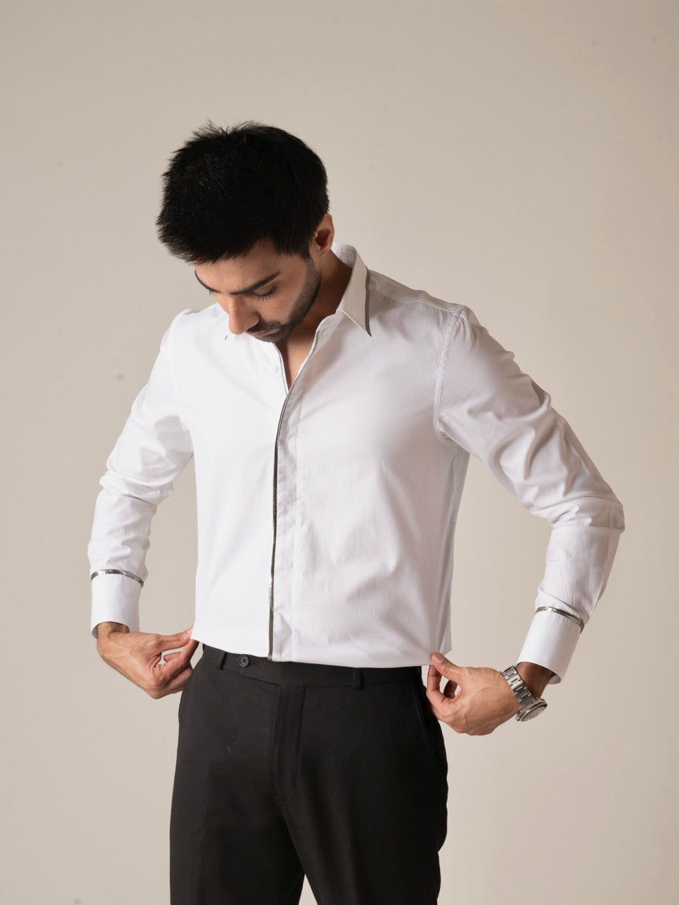 A classic white shirt with silver linings, that exudes understated sophistication. Pair it with black trousers for a formal dinner or black jeans for a night out at the club.
