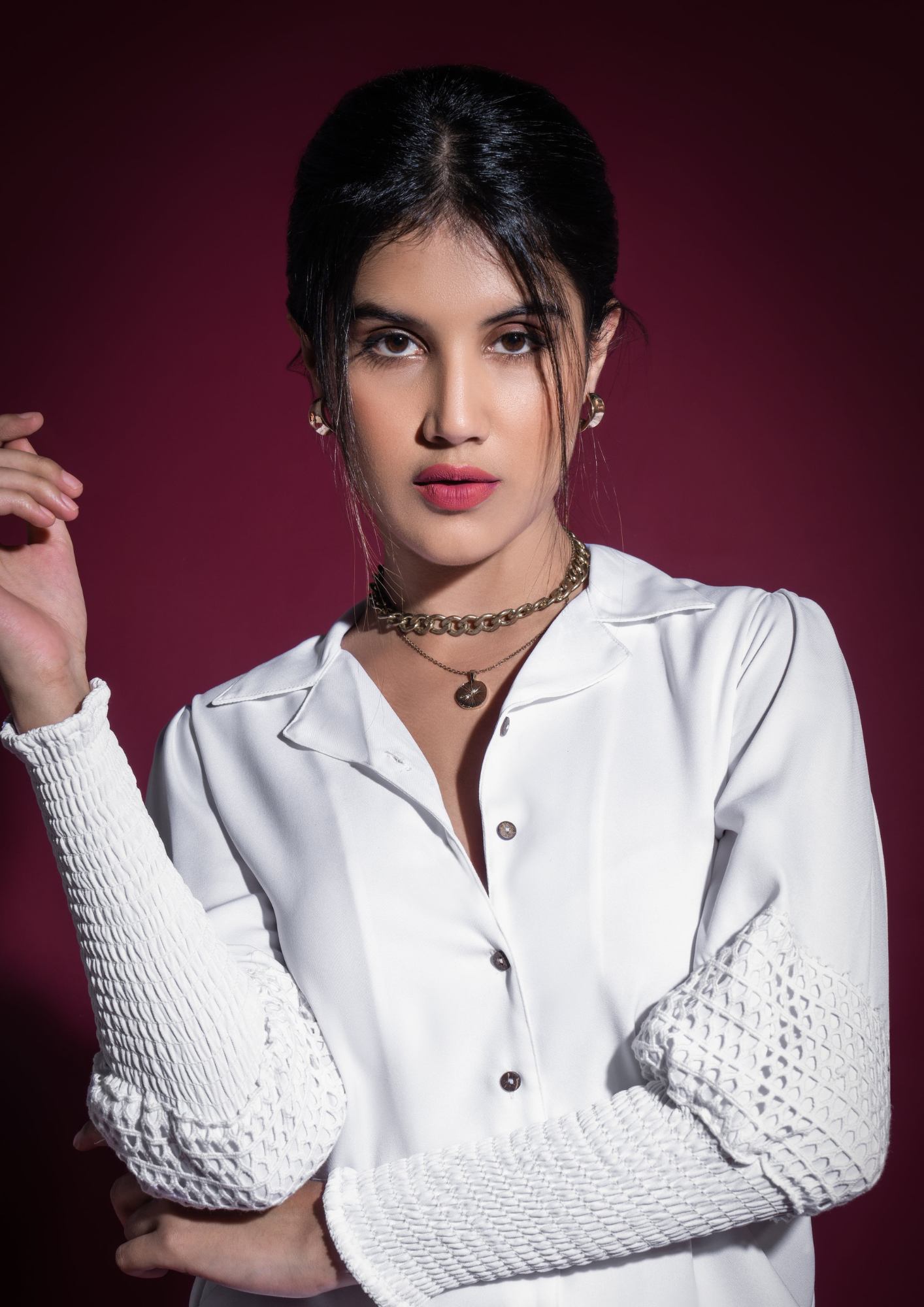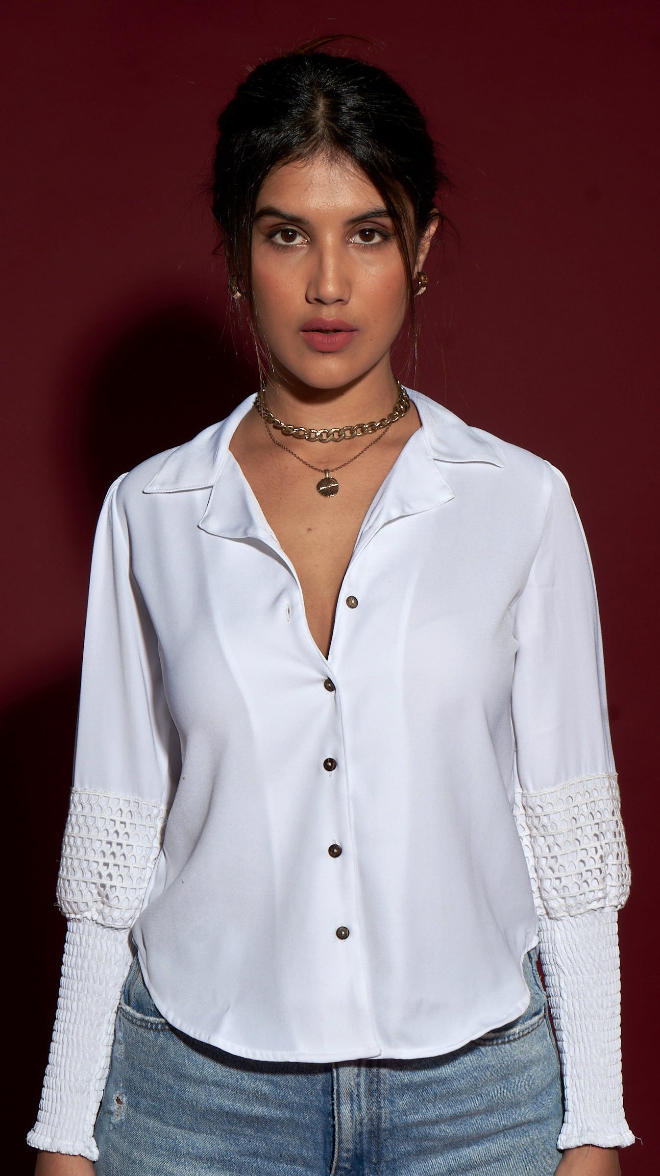 The smokey lace sleeves gives this classic white shirt, a modern touch. A comfortable fit with a collared V neckline & balloon sleeves, tapered down the elbow, elevating your go to look!