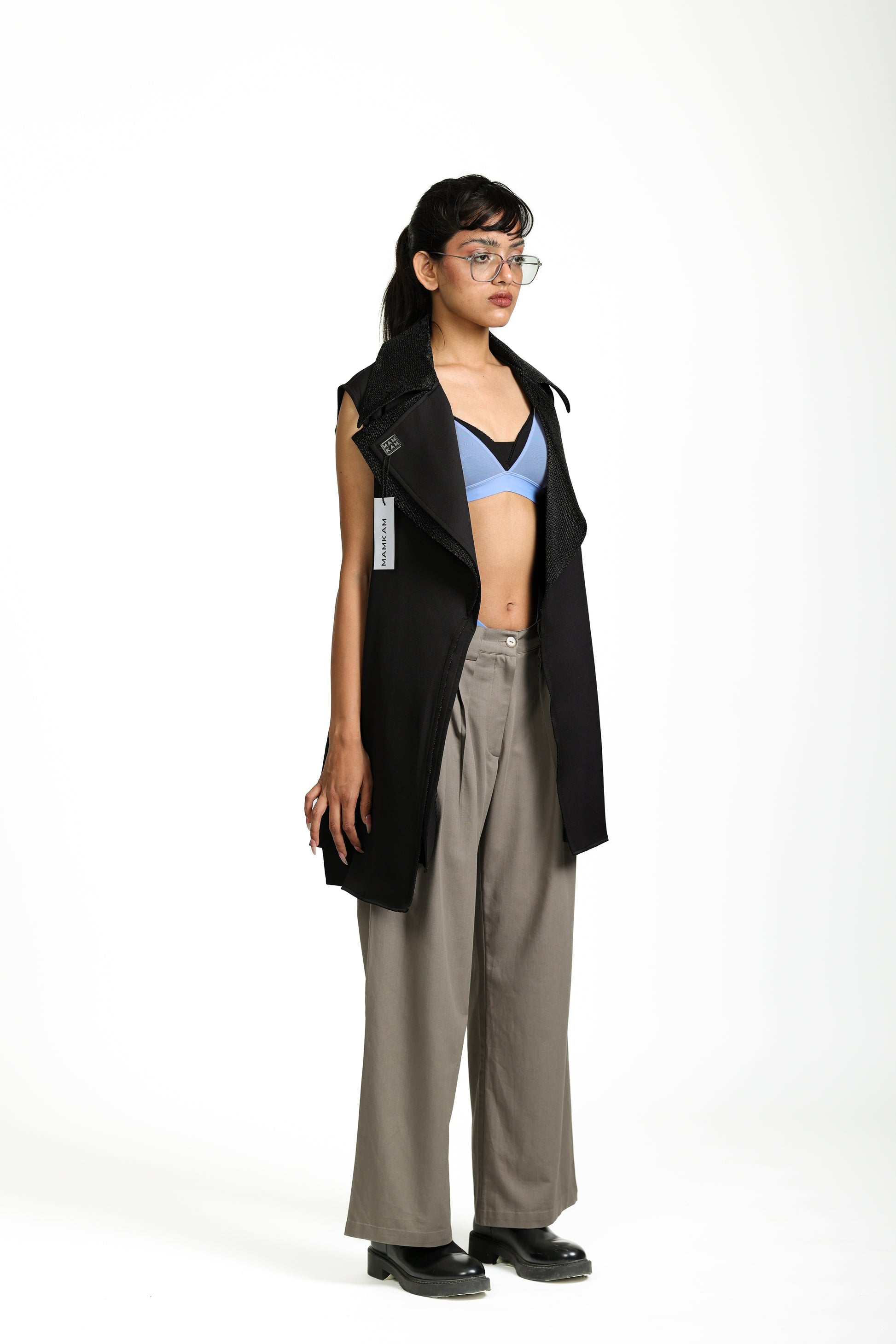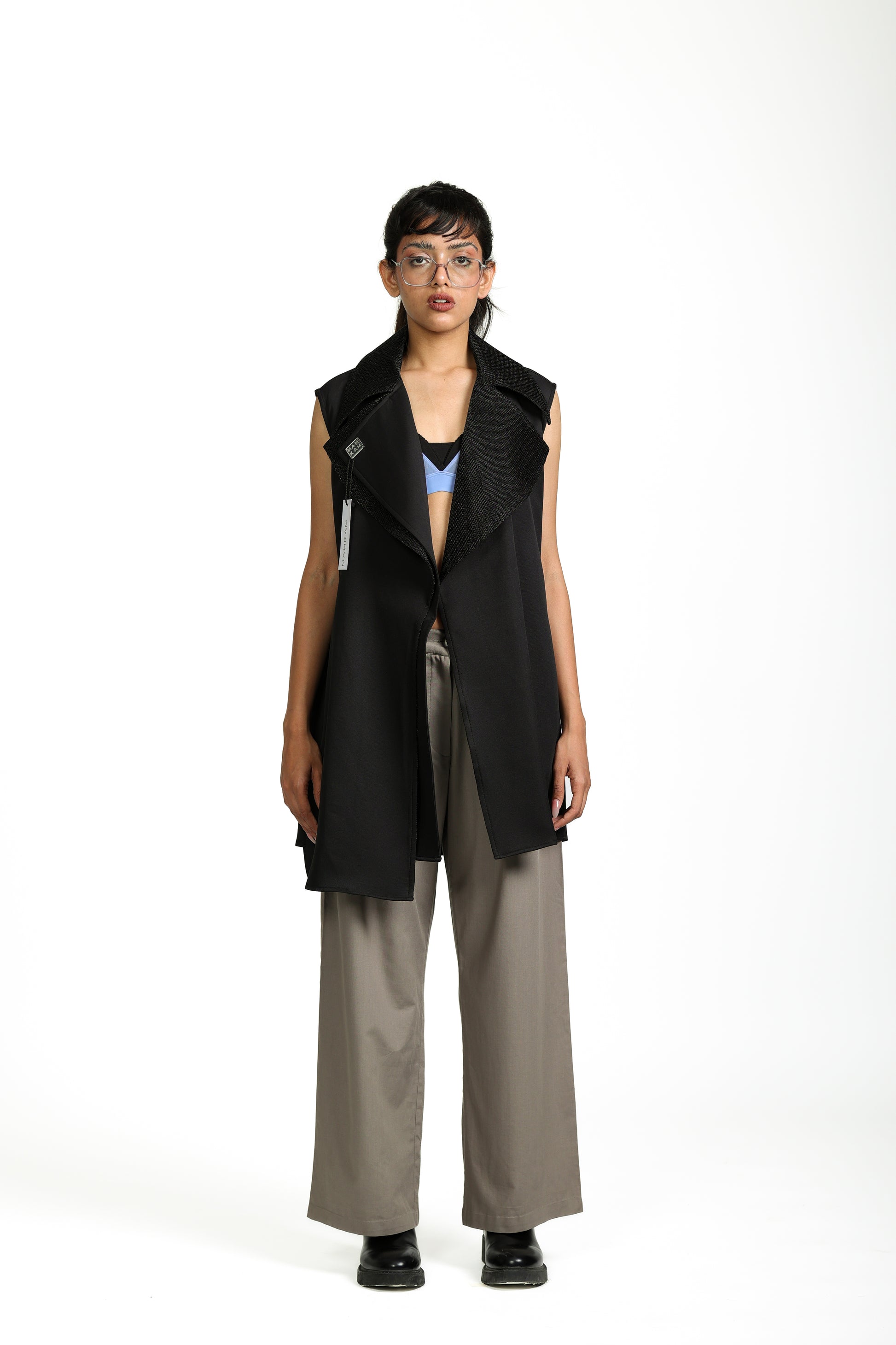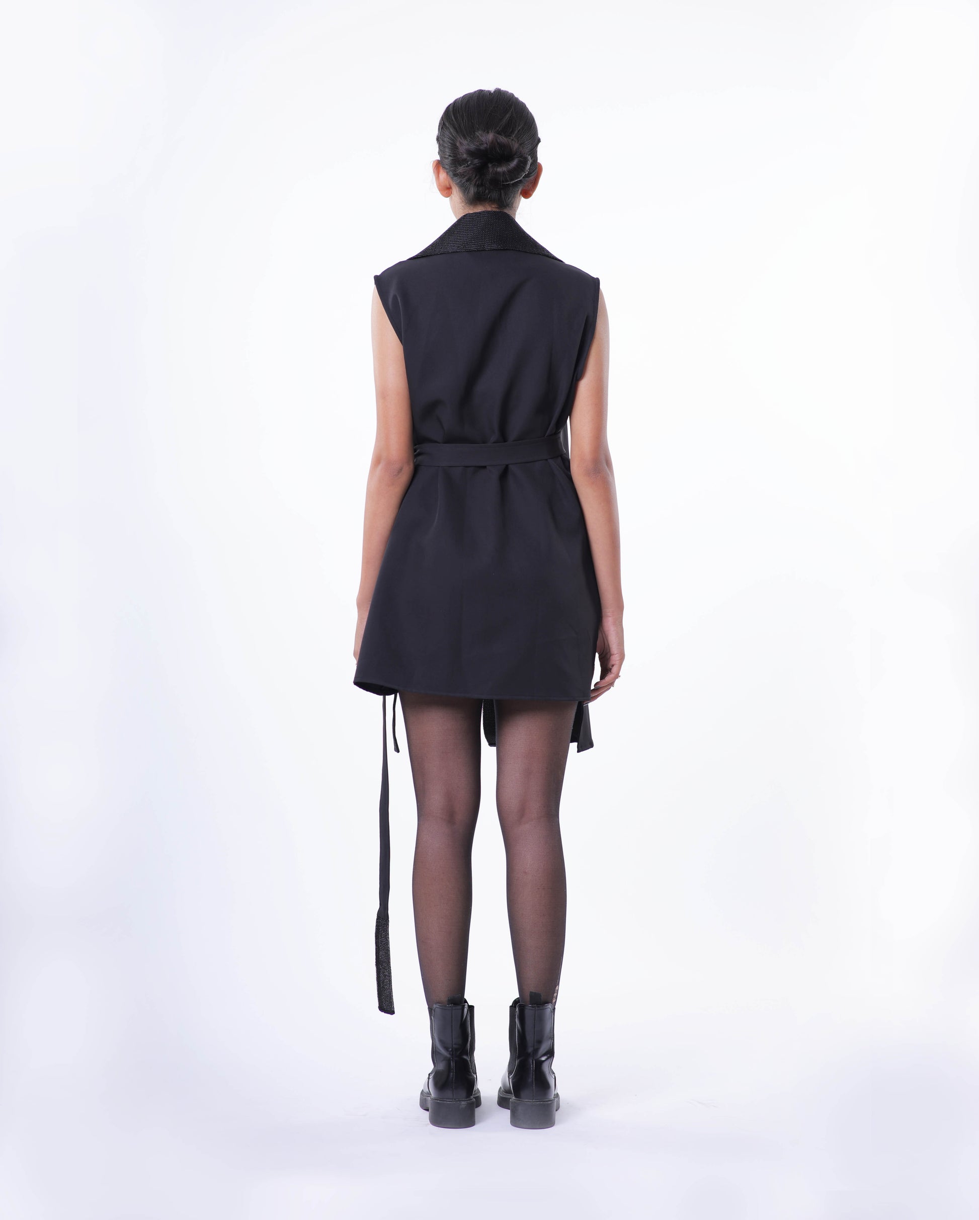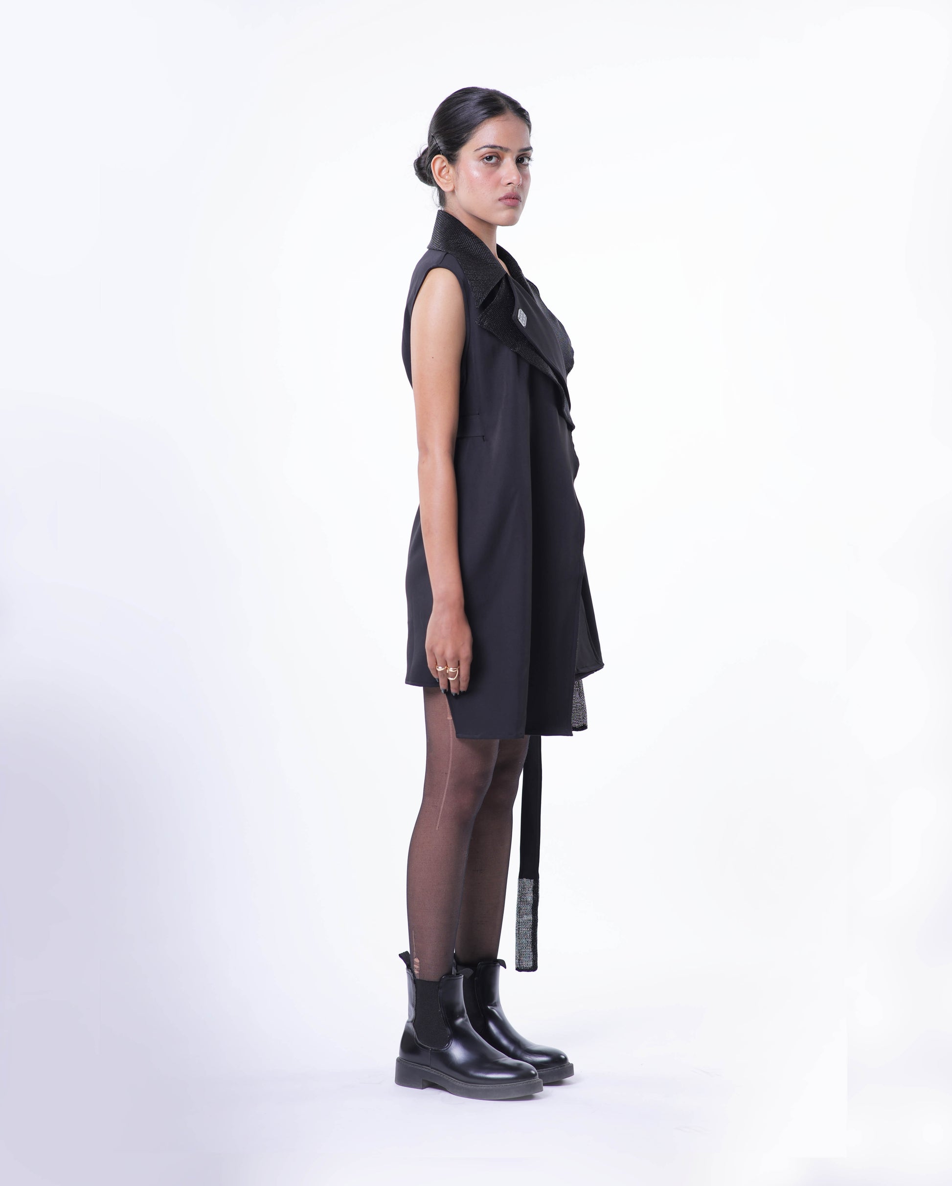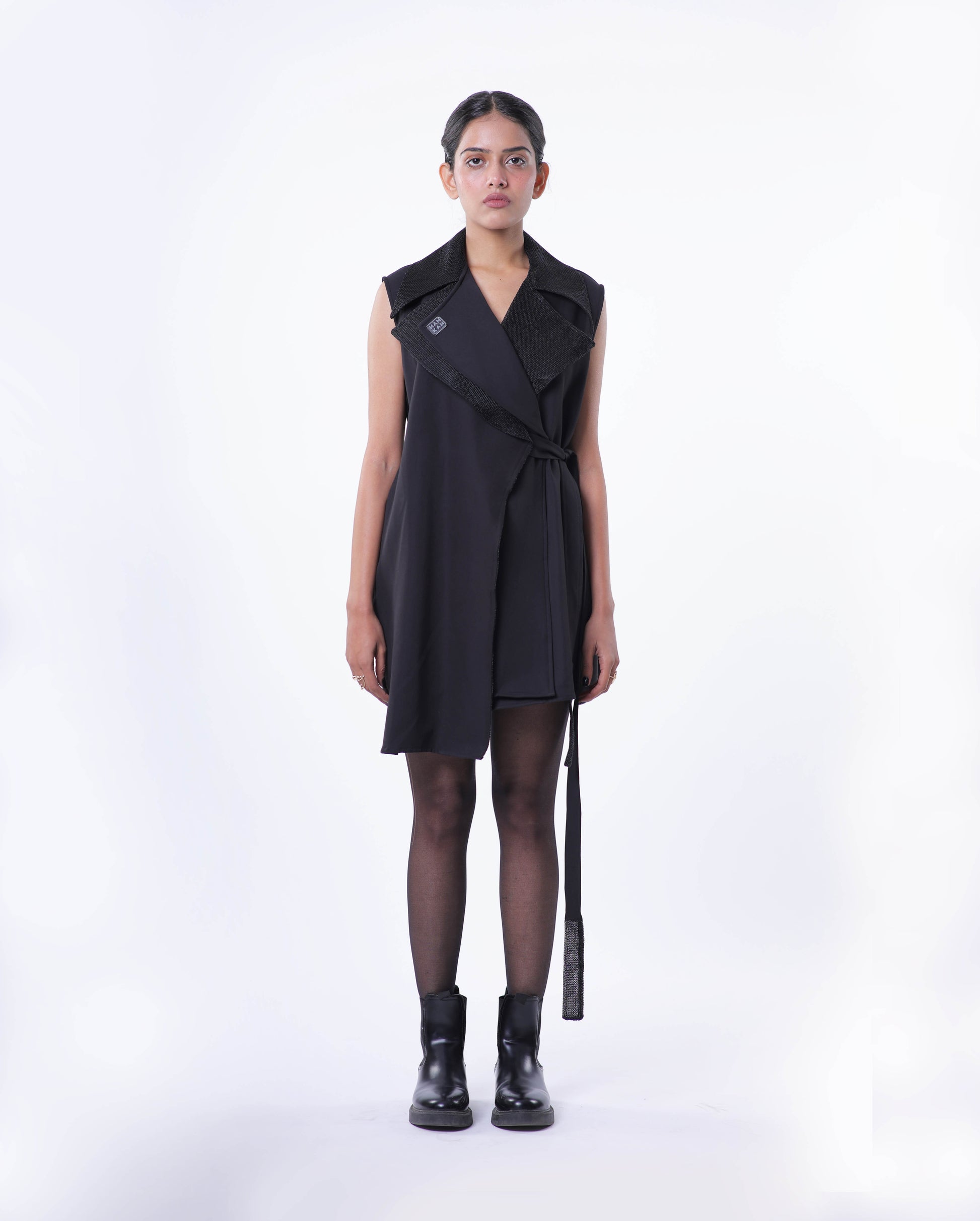 Wrap jacket dress, wear it as a jacket or a dress. With a metal mesh lapel detail and a belt for a touch of flair.